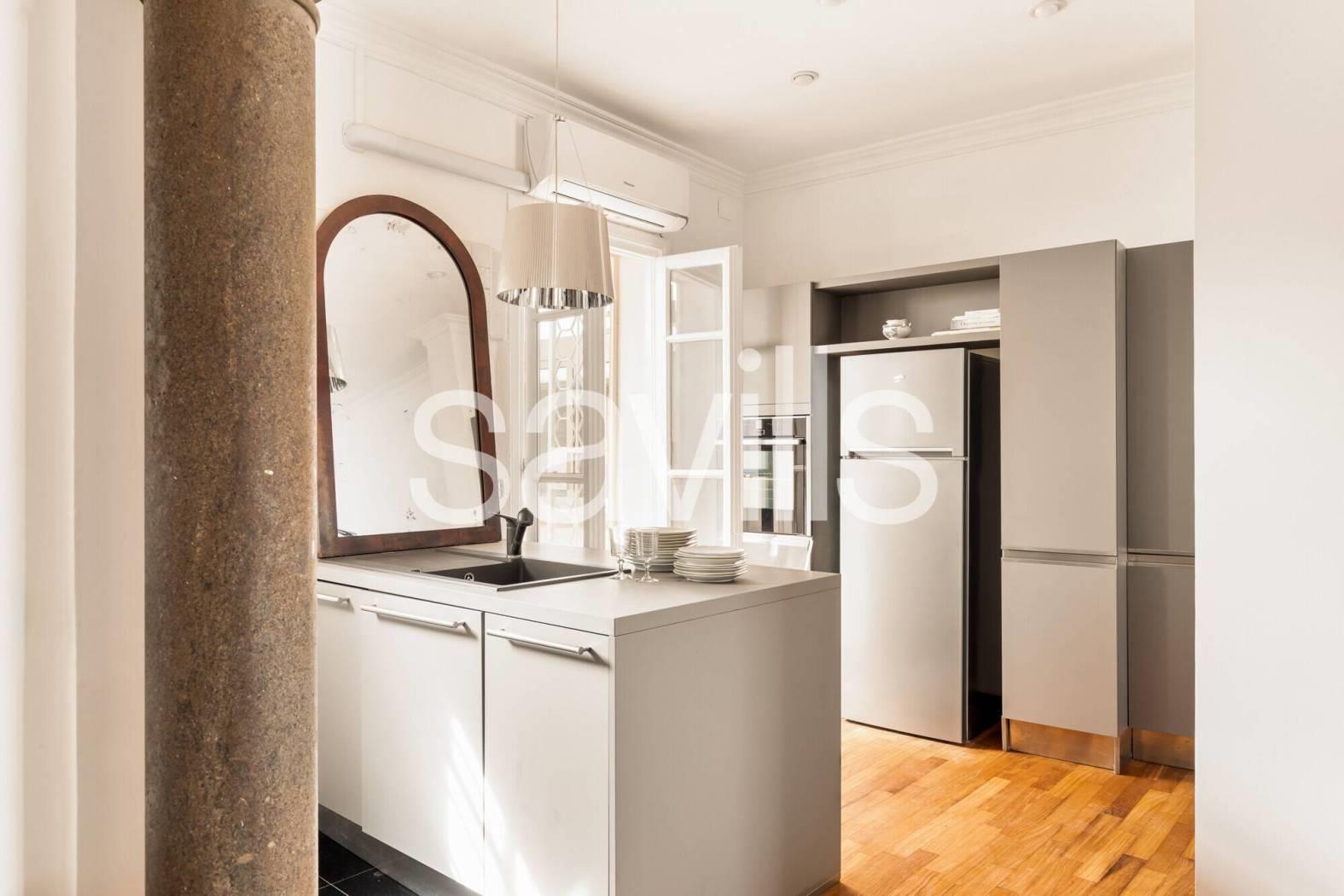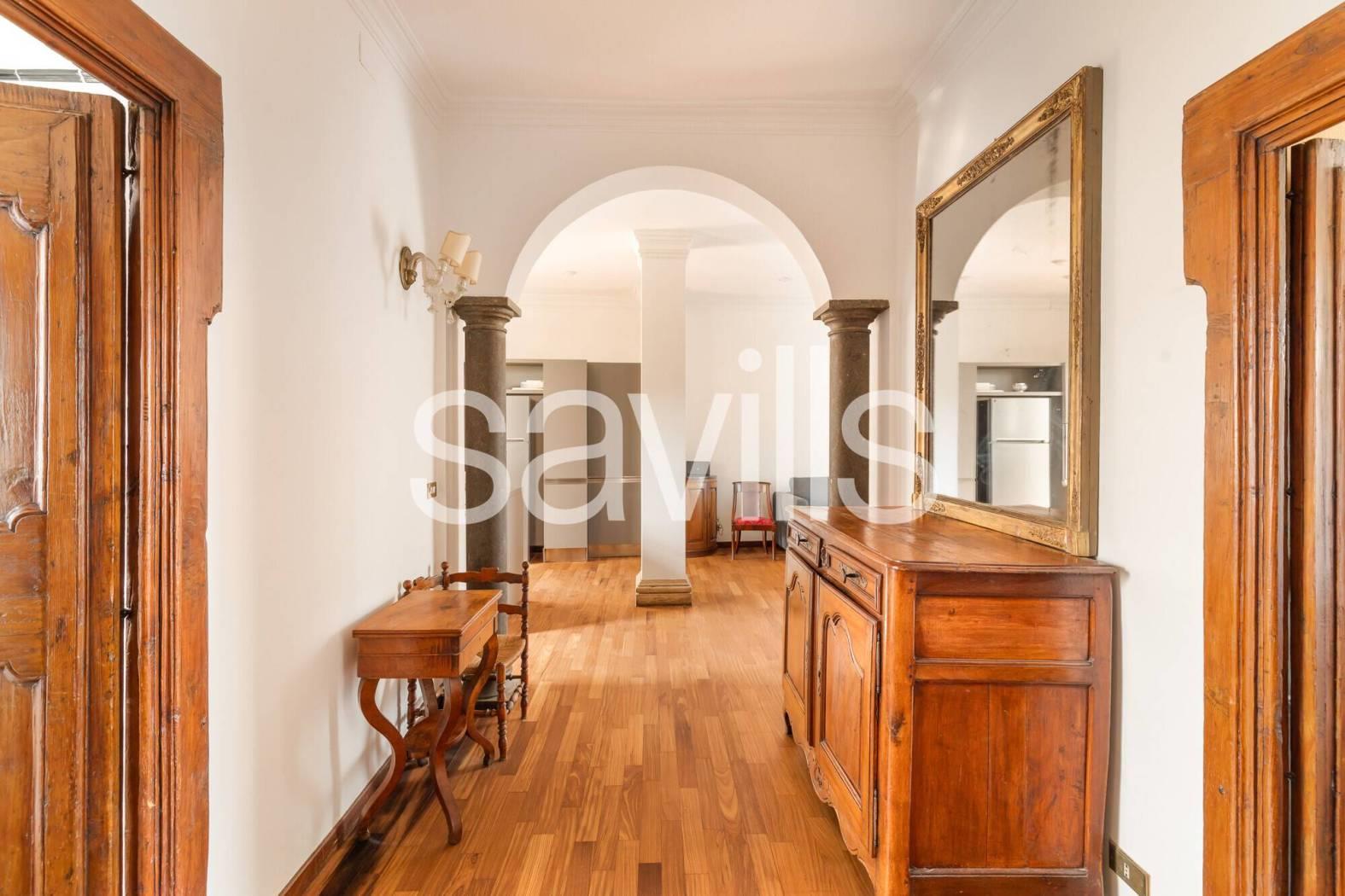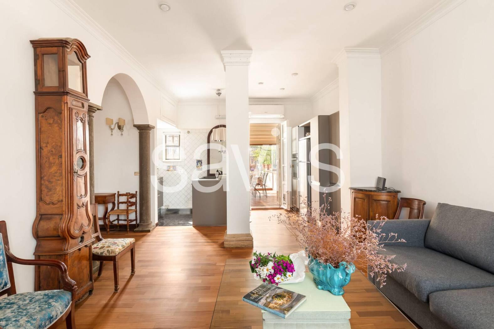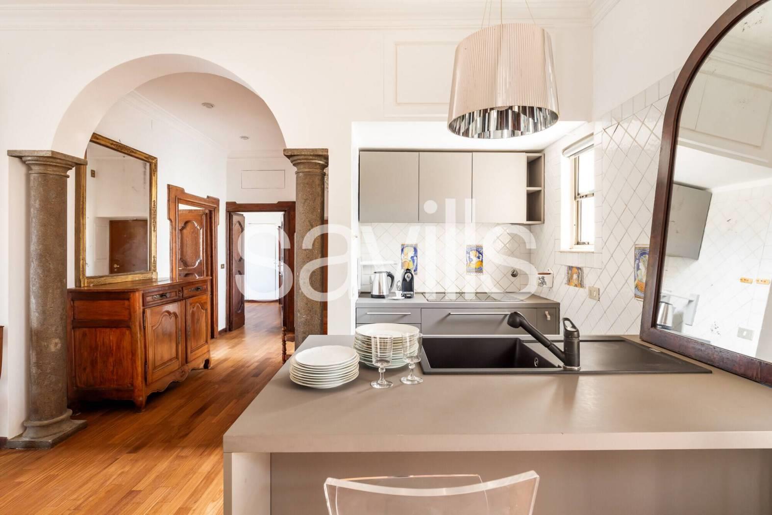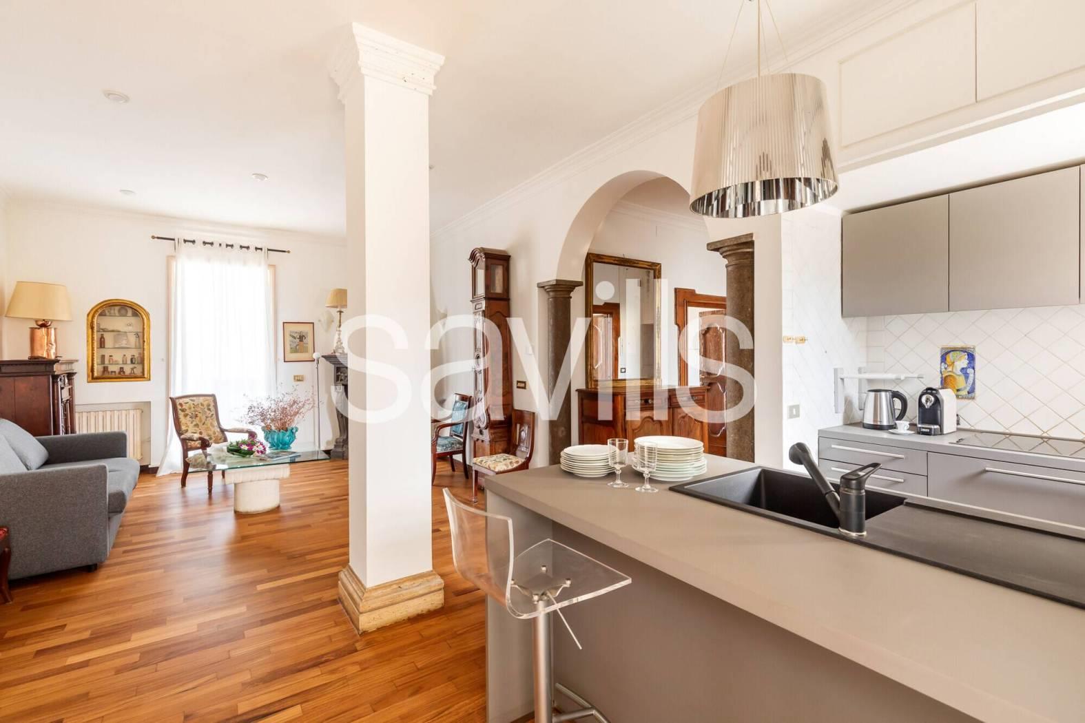 L’appartamento si apre su un ampio ingresso che conduce a un salone di rappresentanza con cucina a vista, uno spazio conviviale e accogliente impreziosito da affacci aperti su entrambi i lati. La proprietà è composta inoltre da due camere da letto matrimoniale, un bagno e ripostigli.
