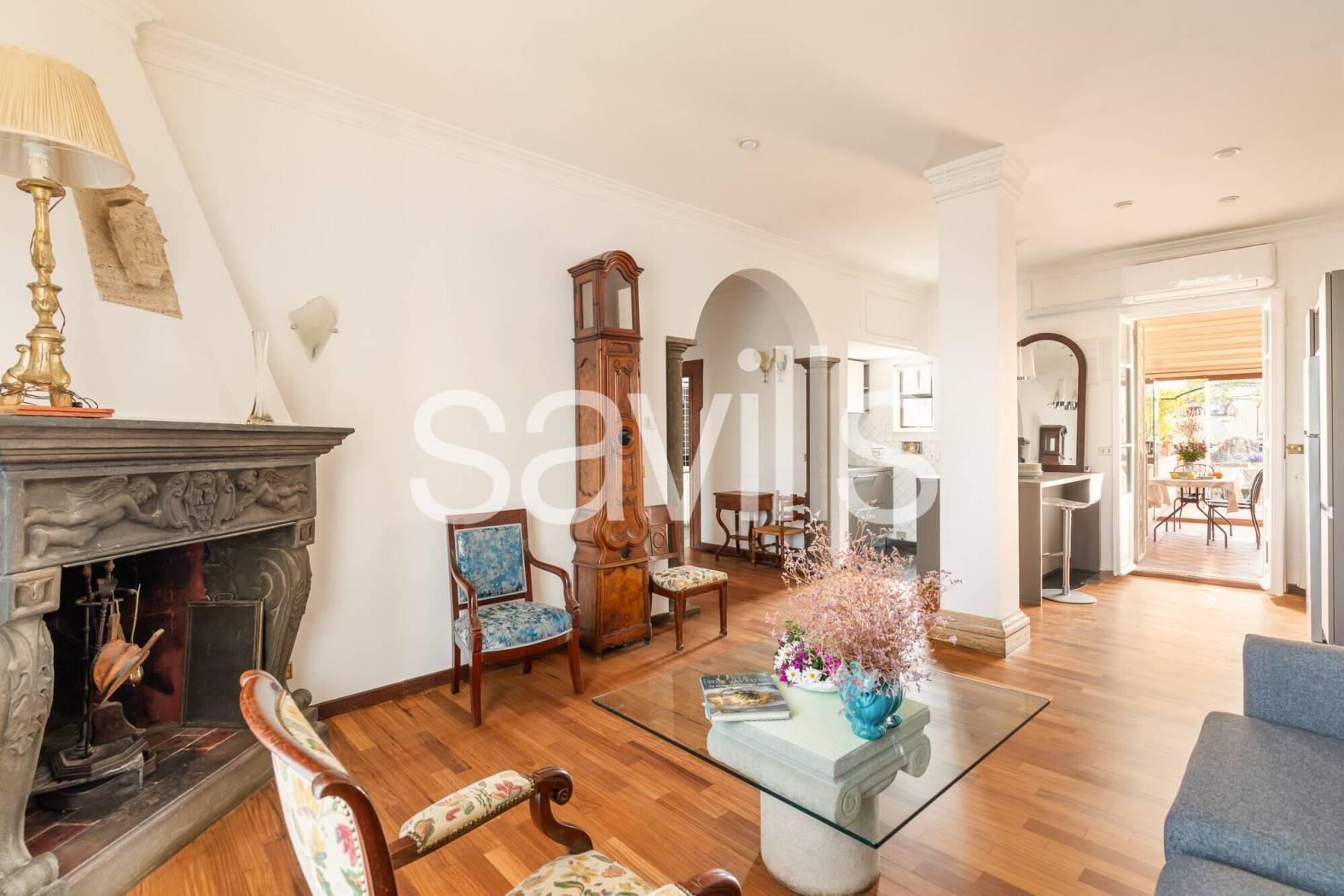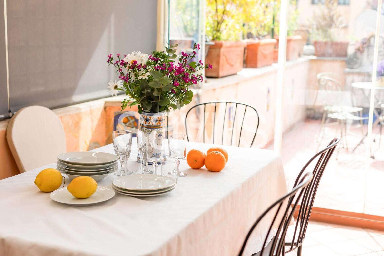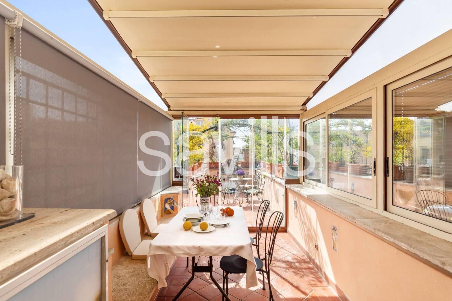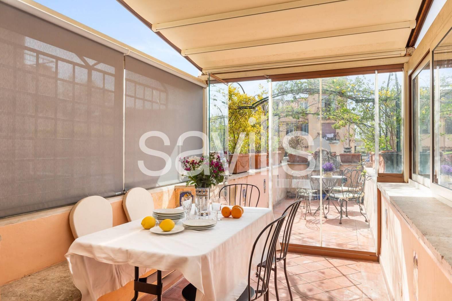 Elemento di assoluto pregio della proprietà è lo splendido terrazzo a livello, particolarmente suggestivo, con una vista aperta e affascinante sul Gianicolo, ideale per momenti di relax in un contesto unico.