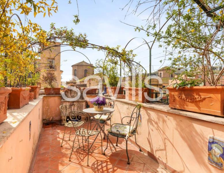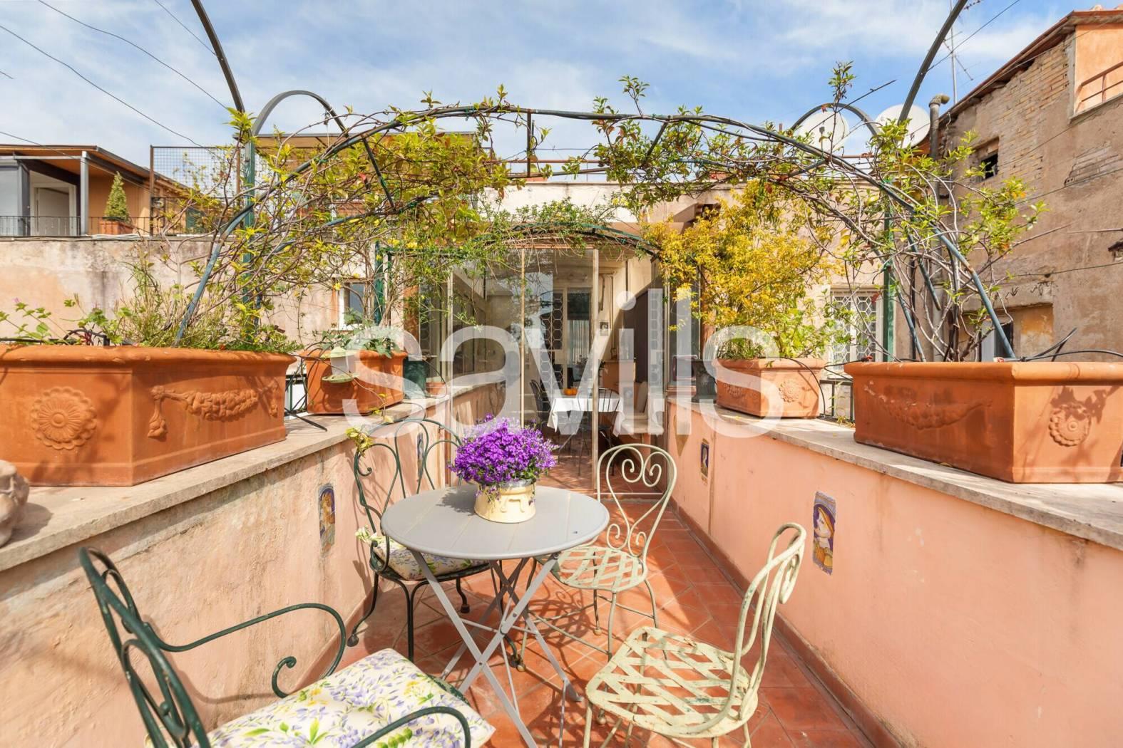 Questo attico panoramico e luminoso, situato al terzo piano di un edificio degli anni ’40 dotato di ascensore, si trova nel caratteristico quartiere Trastevere, a pochi passi dall’Orto Botanico e dal centro storico.