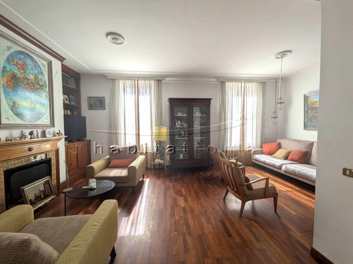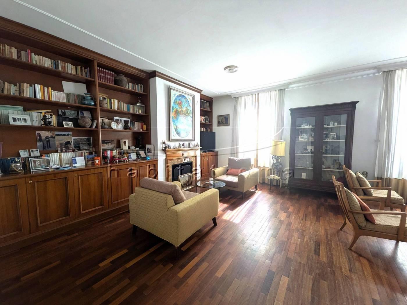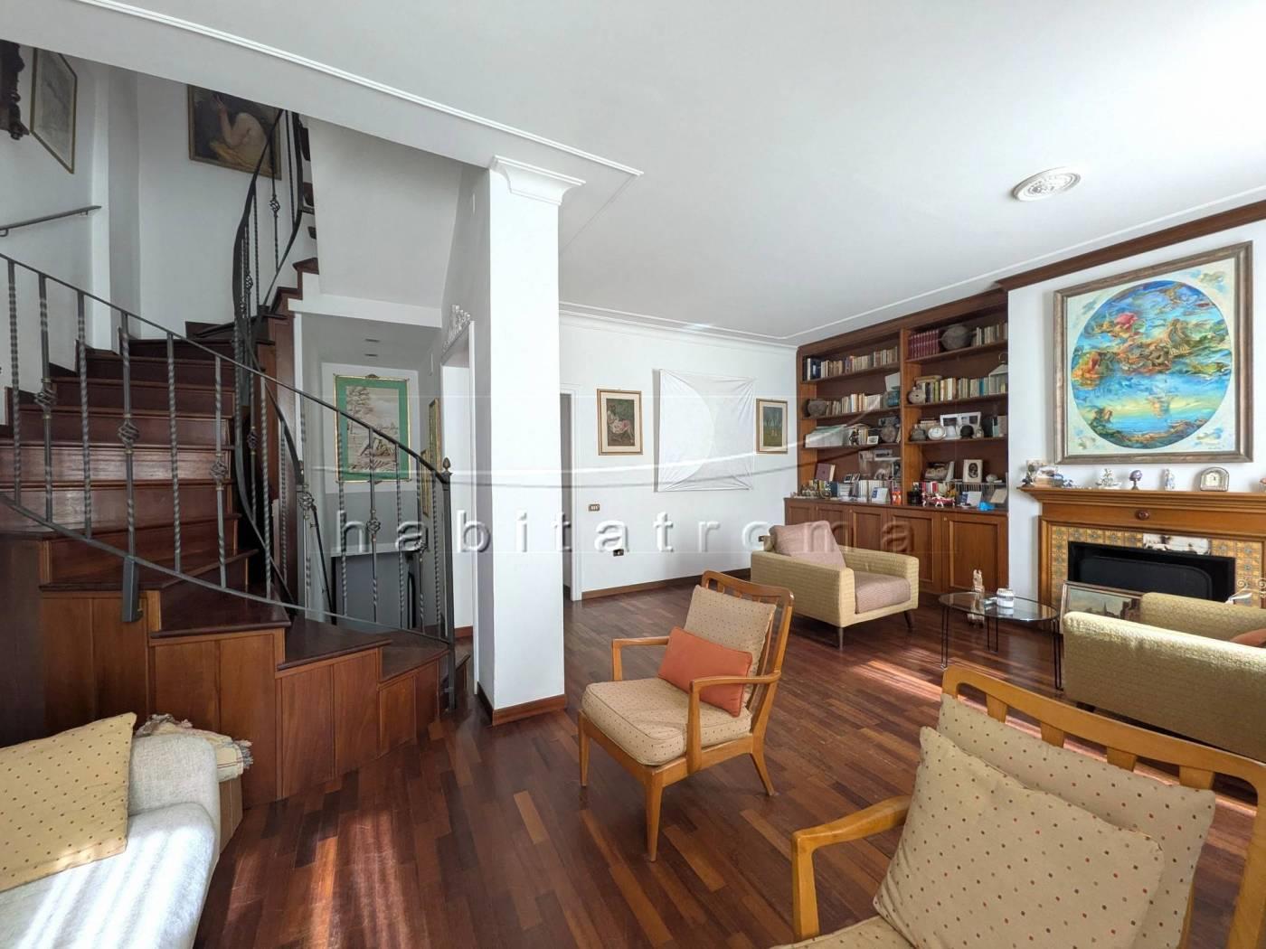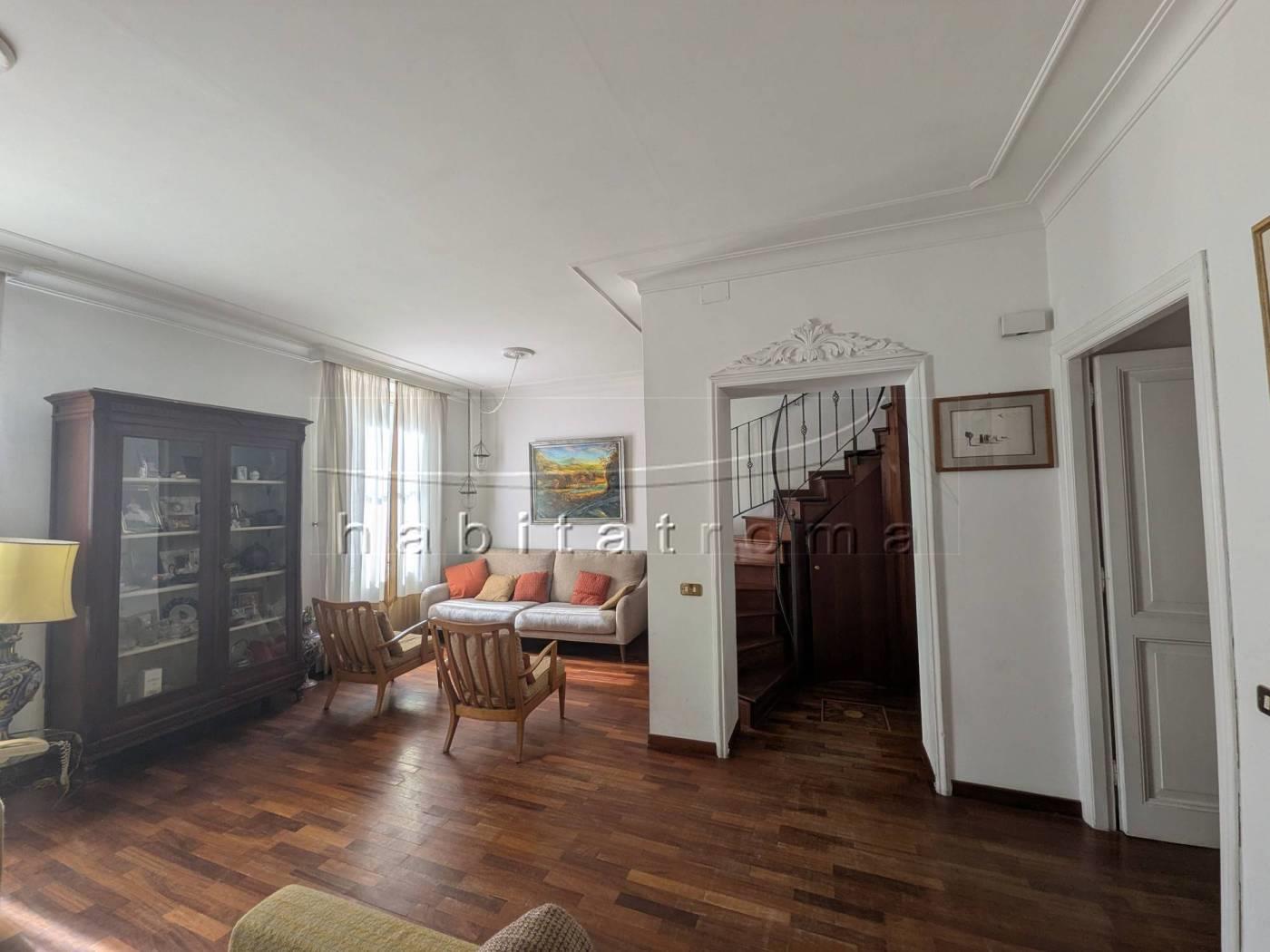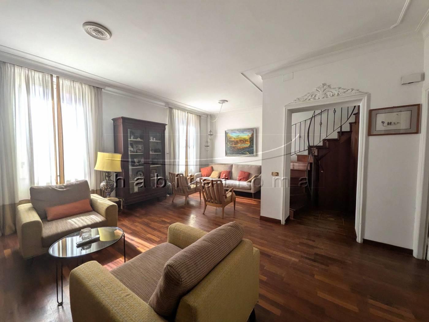 L’ingresso dell’abitazione si trova al primo piano ammezzato, che tramite una scala porta direttamente al piano secondo dello stabile nel quale troviamo il salone con camino, la zona notte composta da una comoda camera da letto con adiacente vano adibito ad armadiature/vestiaire; uno studio, utilizzabile anche come seconda camera da letto, e due bagni.
