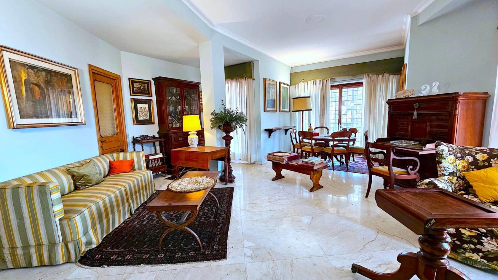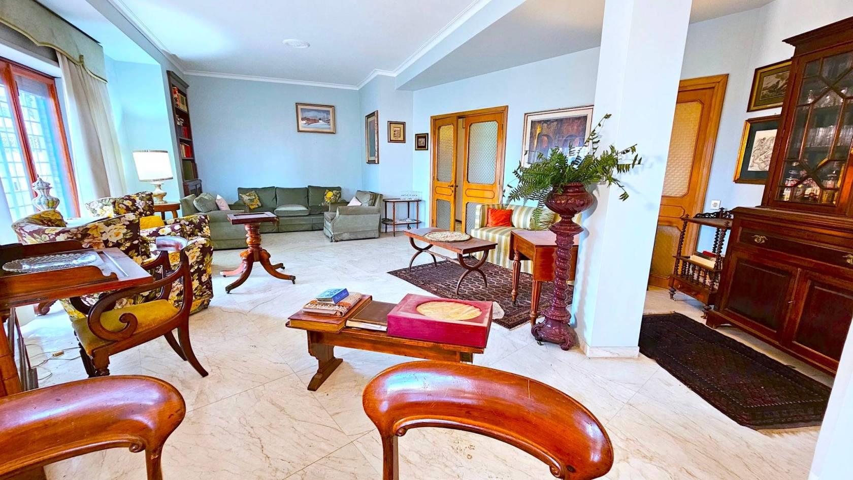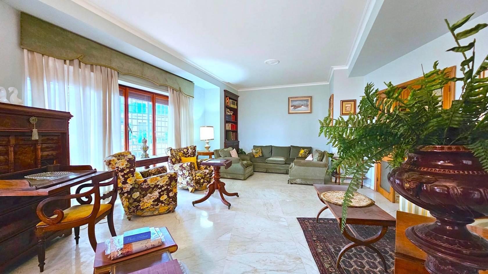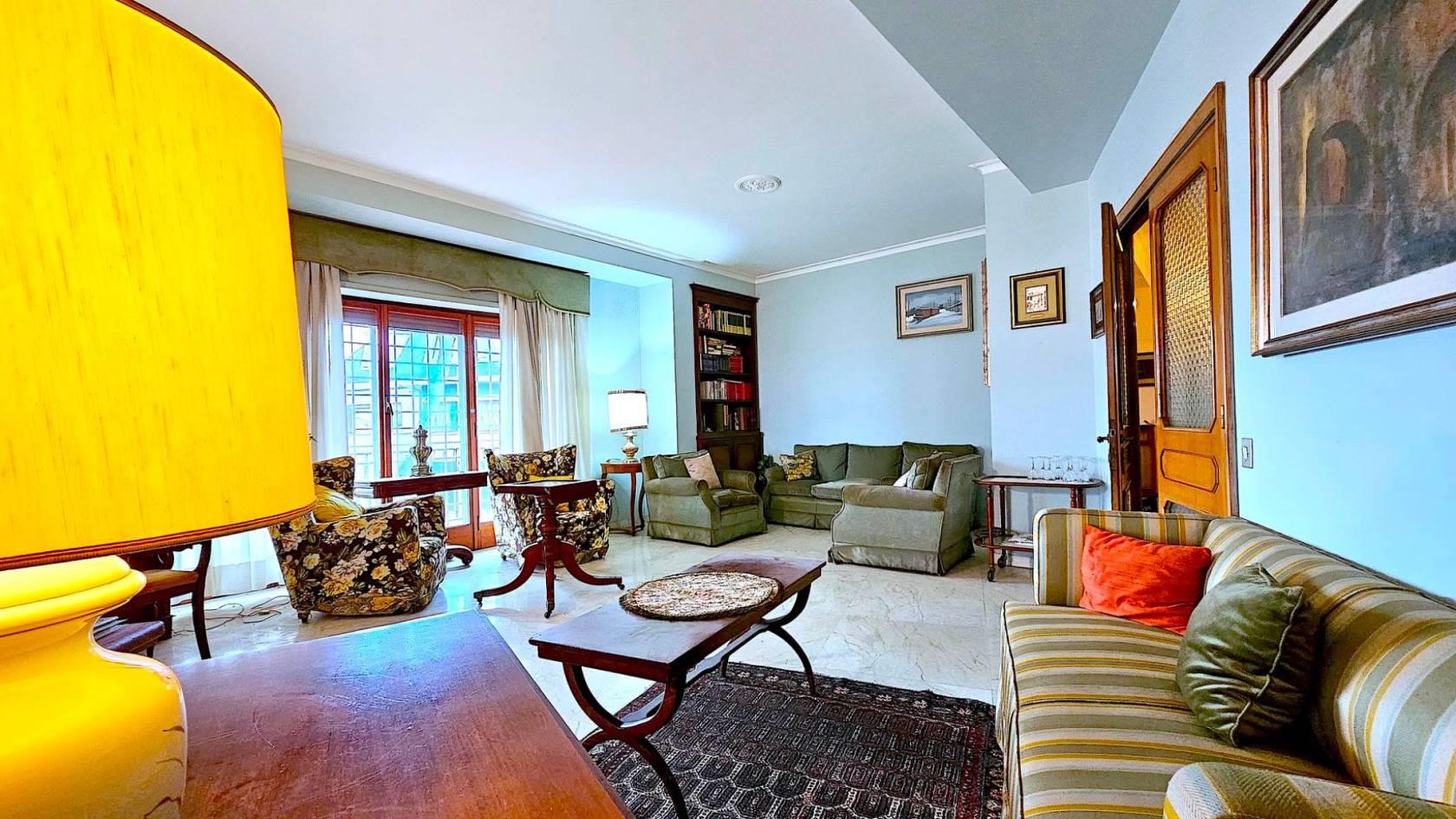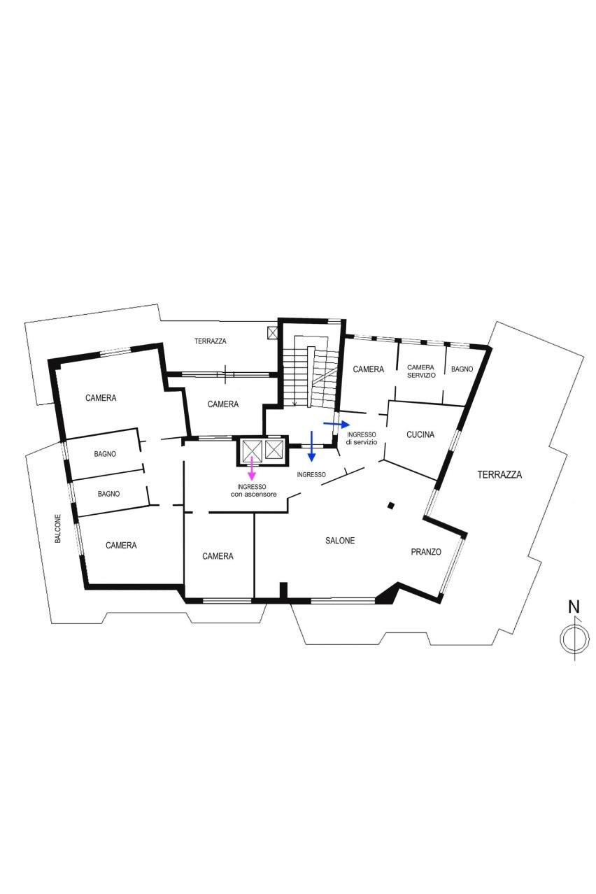 La disposizione interna attualmente prevede: una zona ingresso, con l’accesso all’ascensore, portone principale e porta di servizio, salone triplo con accesso diretto alla grande terrazza, ideale per ricevere ospiti e trascorrere momenti di convivialità, quattro comode camere da letto, due bagni, una camera di servizio con bagno privato, la cucina abitabile e funzionale, una zona dispensa e lavanderia e due terrazze-balconi angolari completano la dotazione degli spazi esterni.