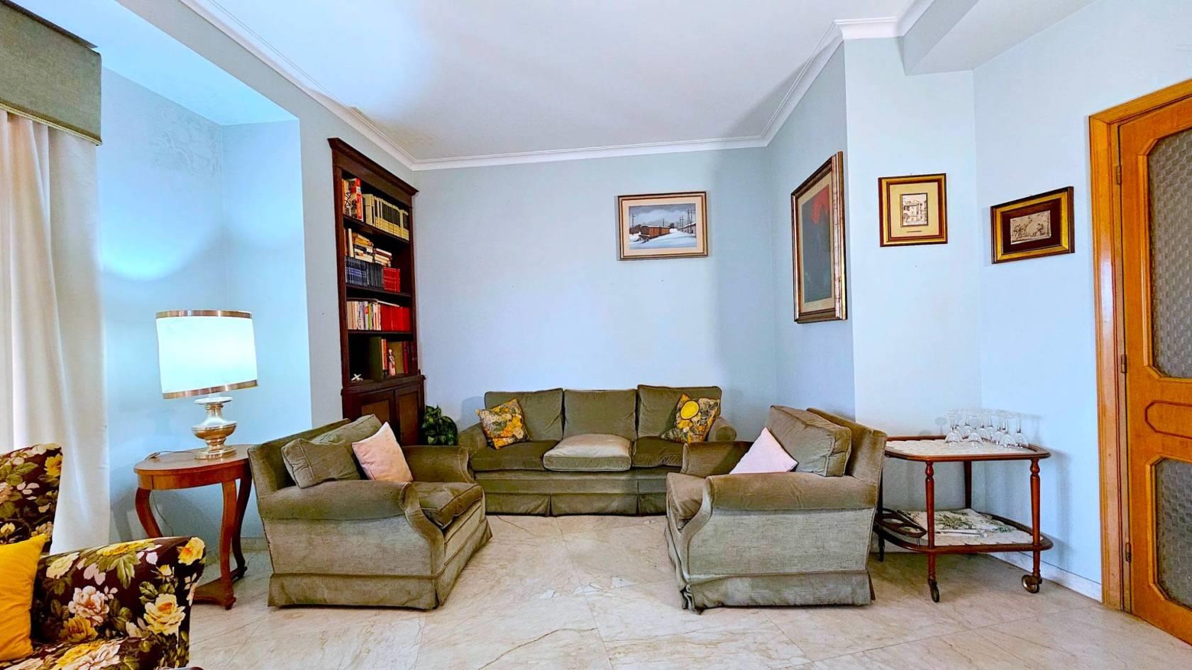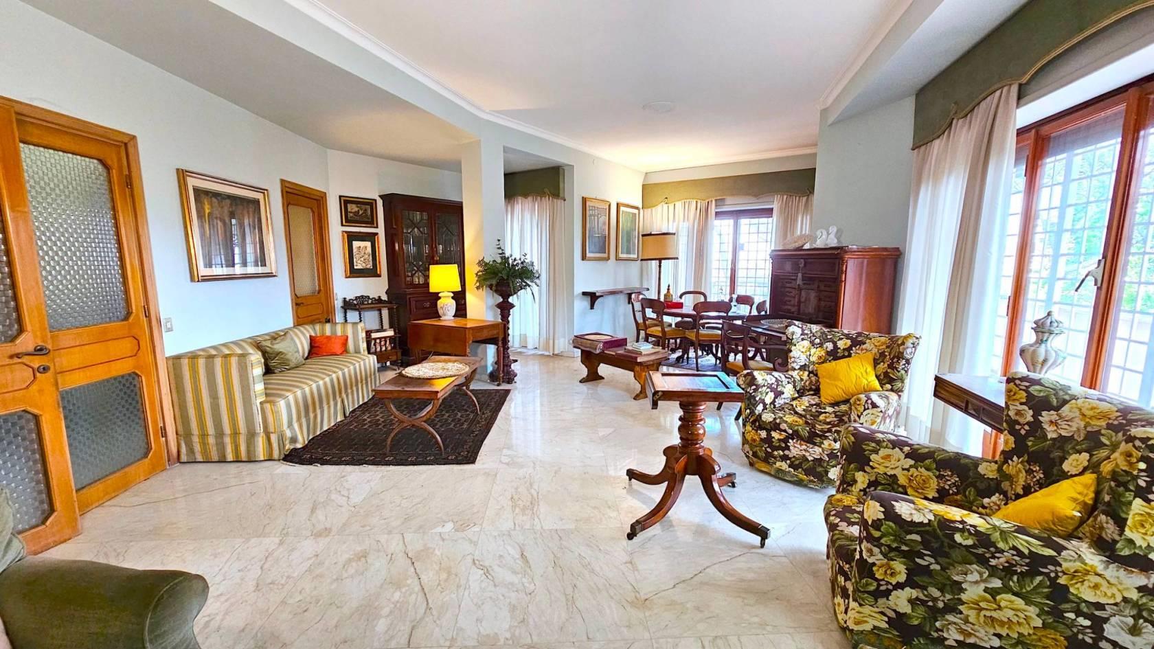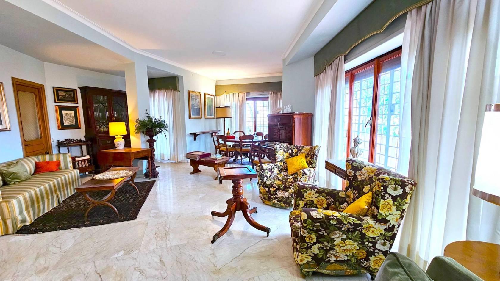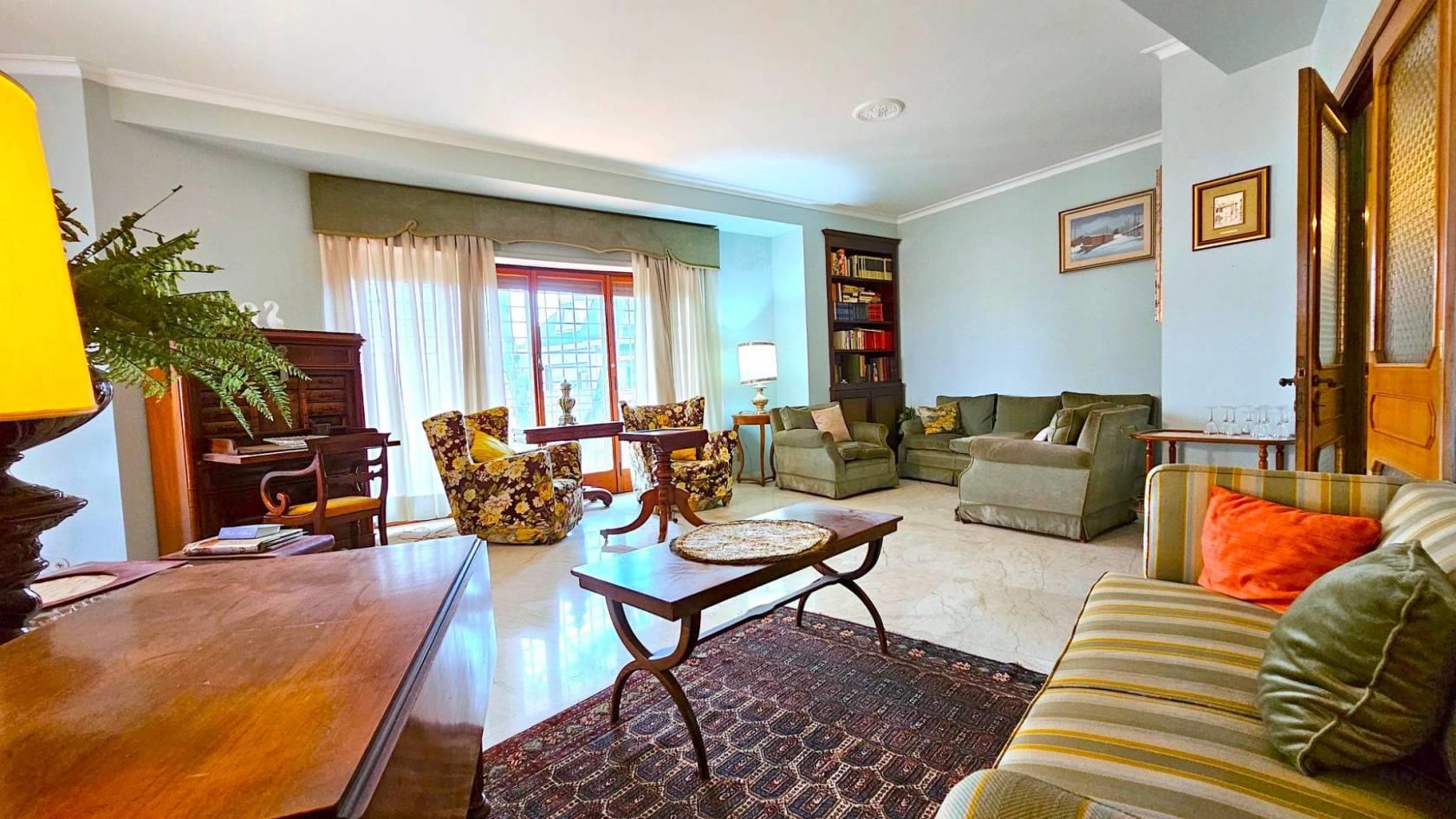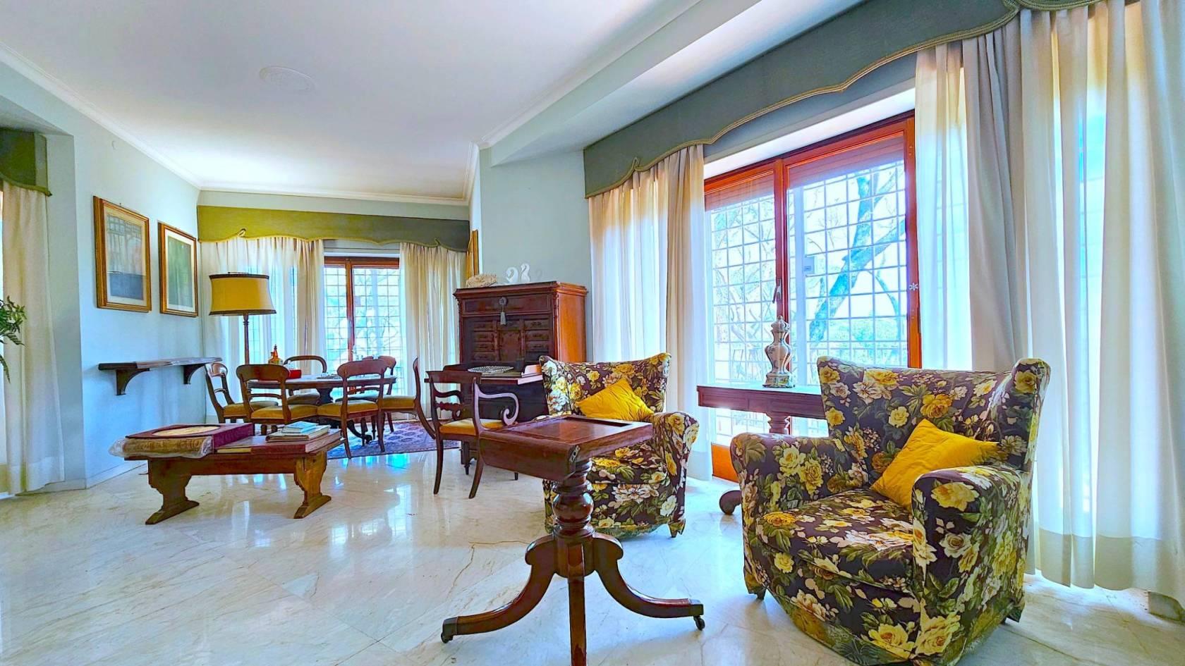 La disposizione interna attualmente prevede: una zona ingresso, con l’accesso all’ascensore, portone principale e porta di servizio, salone triplo con accesso diretto alla grande terrazza, ideale per ricevere ospiti e trascorrere momenti di convivialità, quattro comode camere da letto, due bagni, una camera di servizio con bagno privato, la cucina abitabile e funzionale, una zona dispensa e lavanderia e due terrazze-balconi angolari completano la dotazione degli spazi esterni.