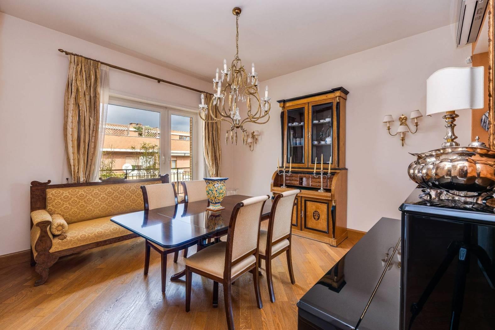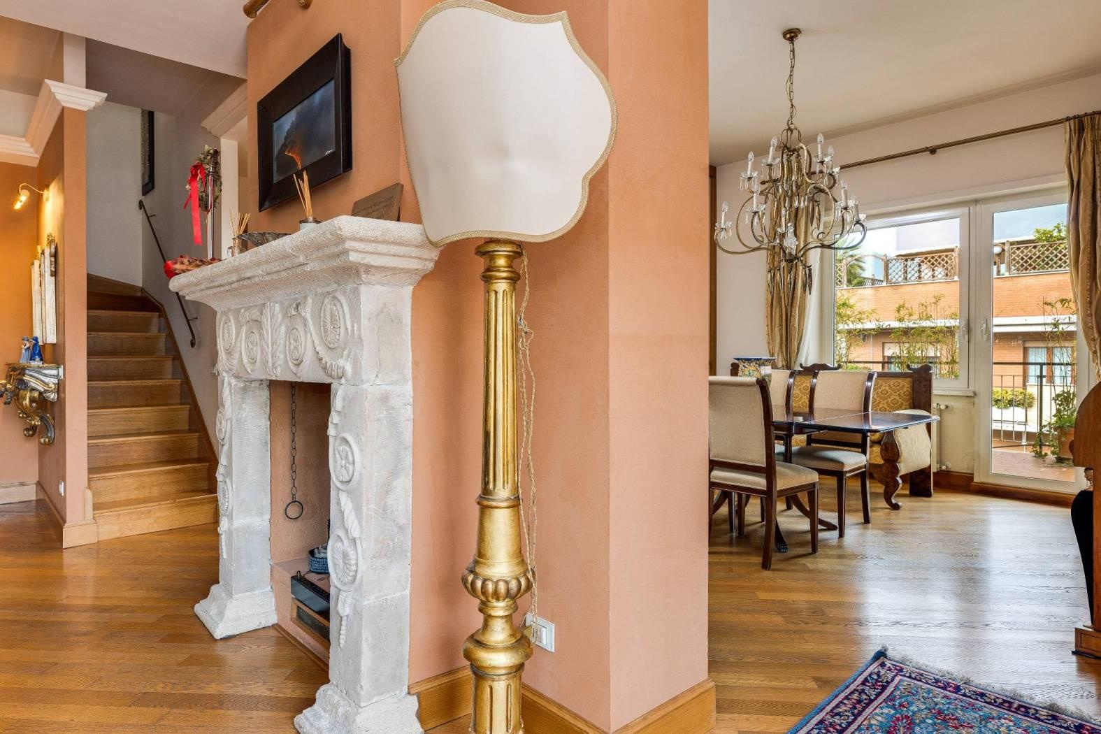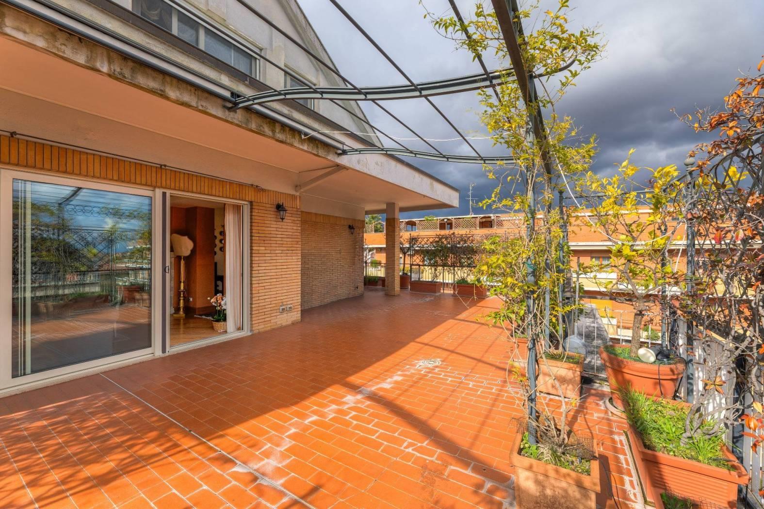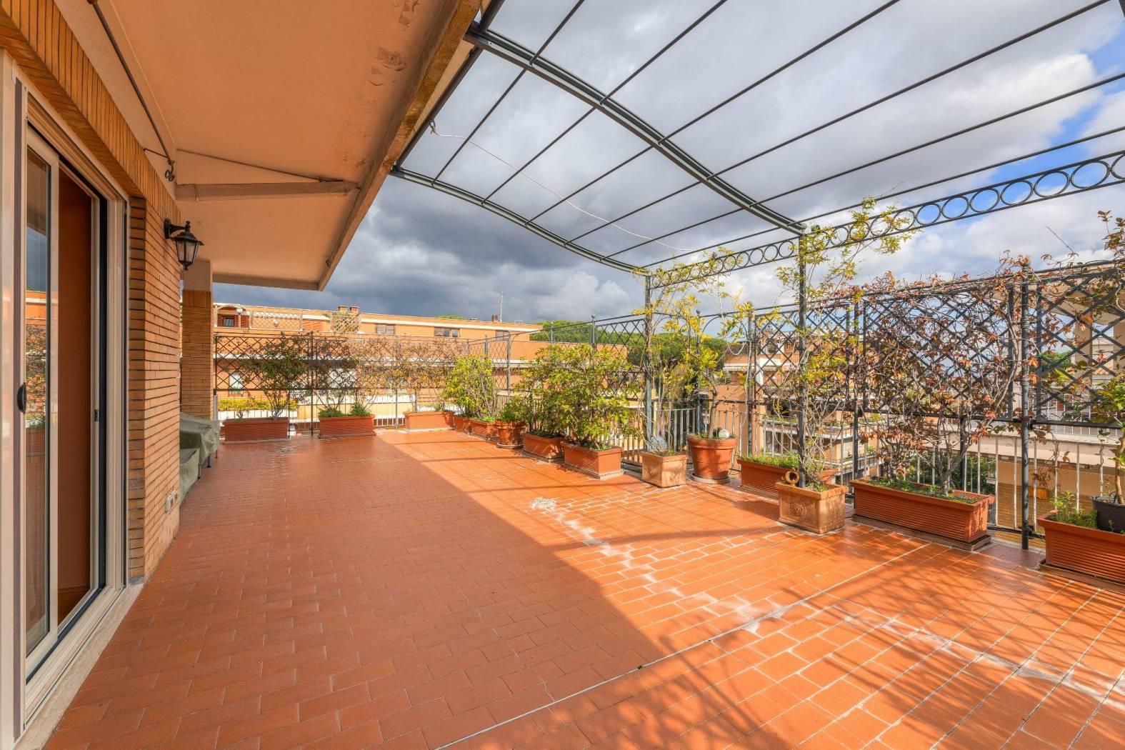 Nel cuore di una delle aree più riservate e ambite del quartiere Aurelio, in Via Enrico Besta, proponiamo in vendita un prestigioso attico e superattico di rappresentanza, inserito in una signorile palazzina in cortina, ai piani quarto e quinto. La proprietà si estende su una superficie di circa 247 mq, offrendo ambienti ampi, eleganti e perfettamente distribuiti, pensati per chi desidera un’abitazione di alto profilo, dove comfort e stile si incontrano. Il quarto piano accoglie con un doppio ingresso che conduce a un importante soggiorno di rappresentanza, impreziosito da un raffinato camino con cornice originale in marmo bianco di Ragusa del ’700, vera opera d’arte che conferisce unicità e carattere all’ambiente. Seguono una luminosa sala da pranzo, due camere da letto, due bagni, una grande cucina abitabile con zona lavanderia e balcone, oltre a un comodo ripostiglio. Dal soggiorno si accede a uno splendido terrazzo vivibile, elegantemente attrezzato con tende parasole, ideale per ricevimenti, cene all’aperto e momenti di assoluto relax. Le camere da letto godono entrambe di accesso agli spazi esterni. Il quinto piano, collegato da una comoda scala interna, ospita un’ampia zona disimpegno con area studio, due ulteriori camere da letto, due bagni di cui uno en suite con vasca idromassaggio – un locale tecnico, un grande ripostiglio e un balcone riservato. Grazie alla distribuzione degli spazi, il piano superiore si presta anche a un eventuale frazionamento rispetto al resto della proprietà, rappresentando una soluzione ideale per chi desideri creare un’unità indipendente, uno spazio per ospiti o uno studio professionale. L’immobile è rifinito con materiali di altissimo livello: parquet in tutti gli ambienti, armadi realizzati su misura, infissi di nuova generazione, serrande elettriche e zanzariere. Il comfort è garantito da riscaldamento autonomo e aria condizionata. La tripla esposizione e gli ampi terrazzi, che abbracciano l’abitazione, regalano una straordinaria luminosità naturale, valorizzando ogni ambiente e creando una continuità perfetta tra interno ed esterno; i terrazzi saranno inoltre oggetto di completa ristrutturazione a cura e spese della proprietà. La posizione, in una via privata e silenziosa, rappresenta un perfetto equilibrio tra riservatezza e comodità: a pochi passi si trovano collegamenti, fermate metro e tutti i principali servizi. La vicinanza con strutture di eccellenza come il Policlinico Gemelli e l’IDI rende questa soluzione ideale anche per professionisti e dirigenti. Una residenza esclusiva, pensata per chi ricerca spazio, eleganza e qualità assoluta, in uno dei contesti più apprezzati della zona. Per info contattare il numero 06.32.65.06.95 / 331.77.90.963.