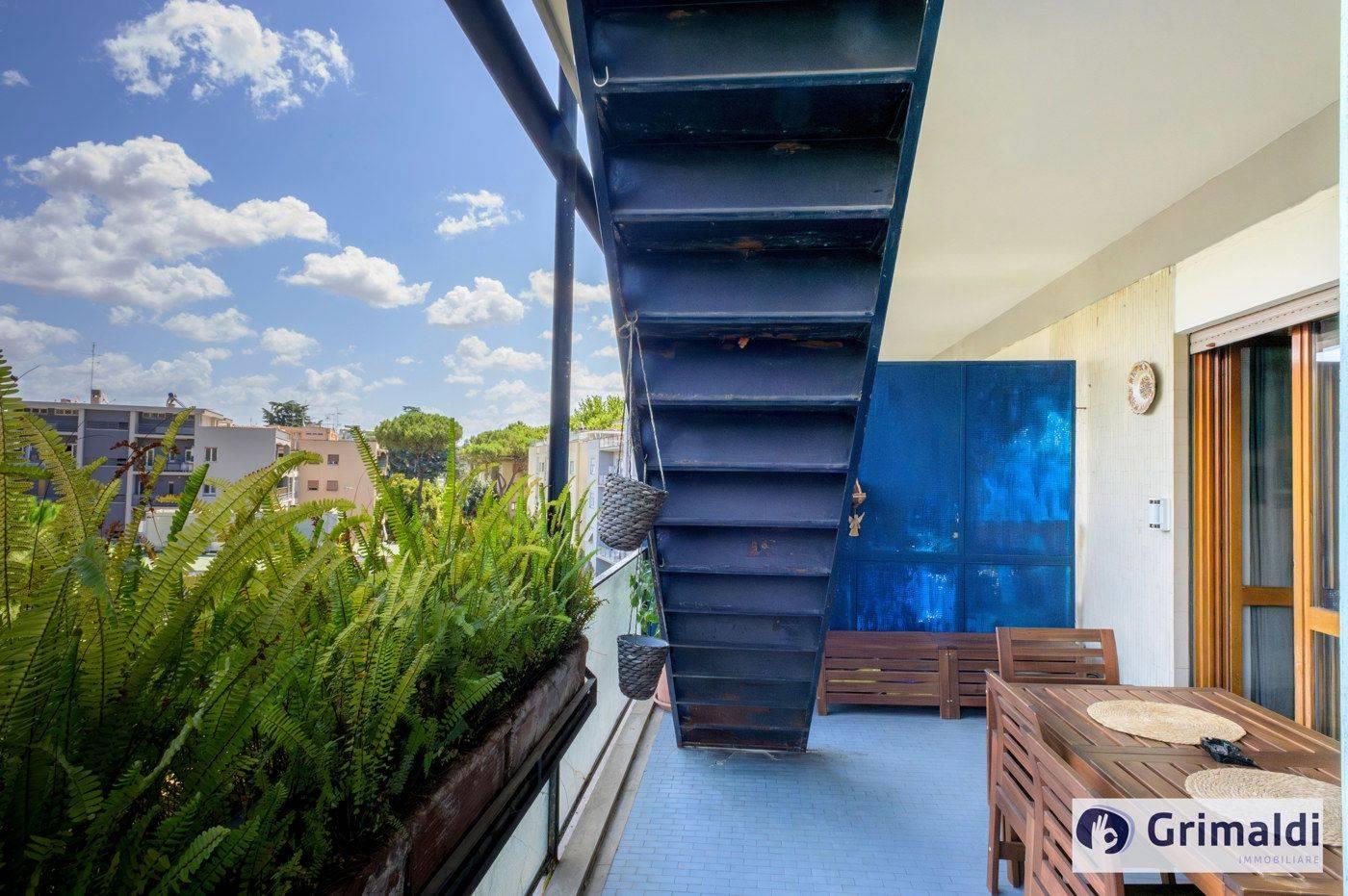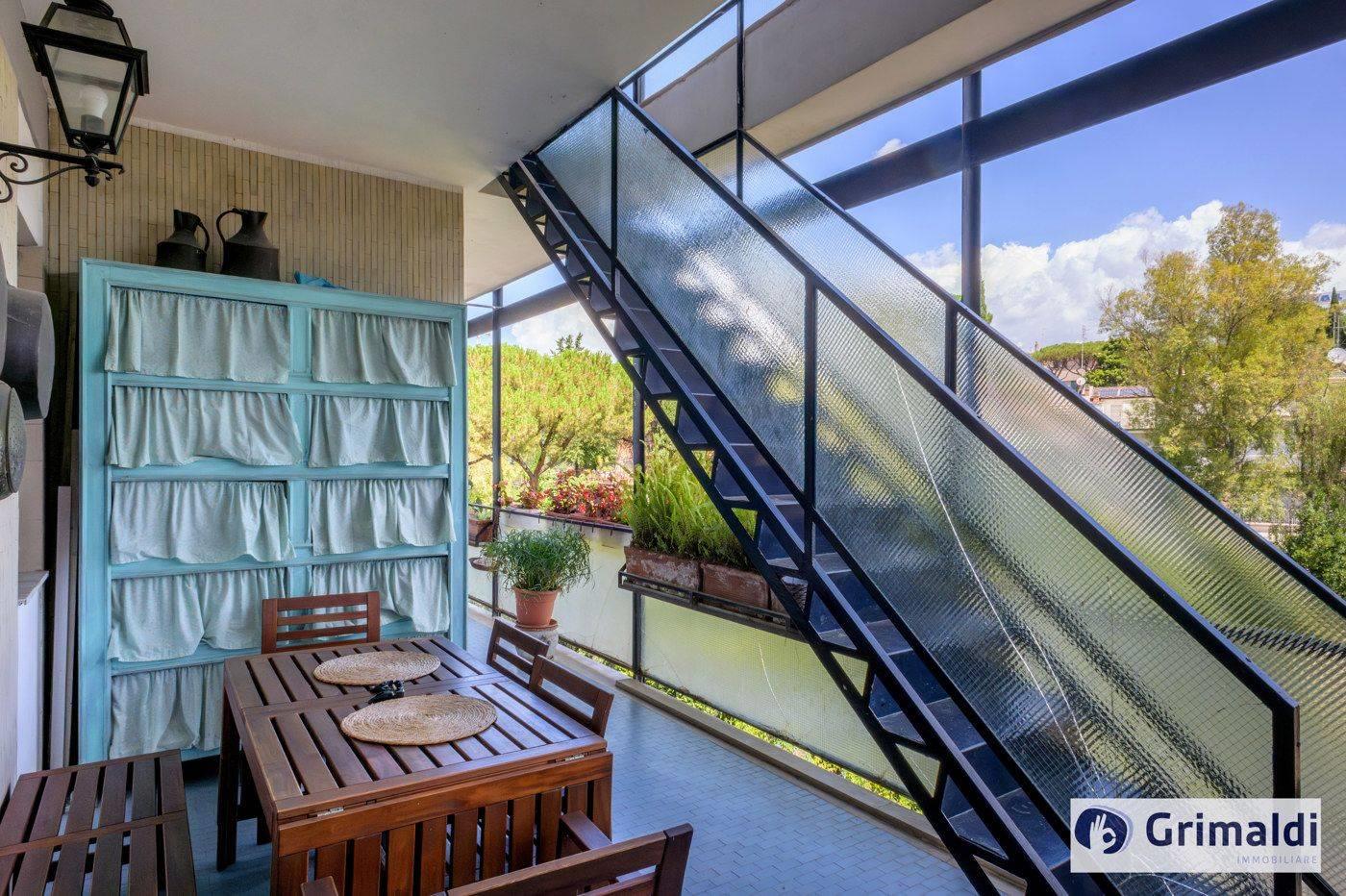 Il piano attico è dotato di doppio accesso ed è composto da grande salone a vista con zona pranzo ed ampie finestre che affacciano direttamente sul terrazzo, disimpegno per la cucina con affaccio sul balcone, comodo studio con balcone e bagno privato finestrato e servito dal secondo accesso della casa; l’altro disimpegno ci accompagna nella zona notte del piano, composta da due ampie camere da letto, entrambe con affaccio sui terrazzi, altro bagno finestrato con doccia. La comoda scala interna lineare, rivestita in pregiato legno, conduce alla zona notte del piano superiore, che ospita un soggiorno, due camere da letto con terrazzo perimetrale di mq. 155 ca e un bagno finestrato con doccia. I terrazzi dei due piani risultano collegati ed accessibili anche dalla scala lineare esterna in ferro.