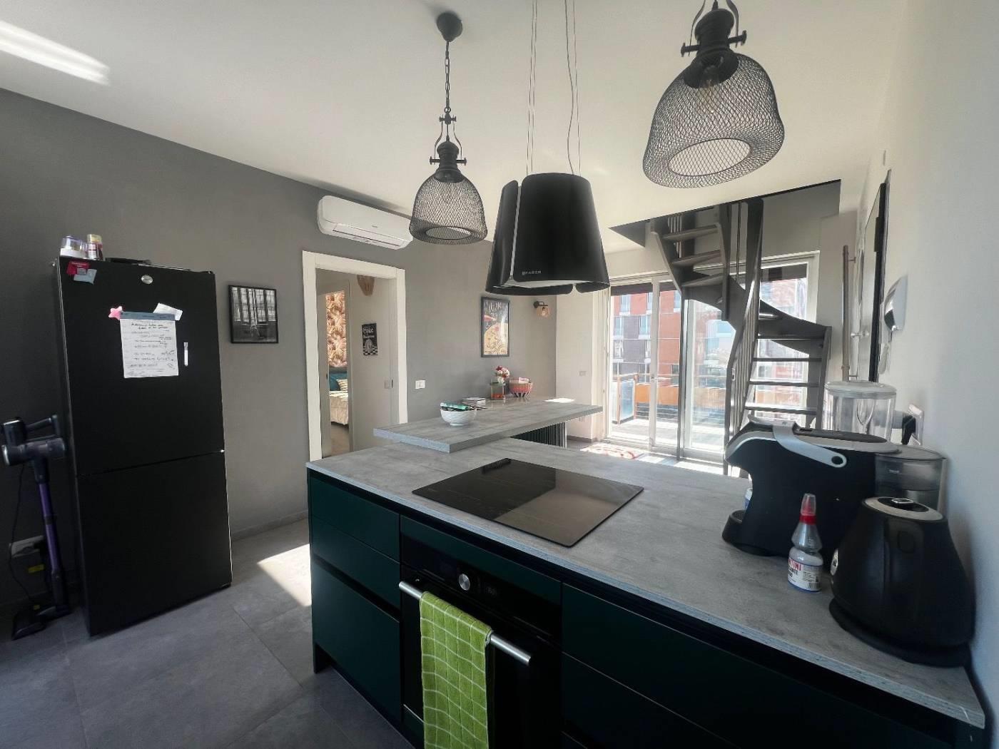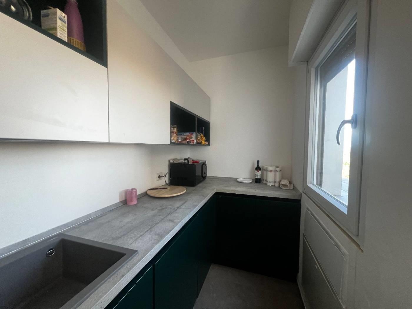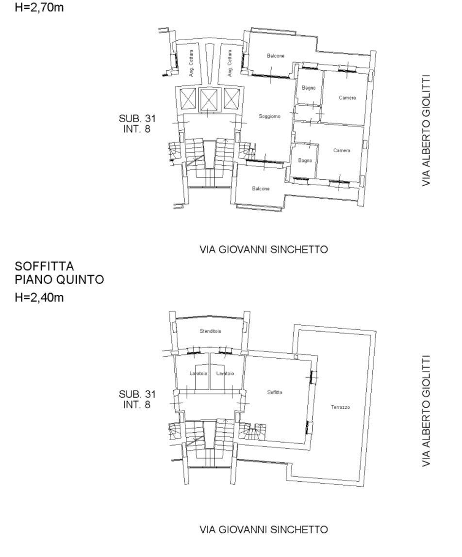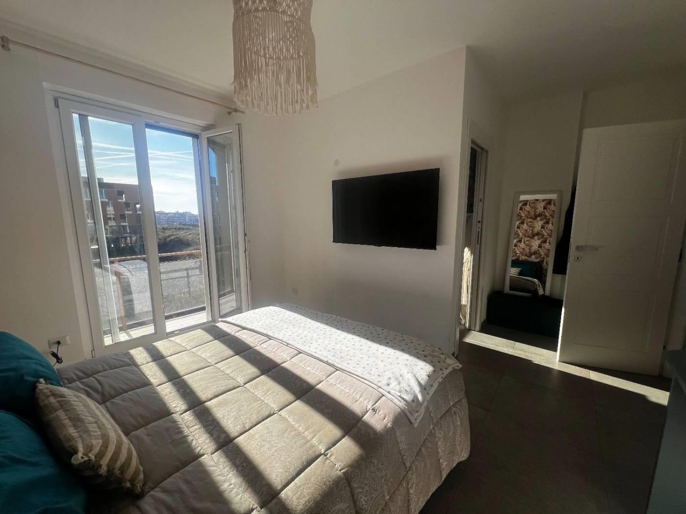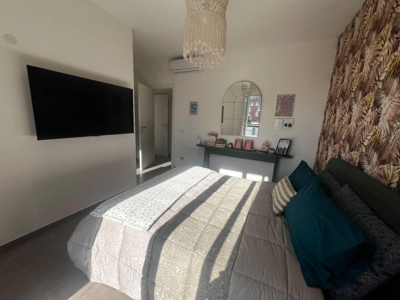 Al piano attico troviamo un cucinotto, un soggiorno servito da due terrazzi, due camere da letto matrimoniali, due bagni dotati di finestra; al superattico, con ingresso indipendente, troviamo un'ampia stanza con la predisposizione di un bagno ed uno splendido terrazzo. La proprietà è completata da due posti auto coperti.