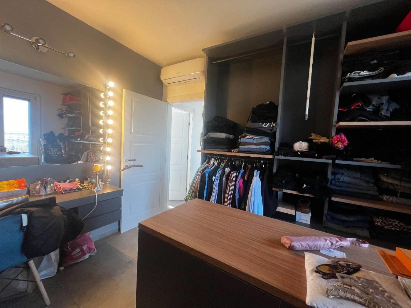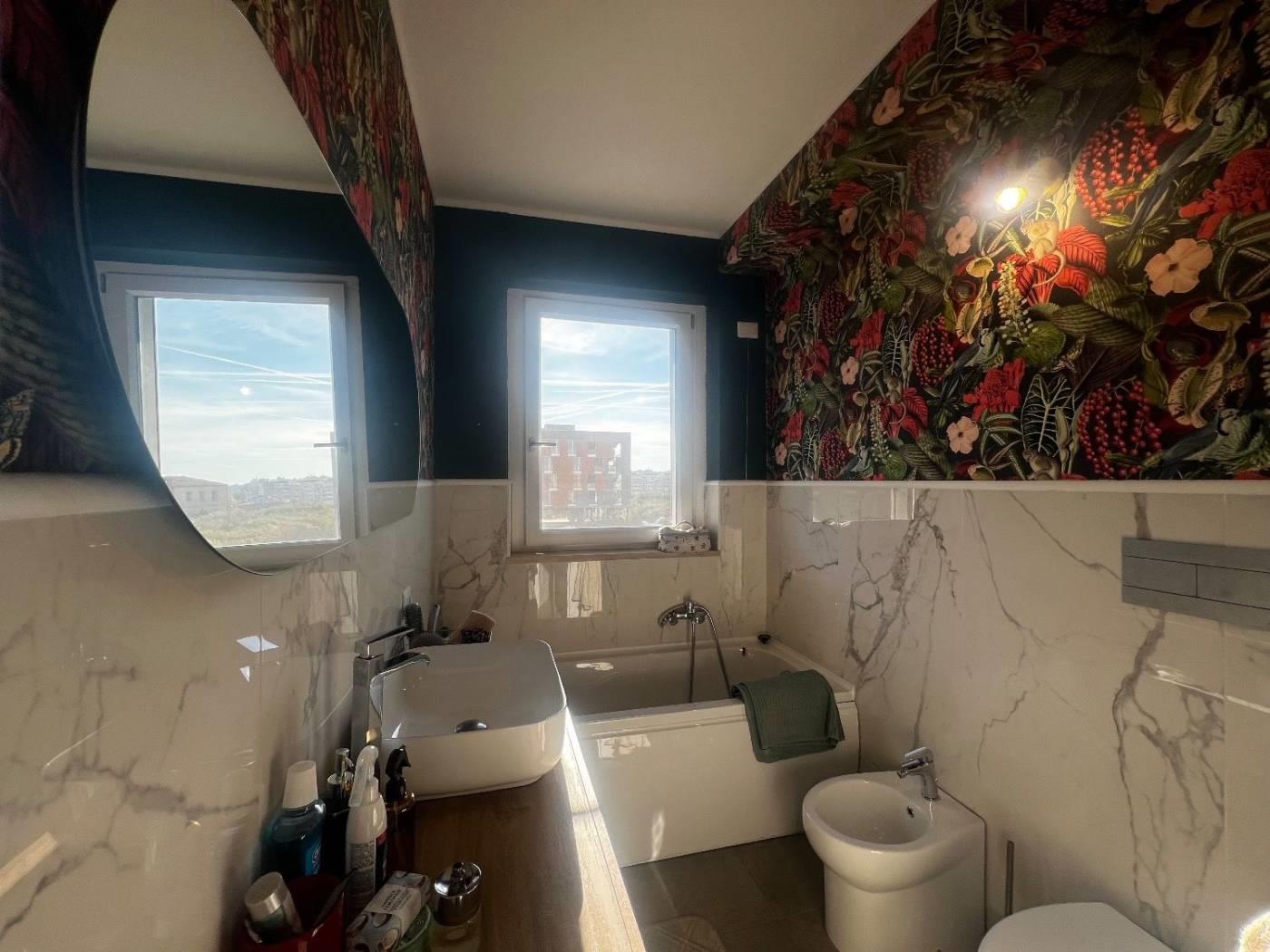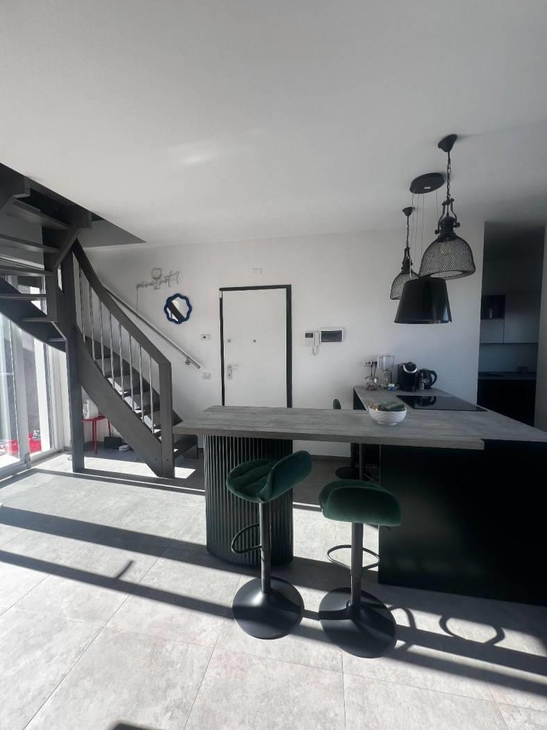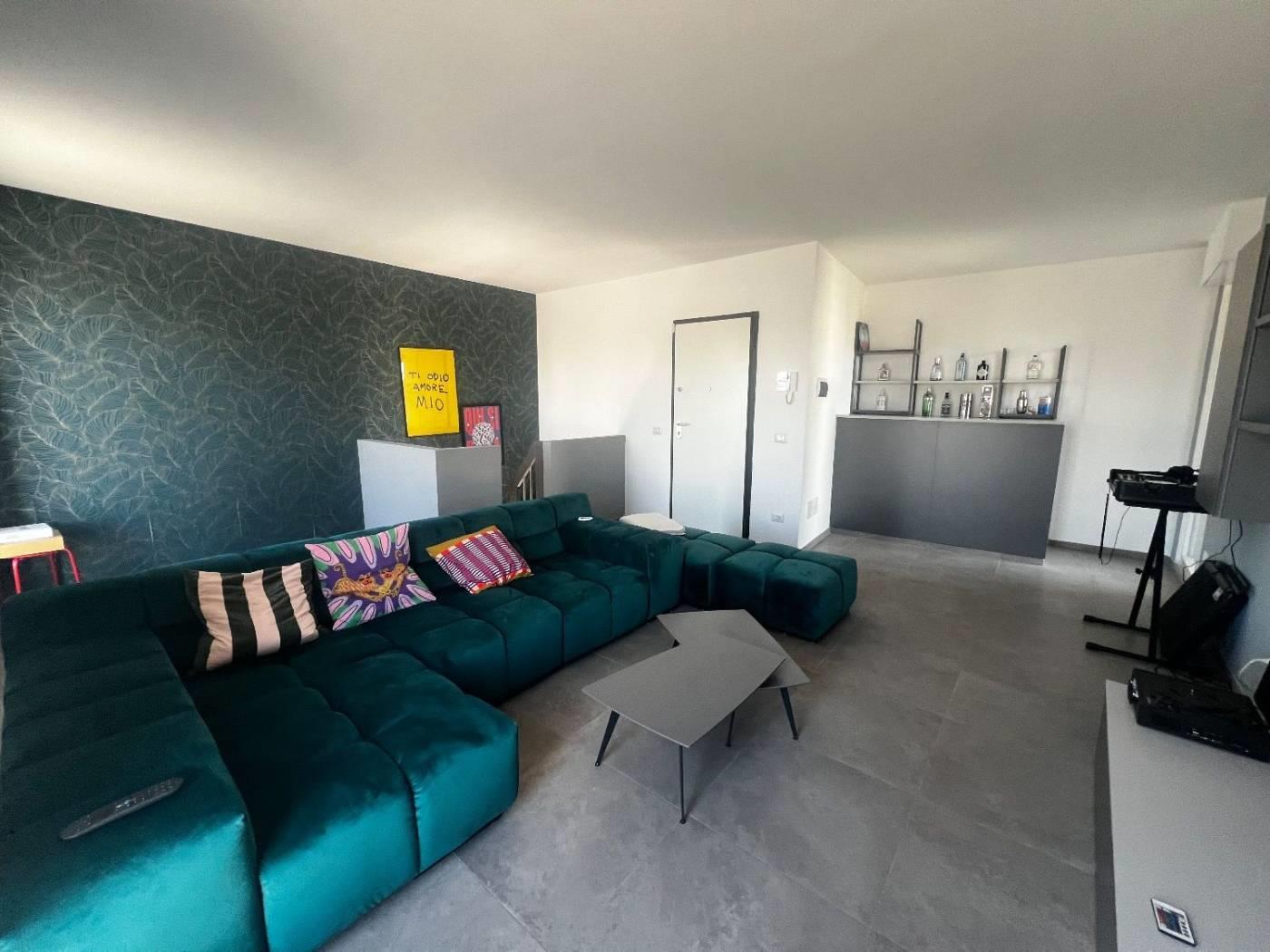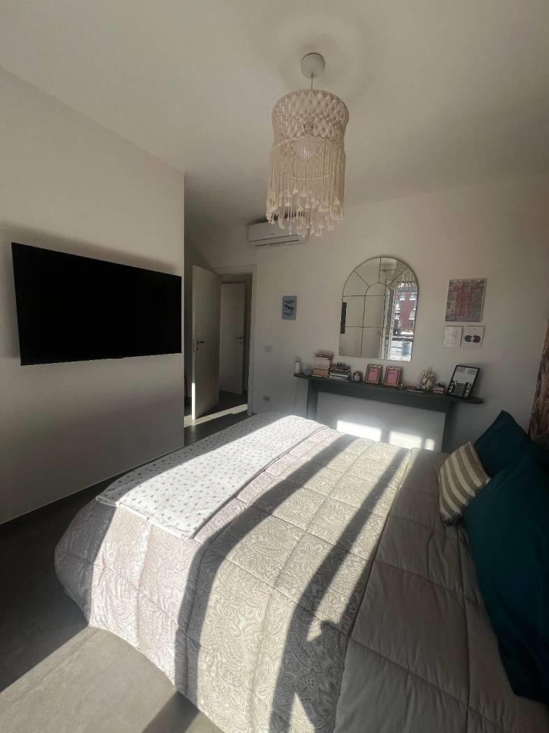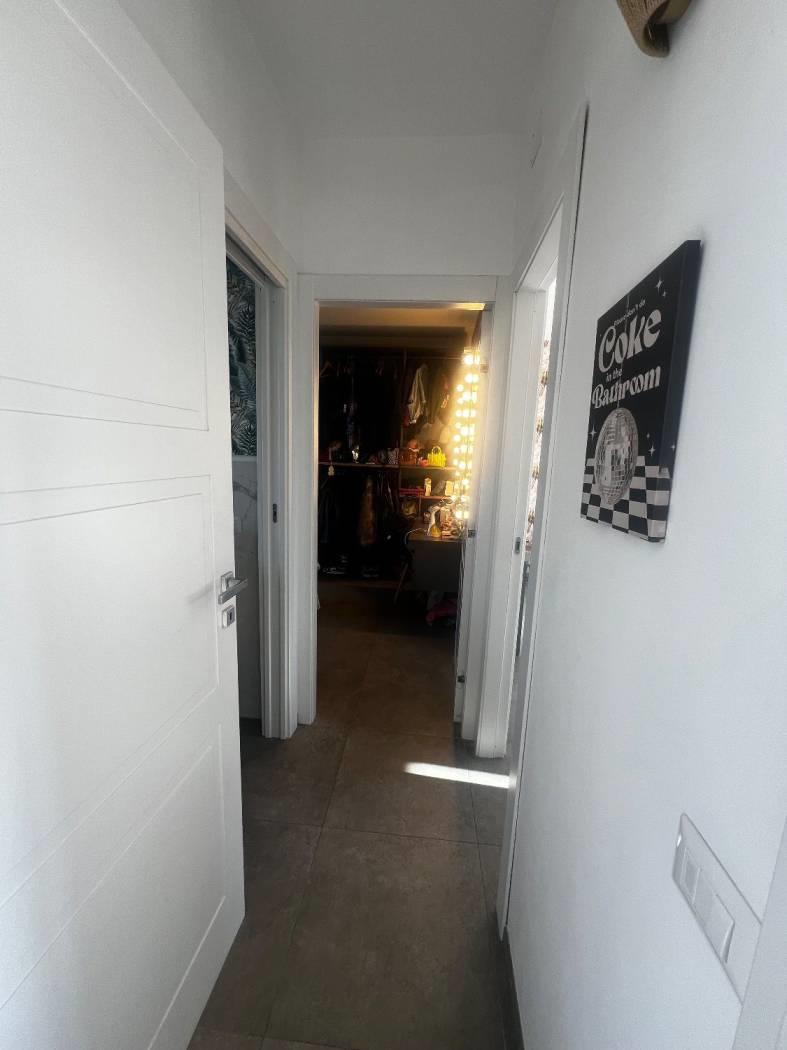 Al piano attico troviamo un cucinotto, un soggiorno servito da due terrazzi, due camere da letto matrimoniali, due bagni dotati di finestra; al superattico, con ingresso indipendente, troviamo un'ampia stanza con la predisposizione di un bagno ed uno splendido terrazzo. La proprietà è completata da due posti auto coperti.
