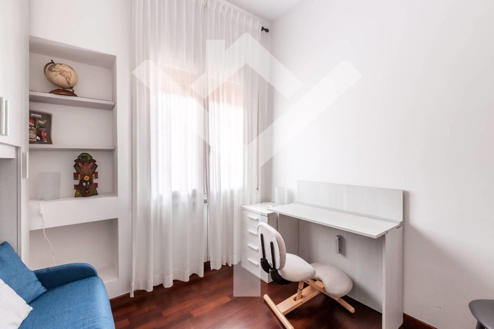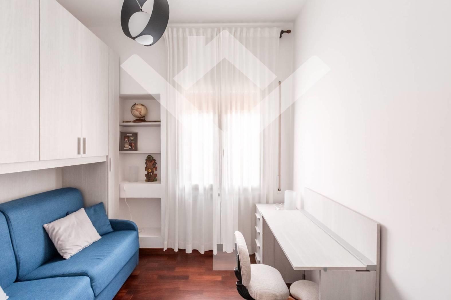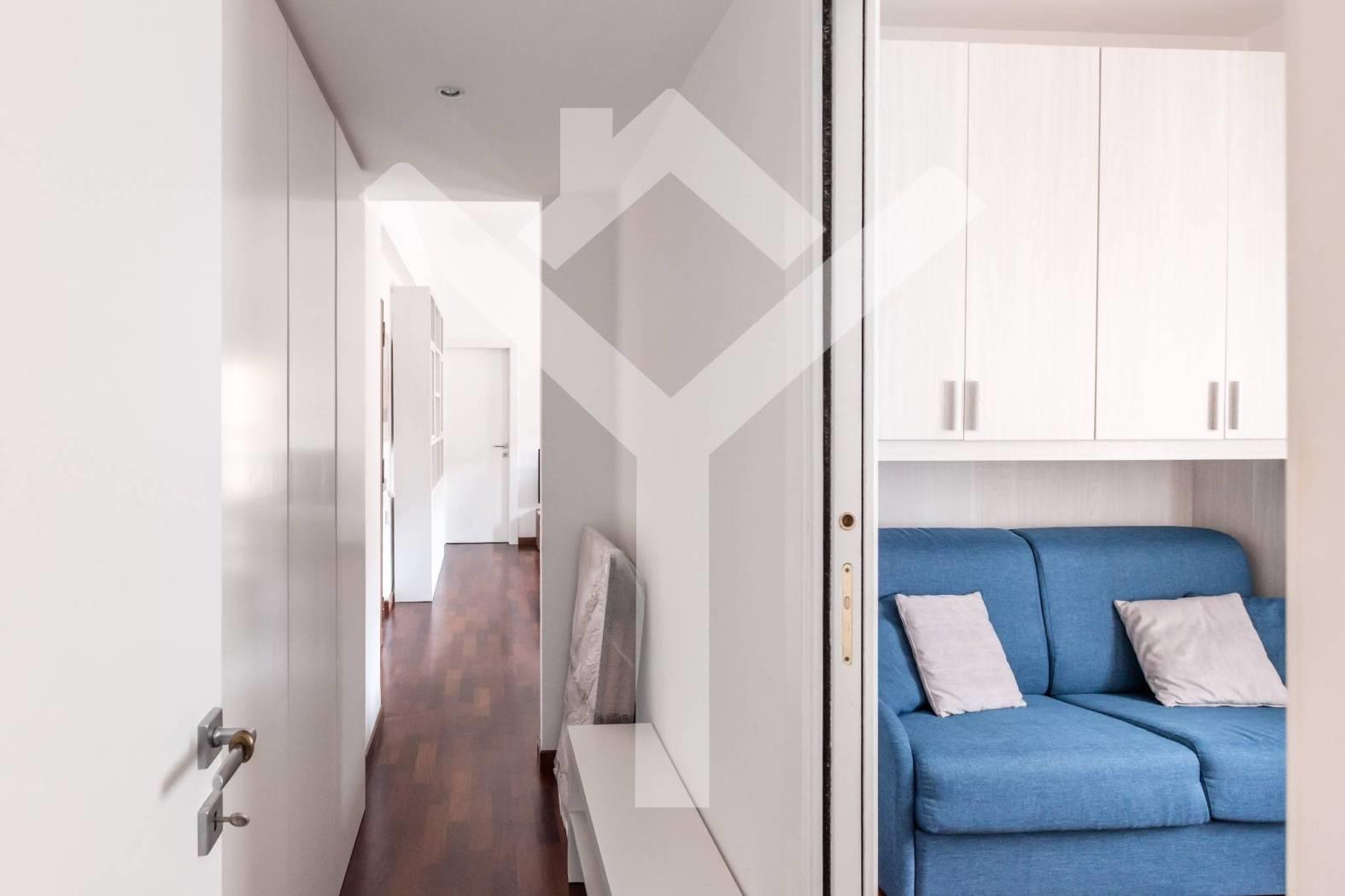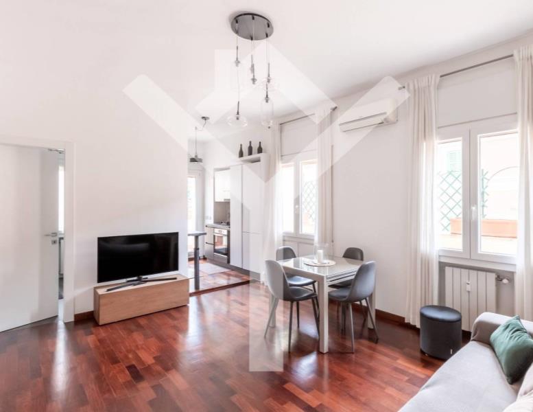 L'appartamento, sito al quinto piano, servito da un comodo ascensore, si estende su una superficie totale di 80 mq, di cui 75 mq circa calpestabili. Suddiviso in salone, cucinotto e in una grande camera da letto con servizio, l'immobile è composto altresi anche da uno studio/ camera più piccola. L'arredamento dell' immobile, moderno e di buon gusto, rende gli ambienti accoglienti e confortevoli.