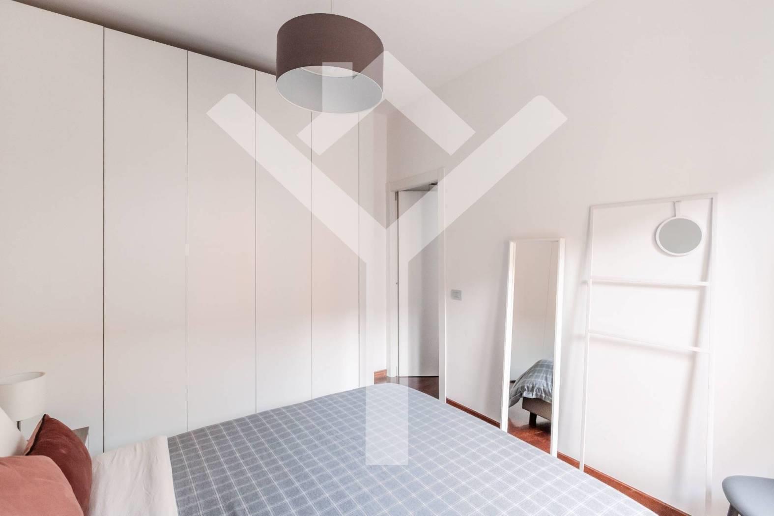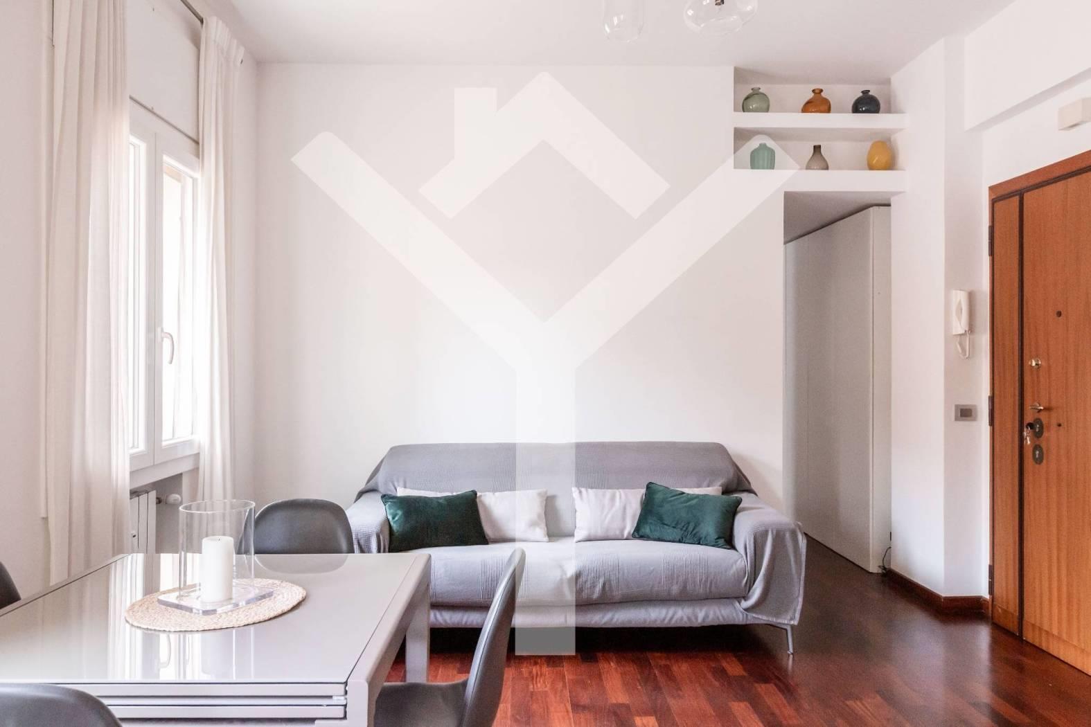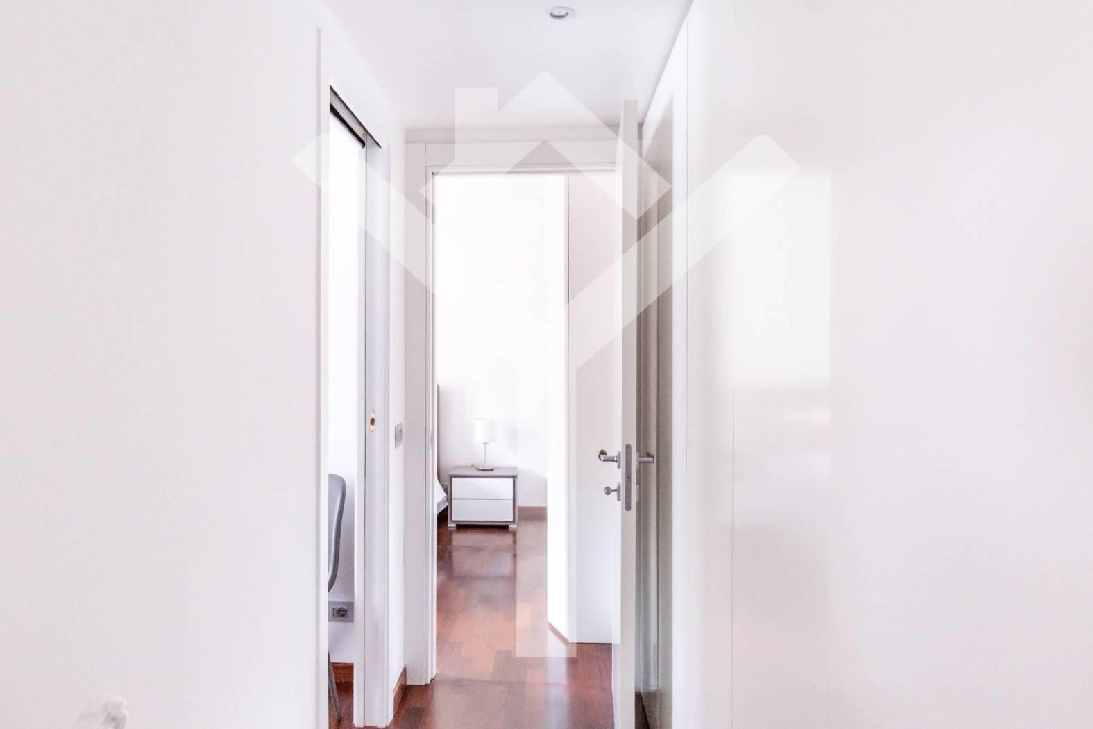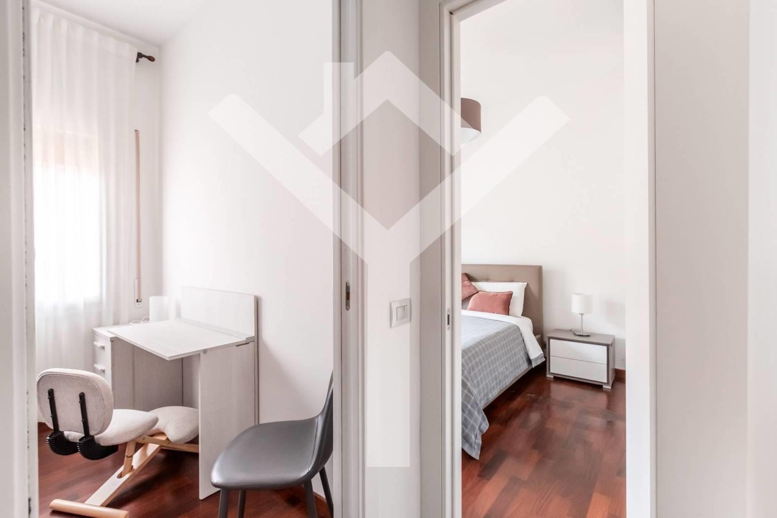 L'appartamento, sito al quinto piano, servito da un comodo ascensore, si estende su una superficie totale di 80 mq, di cui 75 mq circa calpestabili. Suddiviso in salone, cucinotto e in una grande camera da letto con servizio, l'immobile è composto altresi anche da uno studio/ camera più piccola. L'arredamento dell' immobile, moderno e di buon gusto, rende gli ambienti accoglienti e confortevoli.