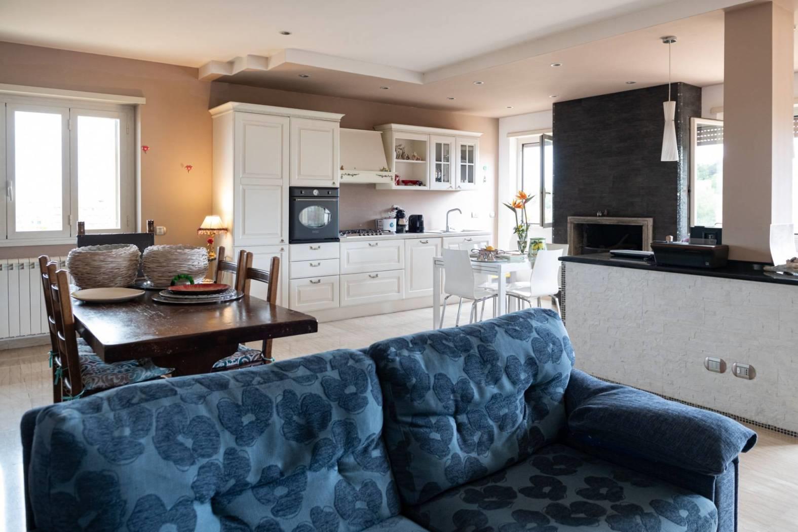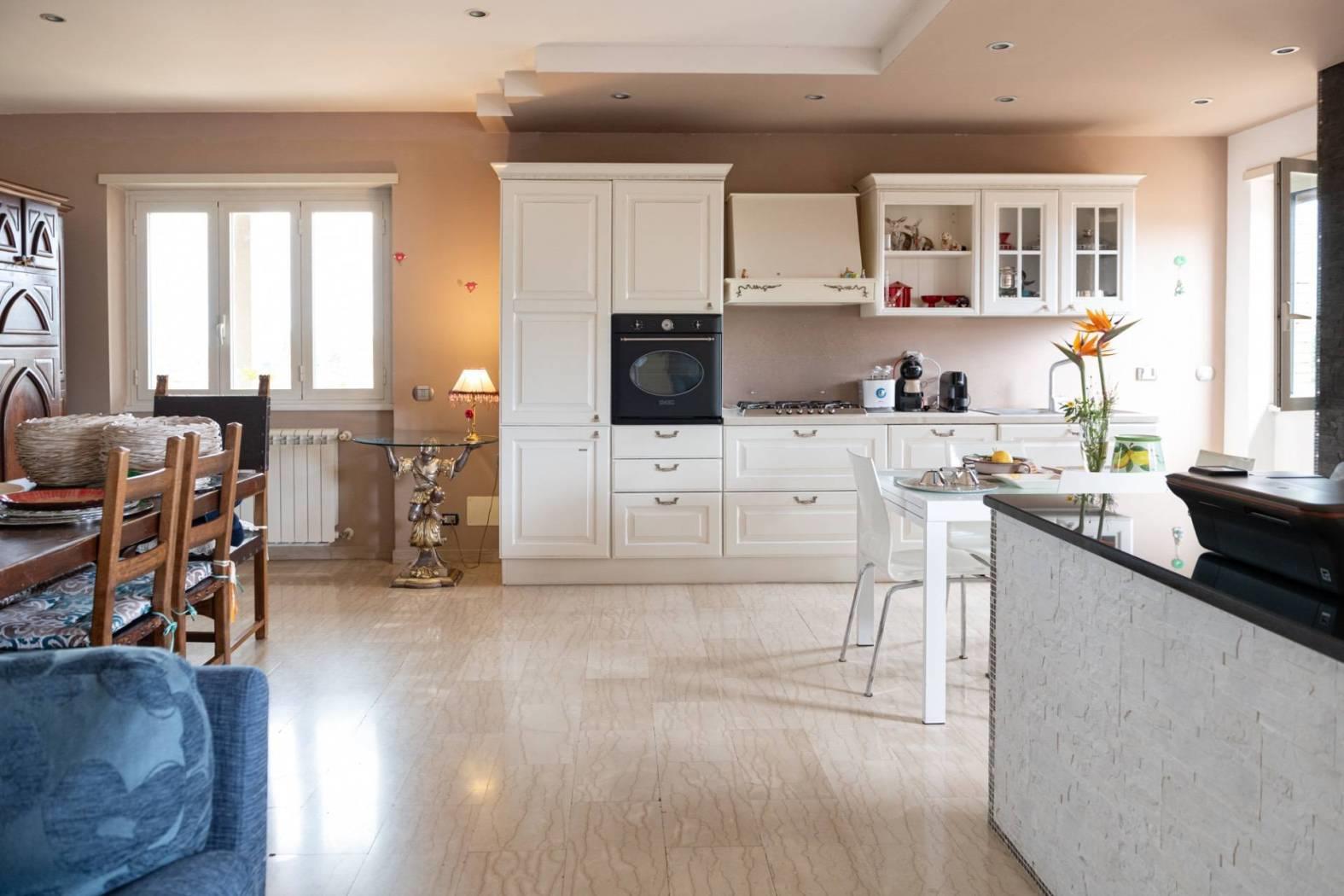 L'immobile si sviluppa prevalentemente su un unico livello, dove si trovano un salone con camino, una cucina abitabile, tre camere da letto matrimoniali, due bagni, un terrazzo perimetrale con vista panoramica e un secondo terrazzo. Una scala interna conduce alla mansarda, di circa 27 metri quadrati, articolata in due ambienti distinti e una zona lavanderia.