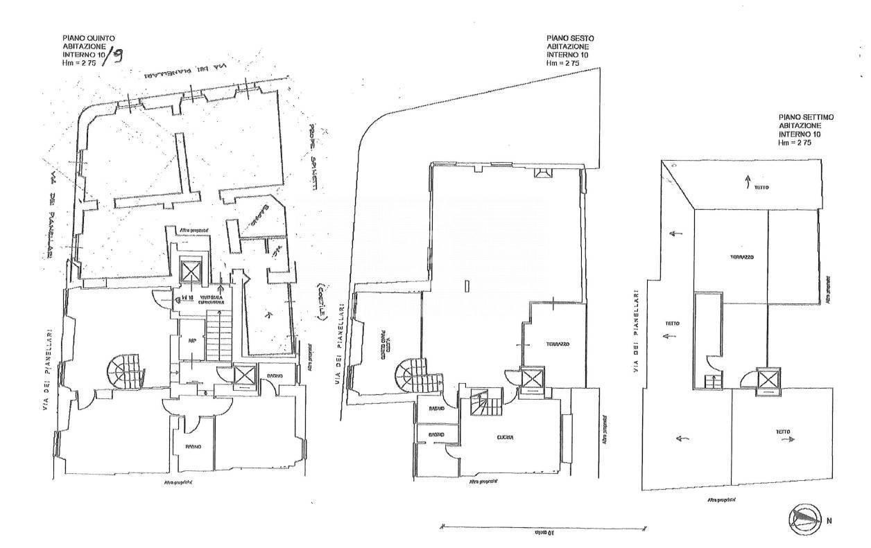 • Sesto piano: salone triplo con cucina abitabile, doppi servizi, ripostiglio e accesso diretto al terrazzo;