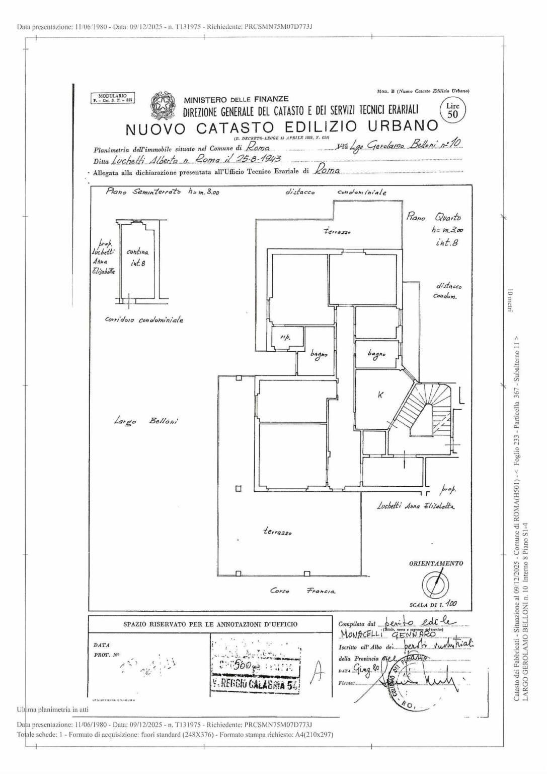 L'appartamento ha una superficie di circa 125 mq molto luminoso con affaccio su tre lati, completano la proprietà terrazzo e balconi per una superficie di circa 100 mq.