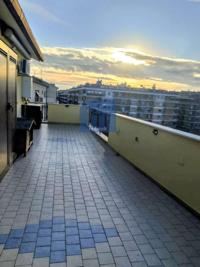 L'attico, luminoso e silenzioso, si compone di: ampio ingresso, ampio salone con porta finestra che dà sul balcone, camera matrimoniale con bagno privato, cameretta, cucina abitabile, doppi servizi di recente realizzo, entrambi finestrati, disimpegno con porta finestra che dà accesso all' ampio terrazzo panoramico di 50 mq circa, ideale per vivere gli spazi esterni in ogni stagione, fornito di tende da sole elettriche e barbecue.