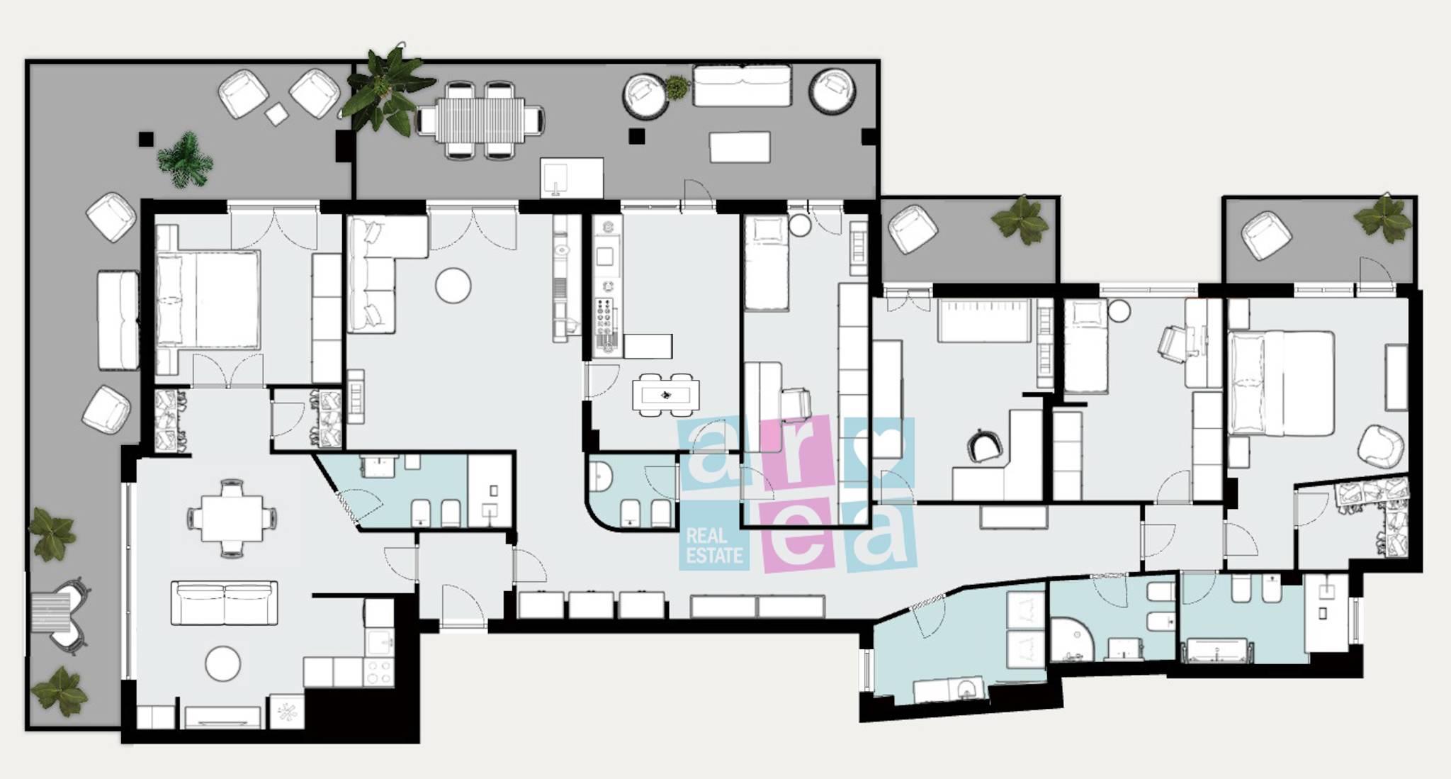 L’attico, originariamente composto da un salone triplo, quattro camere, cucina abitabile, tre bagni, due balconi e un ampio terrazzo, offre una distribuzione degli spazi ideale per chi desidera vivere nel comfort e nella tranquillità.
