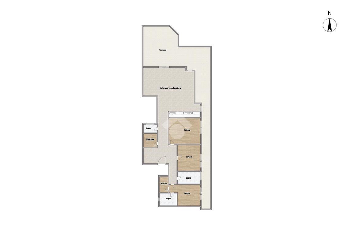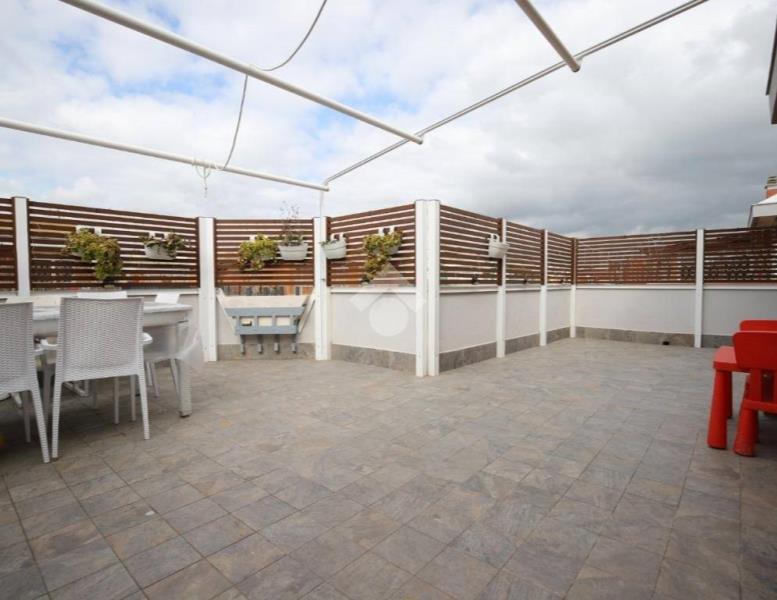 L'ampio ingresso con doppio disimpegno conduce a una zona giorno luminosa, caratterizzata da un'ampia sala, cucina a vista e un camino funzionante, perfetto per le serate invernali. Il terrazzo di circa 40 mq è accessibile direttamente dalla zona giorno, offrendo uno spazio ideale per godere del sole e organizzare cene all'aperto. L'appartamento dispone di tre camere indipendenti, ognuna con accesso al terrazzo, e una camera patronale con bagno completo finestrato e cabina armadio.