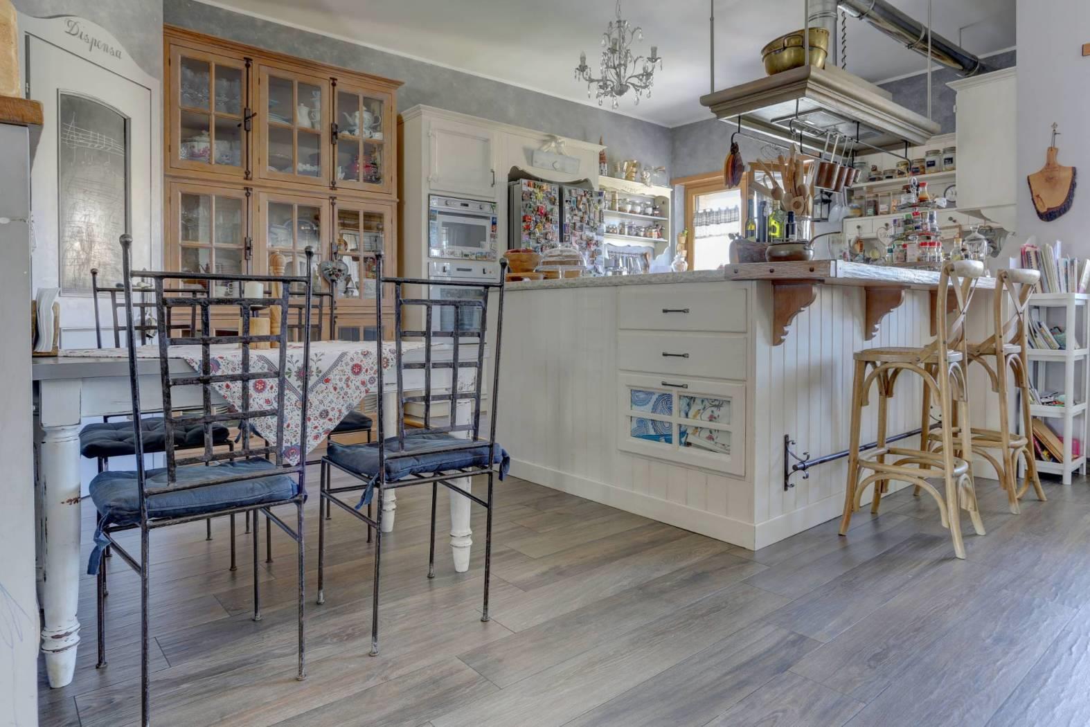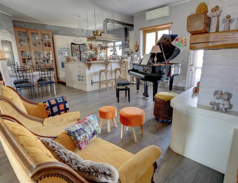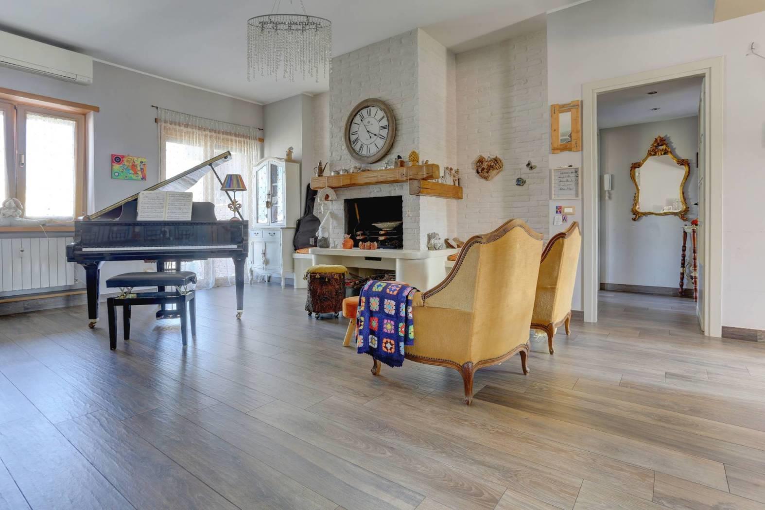La zona giorno si apre con un salone triplo di circa 85 mq, un ambiente maestoso e accogliente con cucina a vista, reso unico da due terrazze esposte a est e a ovest, perfette per colazioni al sole o cene al tramonto. Un ulteriore elemento di pregio è il camino funzionante, con canna fumaria recentemente sostituita, che dona calore e atmosfera agli ambienti. Le ampie superfici finestrate – due porte-finestre e tre finestre aggiuntive – garantiscono luce naturale in ogni momento della giornata. Completa la zona giorno un pratico ripostiglio finestrato.