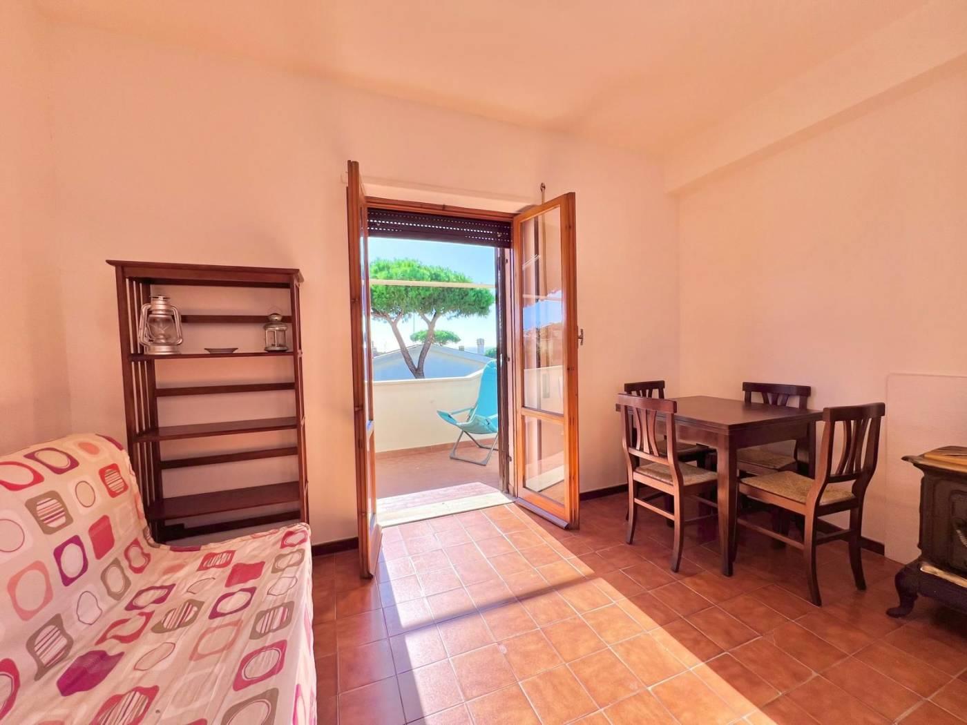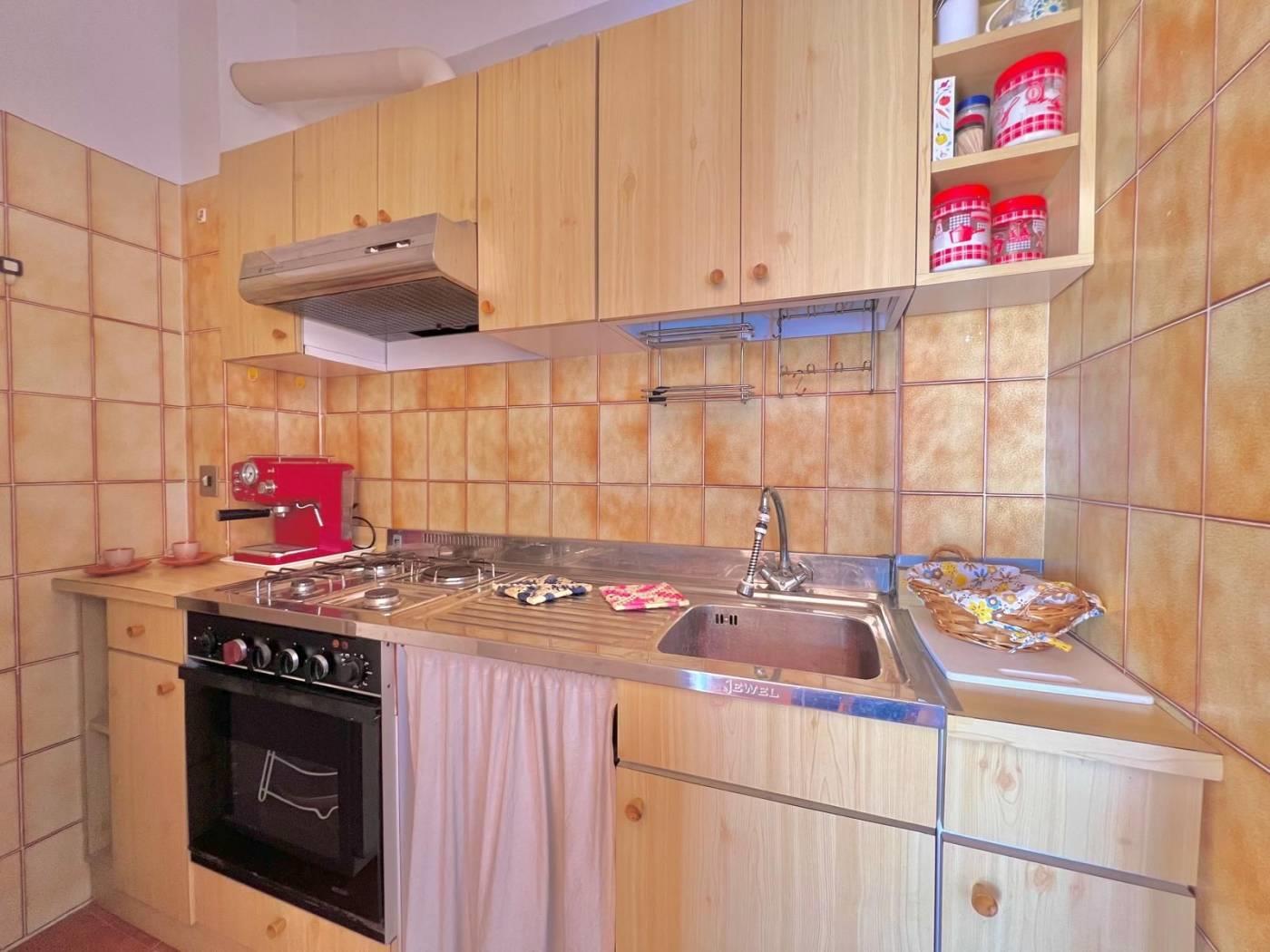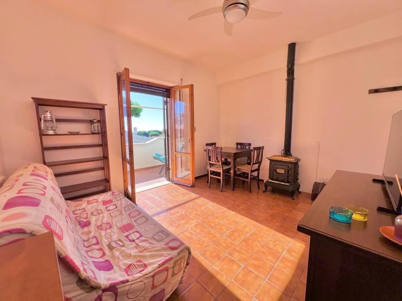 ingresso con un accogliente ampio salone impreziosito da una comoda Stufa in Ghisa che offre un riscaldamento a legna, caldo e accogliente durante tutto l'anno, angolo cottura pratico e funzionale, una luminosissima camera da letto matrimoniale, bagno con finestra, ampio ripostiglio con lavatrice integrata, balconata con ampie tende da sole.