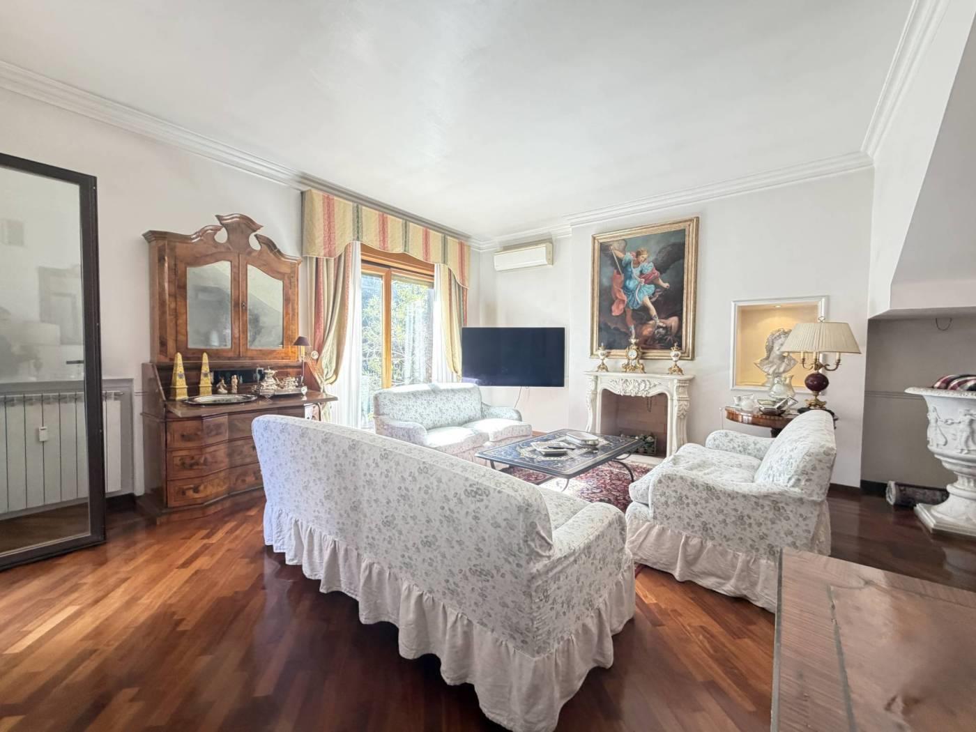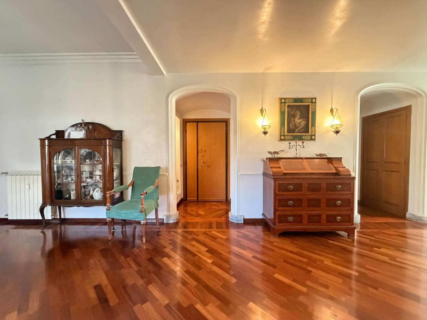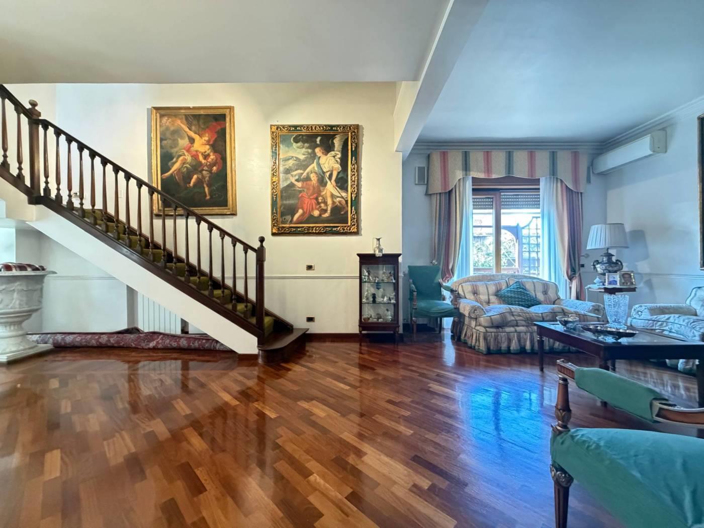 La zona giorno è composta da un salone doppio di rappresentanza e una sala da pranzo, ideali per accogliere ospiti in un ambiente raffinato. La cucina è separata e ben organizzata.