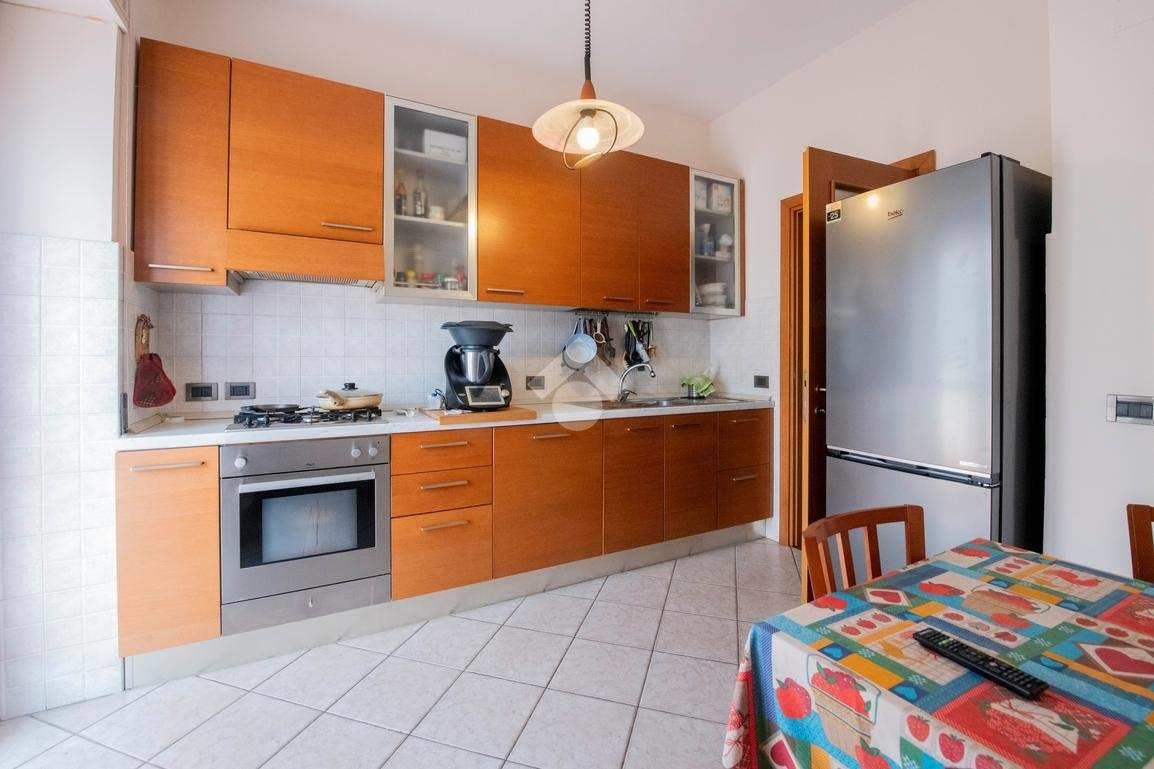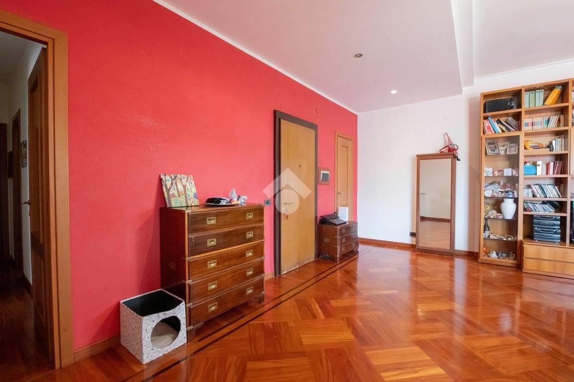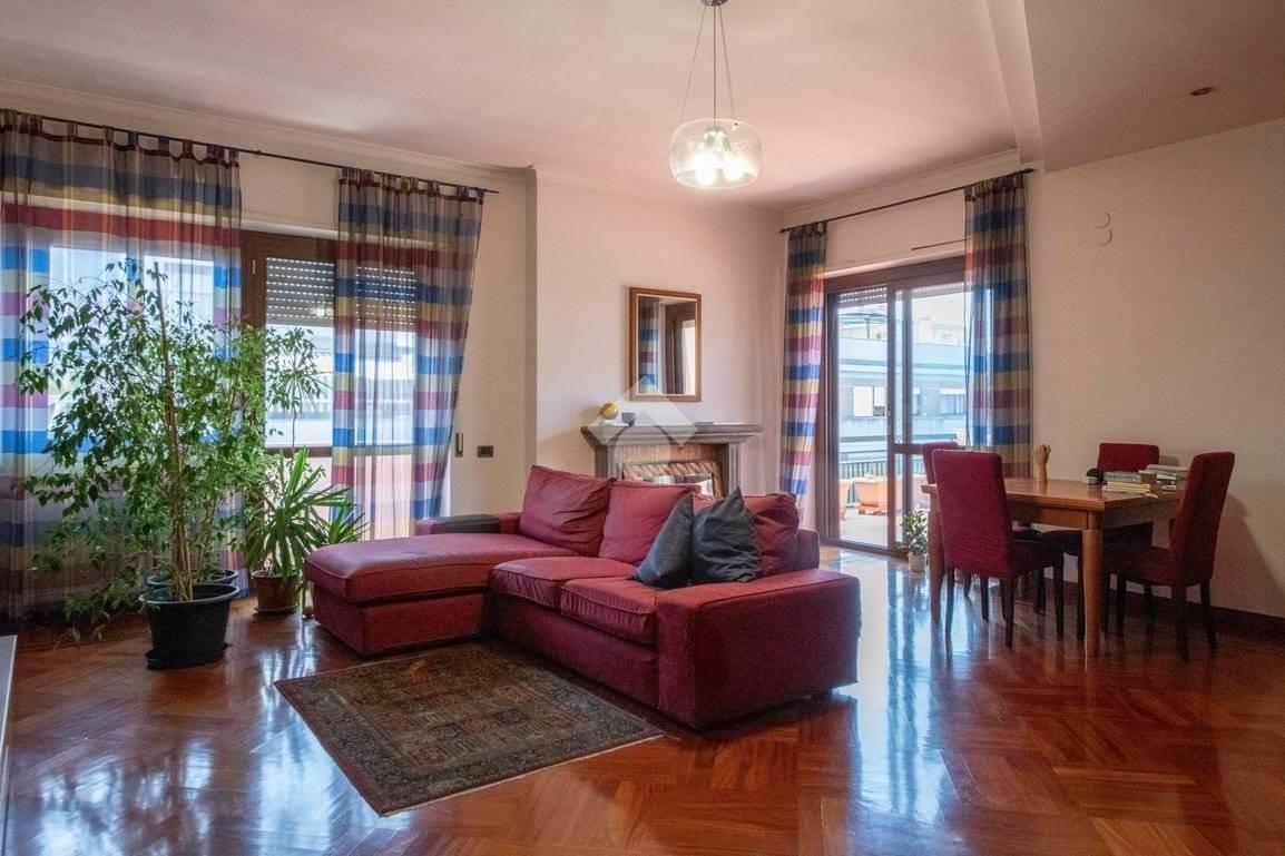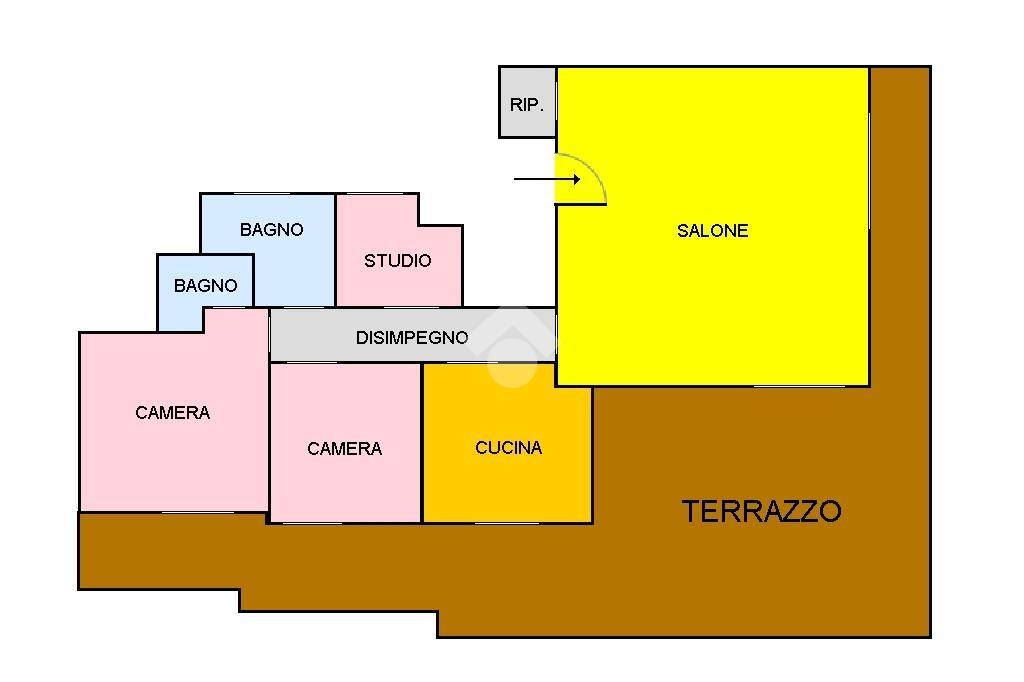 L'immobile al suo interno risulta così composto. Saliti all'ultimo piano, mediante l'ascensore, e varcata la porta di accesso della casa, veniamo subito accolti nell'ampio salone quadrato di circa 38 mq. Qui possiamo trovare un delizioso camino a legno ed un comodo ripostiglio, quest'ultimo situato alla sinistra dell'ingresso. Alla destra del salone invece un disimpegno conduce dapprima alla cucina abitabile di oltre 12 mq, e a seguire alla zona notte, composta da due camere da letto, una delle quali con bagno di servizio interno, una camera studio, e l'ampio bagno patronale con piatto doccia e finestra.