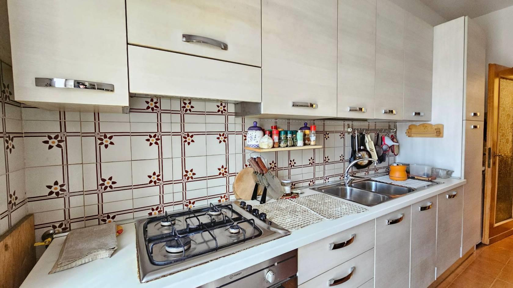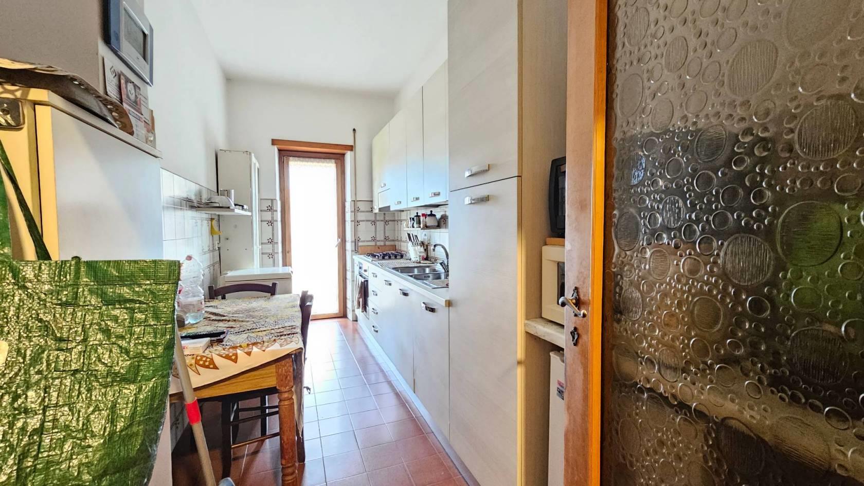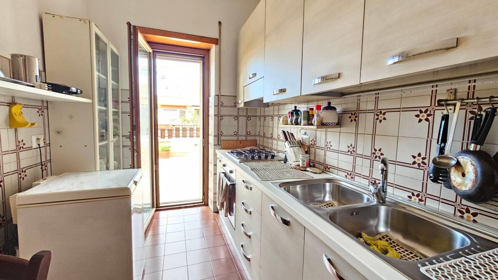 Proseguendo frontalmente dall’ingresso si accede alla cucina abitabile, separata e confortevole, anch’essa con accesso diretto al medesimo terrazzo collegato al salone, creando così una piacevole continuità tra zona giorno interna ed esterna.
