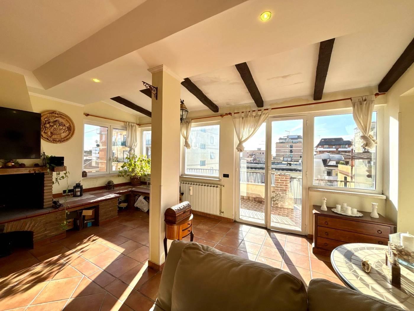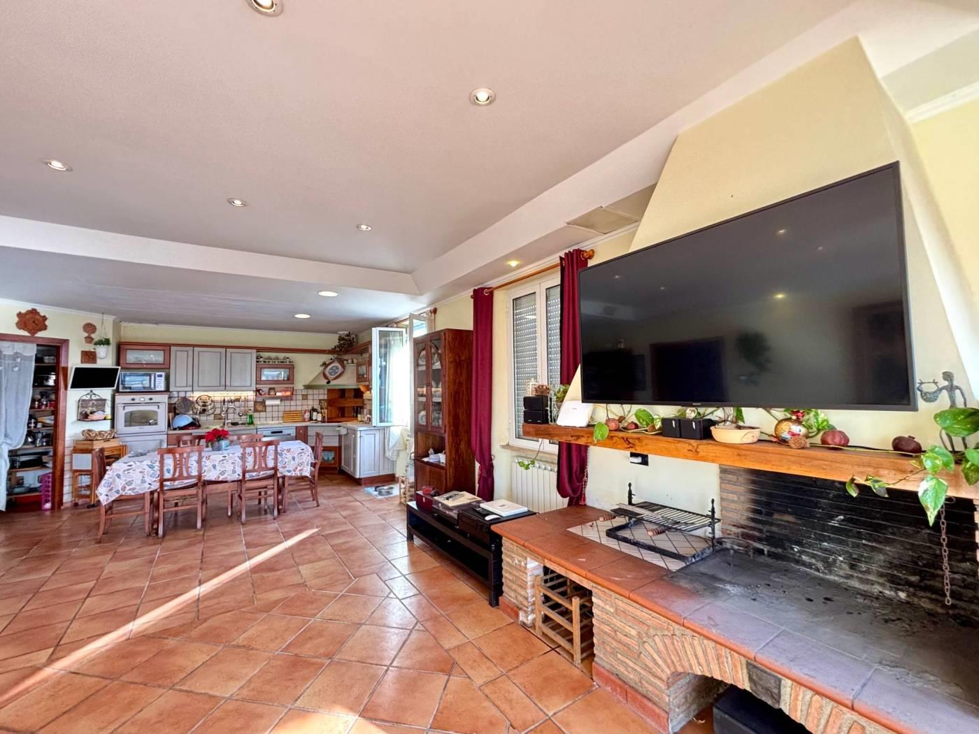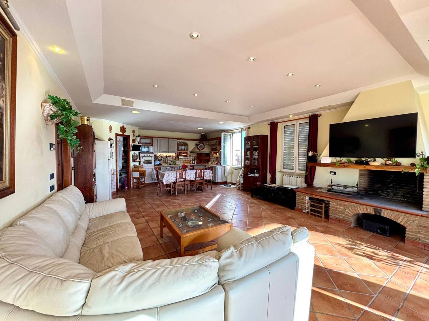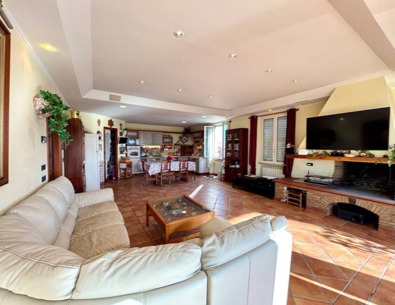 L'immobile è composto al suo interno da uno spazioso e accogliente salone con camino che si affaccia su una cucina a vista e una dispensa. La zona giorno è caratterizzata da pavimenti in cotto toscano e da un’ottima luminosità garantita dall’esposizione favorevole e da una parete vetrata che dà accesso a un ampio terrazzo. La zona notte, separata dalla zona giorno, è composta da un'ampia camera matrimoniale, una cameretta, uno studio (attualmente utilizzato come cabina armadio e zona lavanderia), oltre a un servizio igienico. Completano la soluzione oltre che un ampio terrazzo, anche un androne privato sul pianerottolo con annesso ripostiglio di pertinenza. L'immobile dispone inoltre di infissi in doppio vetro, impianti a norma, condizionatore e porta blindata in massello di noce.