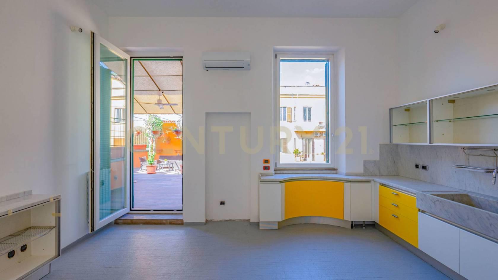 La cucina abitabile, moderna e funzionale, con ampia finestra e una porta finestra che da accesso all' ampio terrazzo riservato e vivibile, ideale per momenti di relax e convivialità all’aperto.