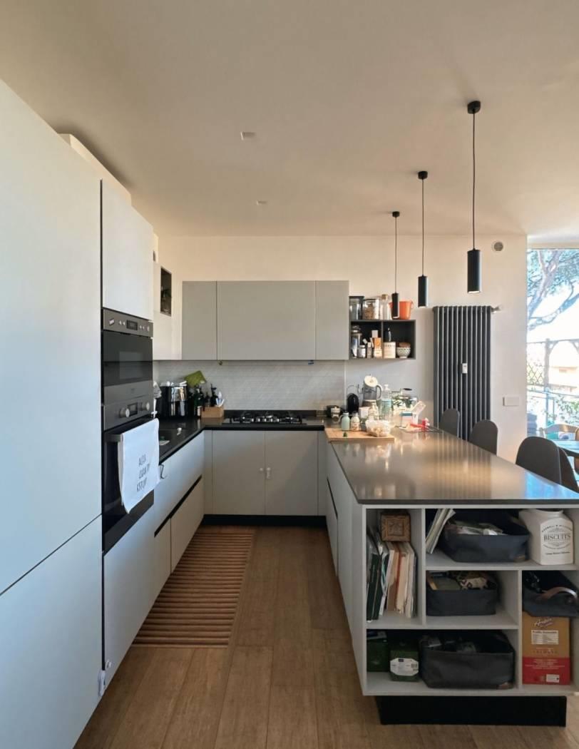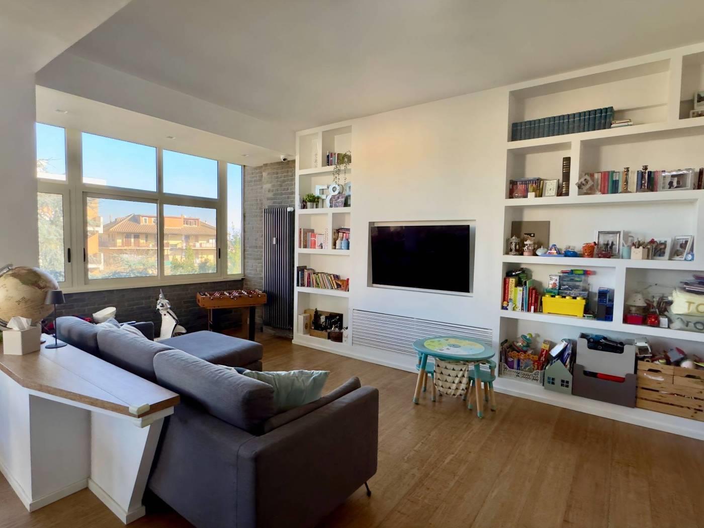 L’ingresso, ampio ed ottimamente organizzato, ci accompagna in una luminosa zona living, dove il soggiorno, impreziosito da una libreria in cartongesso, si fonde armoniosamente con la cucina a vista, moderna e completa di penisola e di tutti gli elettrodomestici.