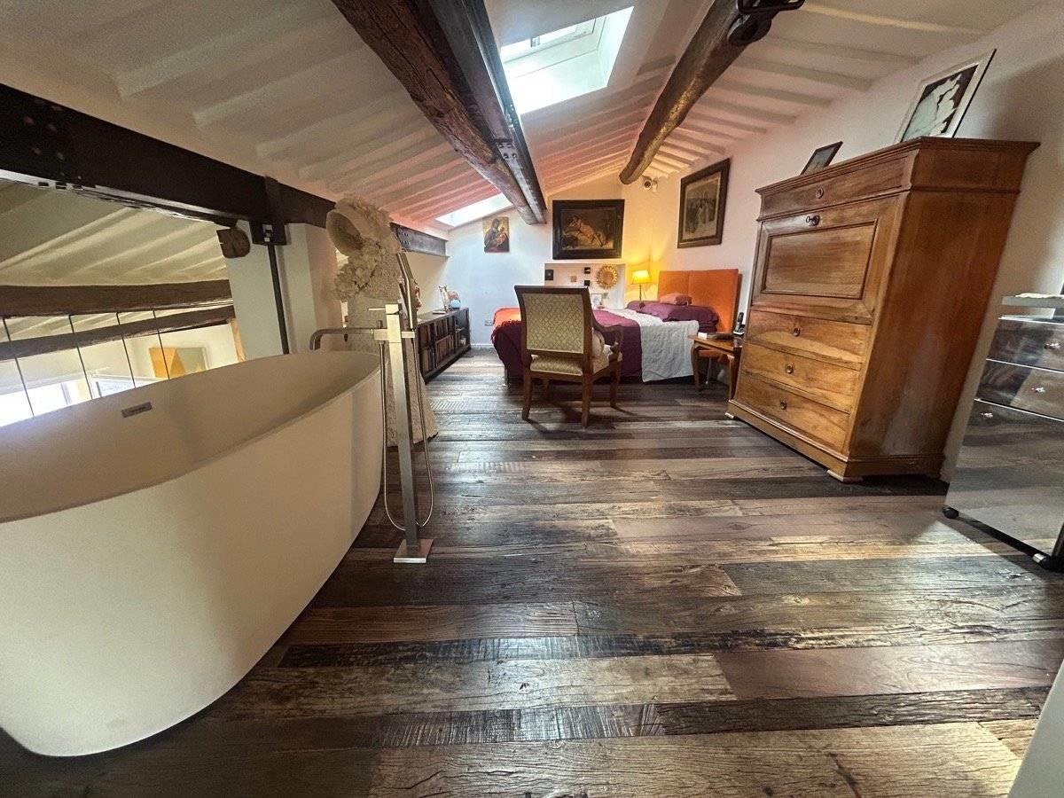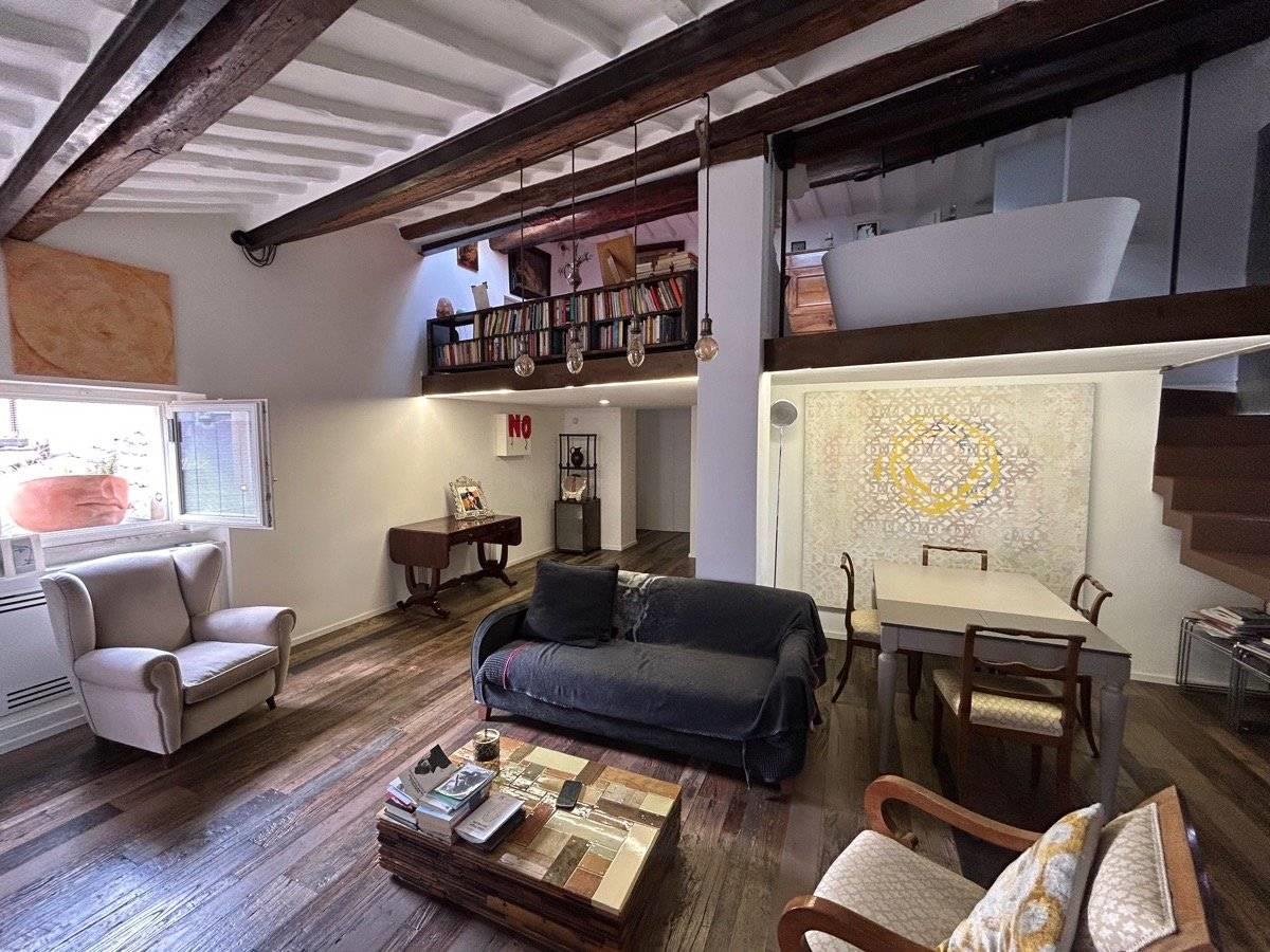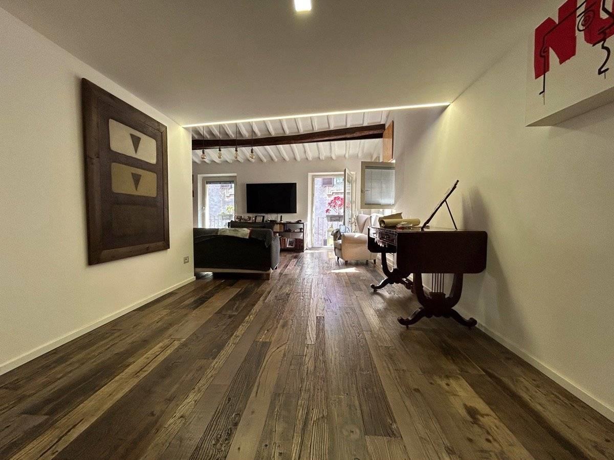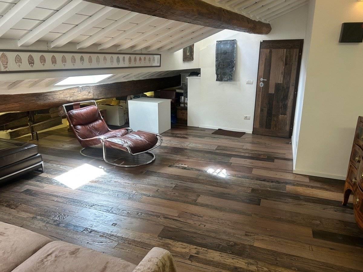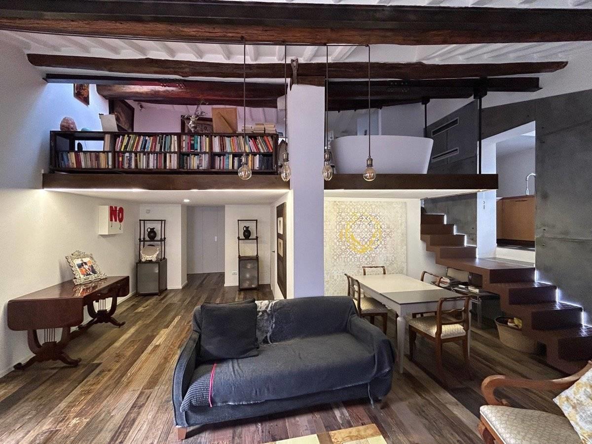 L’appartamento si apre su una zona living luminosa, che introduce ad un raffinato ambiente soggiorno-pranzo con soffitti in travi a vista e pavimenti in parquet. Una scenografica scala interna conduce a una camera da letto sospesa sul soggiorno, creando un affascinante effetto architettonico e donando respiro e verticalità agli spazi.
