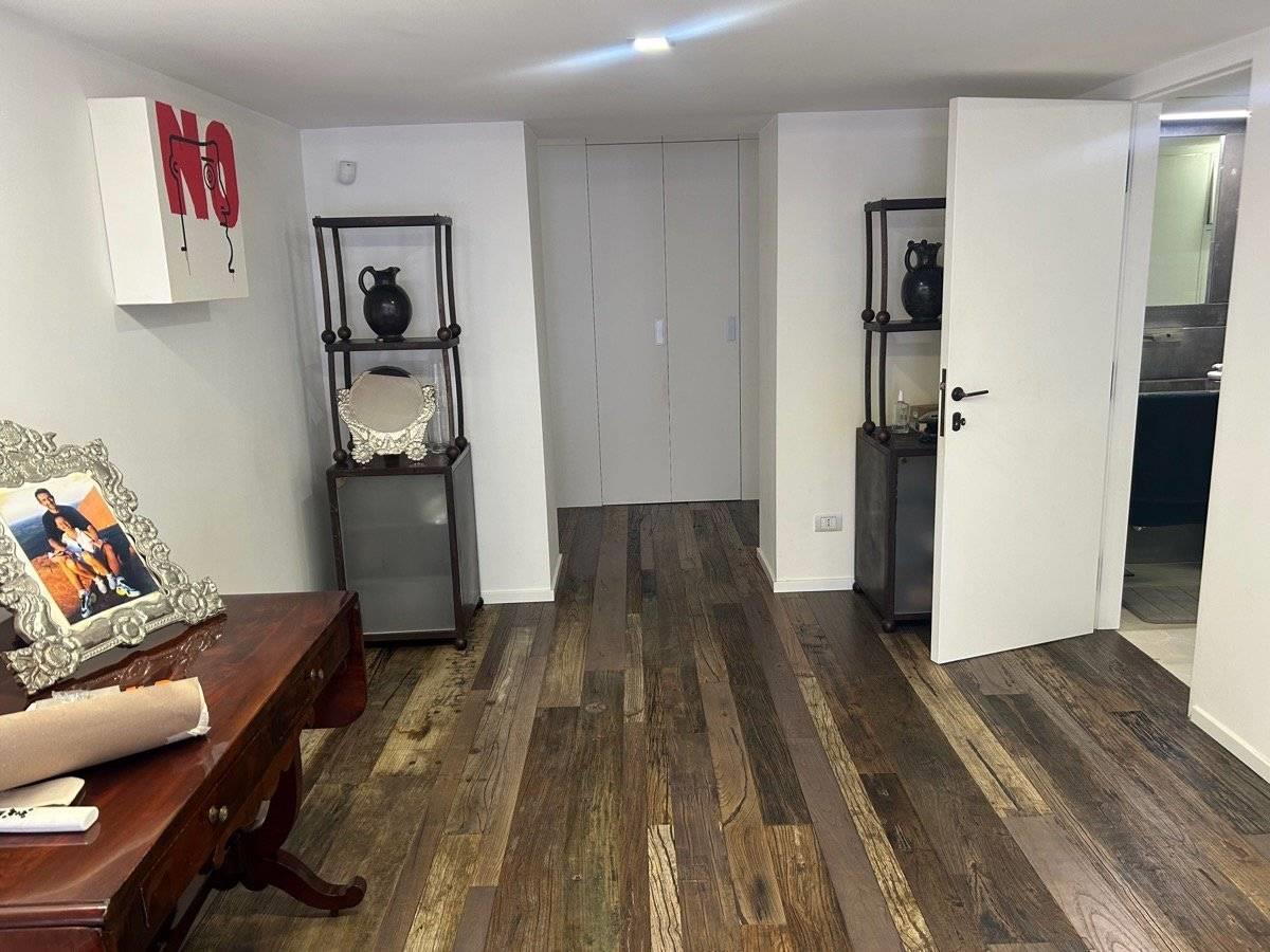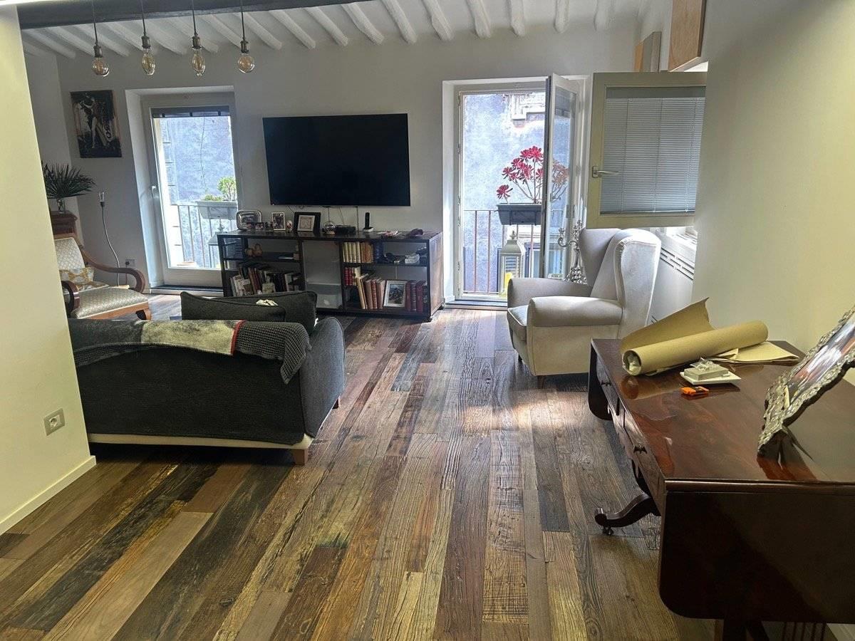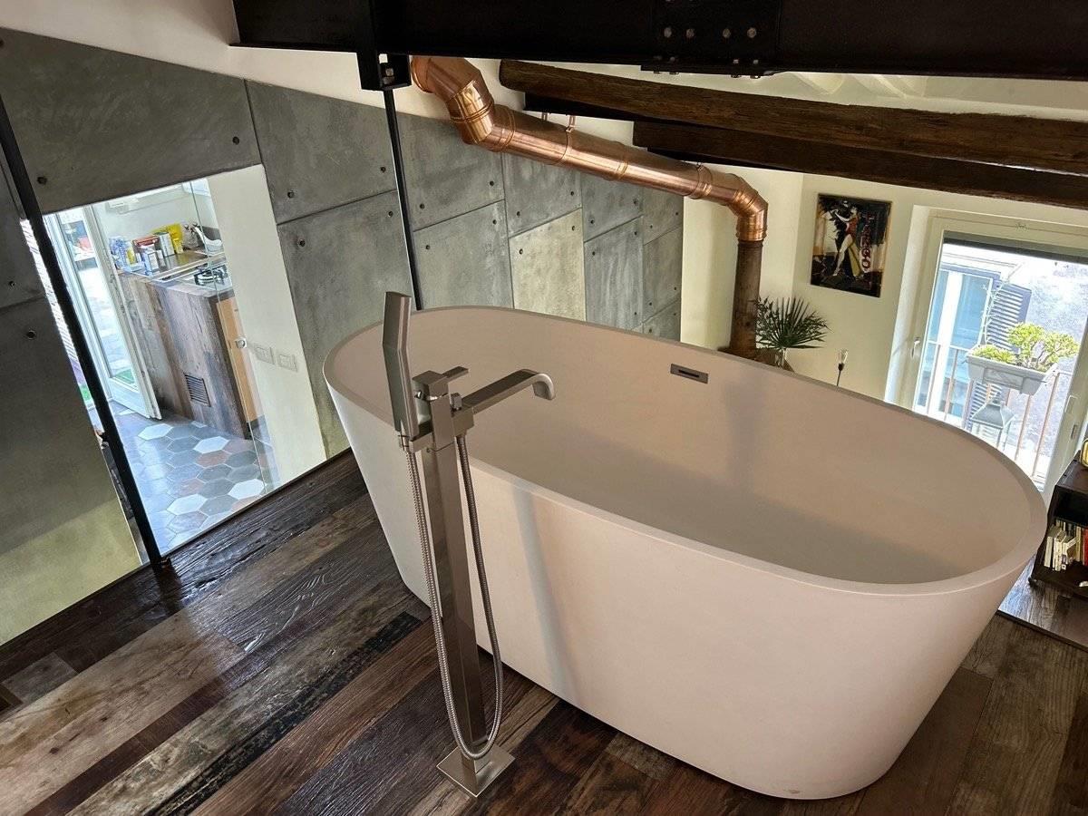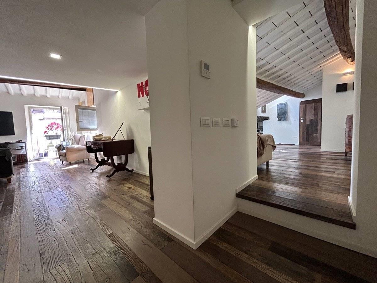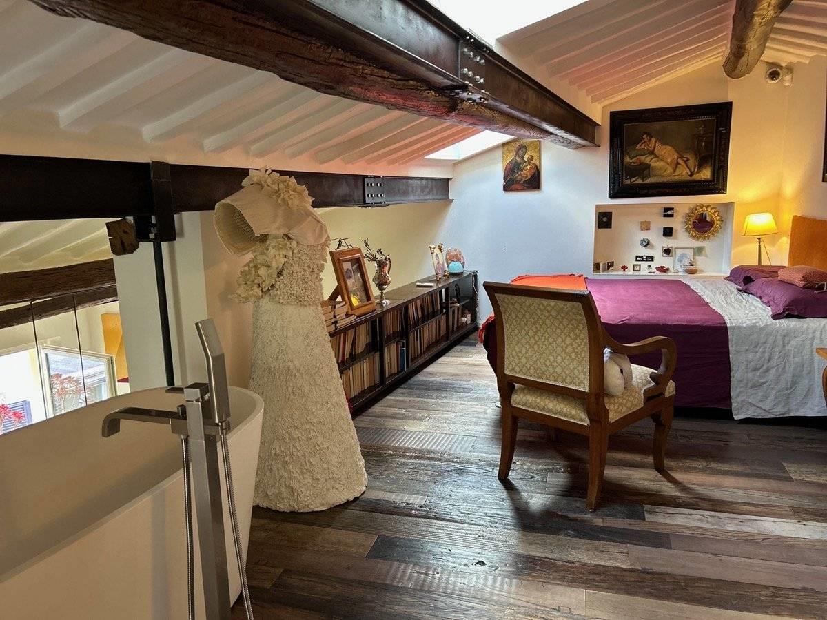 L’appartamento si apre su una zona living luminosa, che introduce ad un raffinato ambiente soggiorno-pranzo con soffitti in travi a vista e pavimenti in parquet. Una scenografica scala interna conduce a una camera da letto sospesa sul soggiorno, creando un affascinante effetto architettonico e donando respiro e verticalità agli spazi.