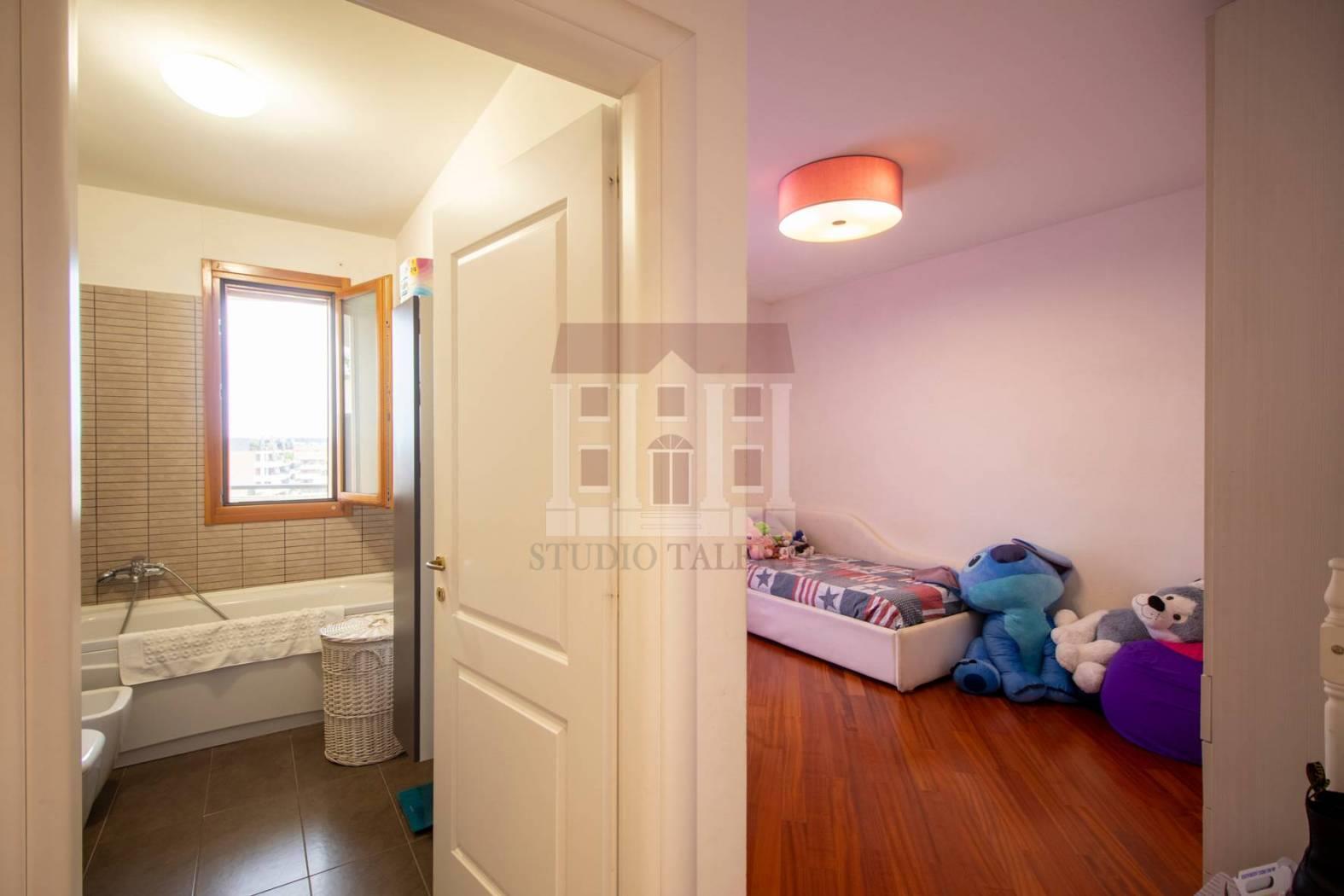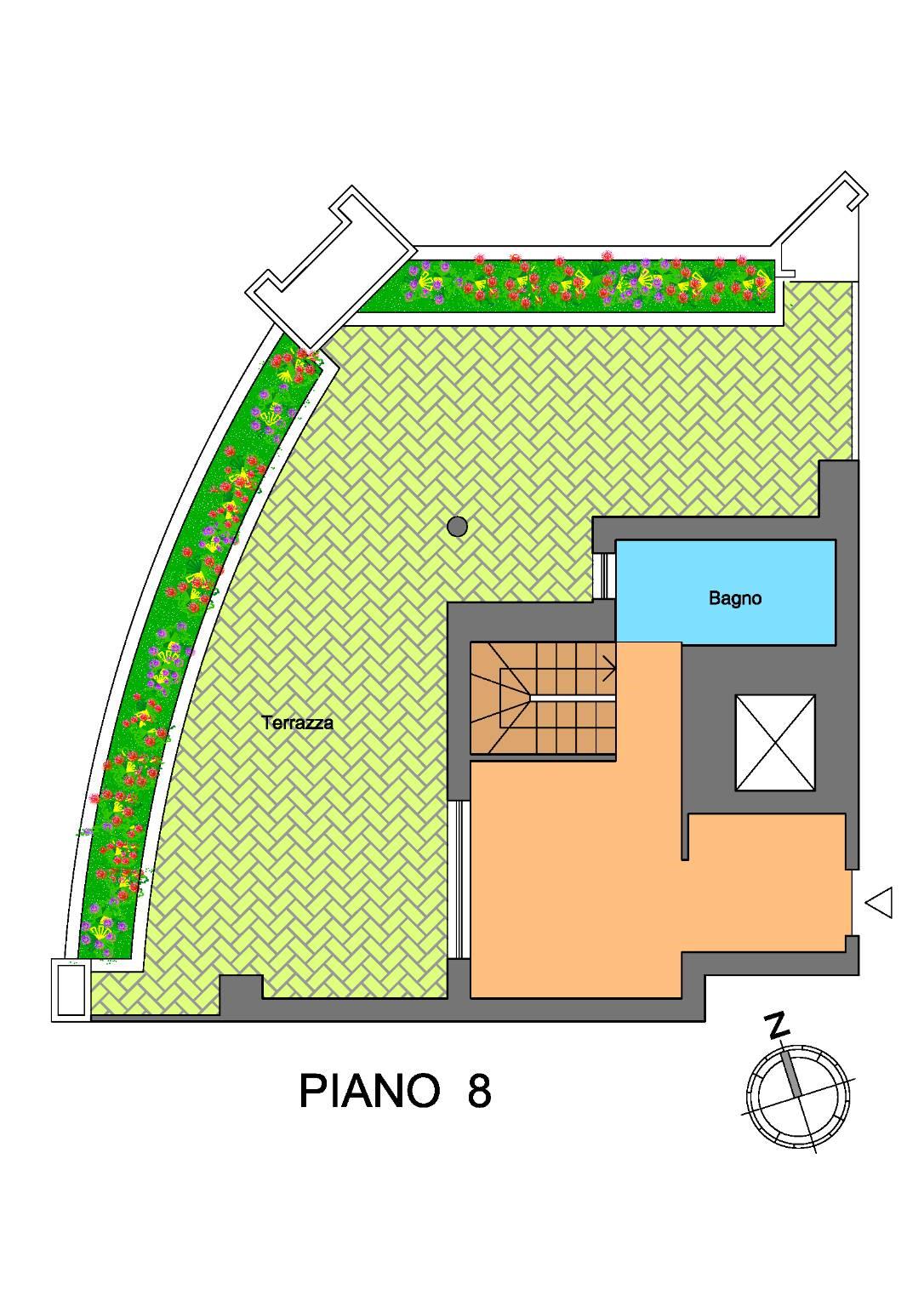 Salendo al piano superiore (superattico – piano 8) , si apre un angolo di quiete e libertà: una stanza intima, un bagno riservato e soprattutto un terrazzo di 57 mq. dotato di vasca idromassaggio e doccia ; un vero e proprio salotto a cielo aperto, dove lo sguardo si perde tra i tetti della città e l’aria si fa più leggera.