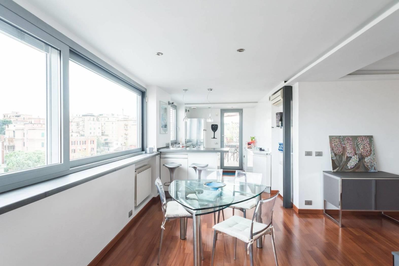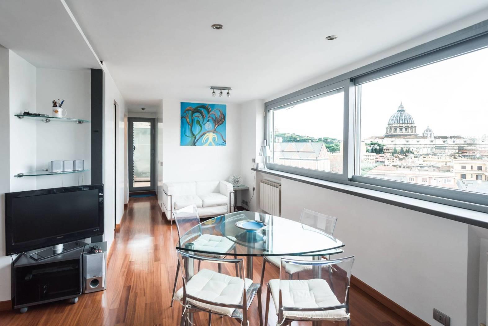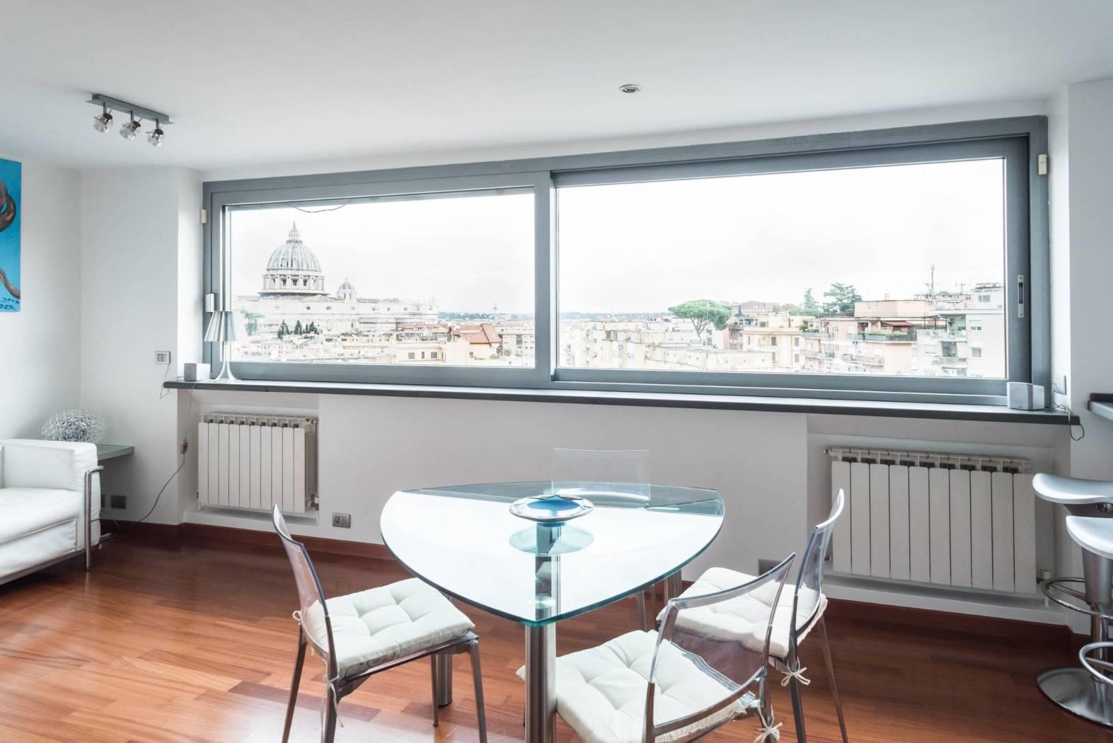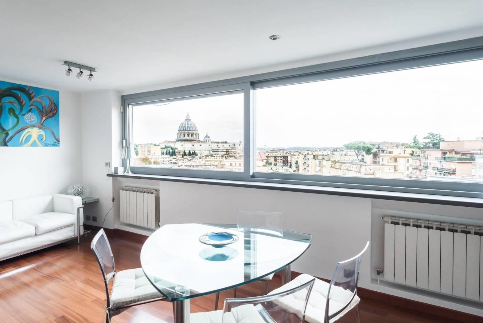 L’immobile è dotato di una spettacolare vista sulla città ed in particolare sulla cupola di San Pietro in quanto è caratterizzato da ampie vetrate a giorno che permettono di godere del panorama dalla quasi totalità degli ambienti della casa. Questa particolare caratteristica lo rende unico nel suo genere e gli conferisce fascino ed eleganza.