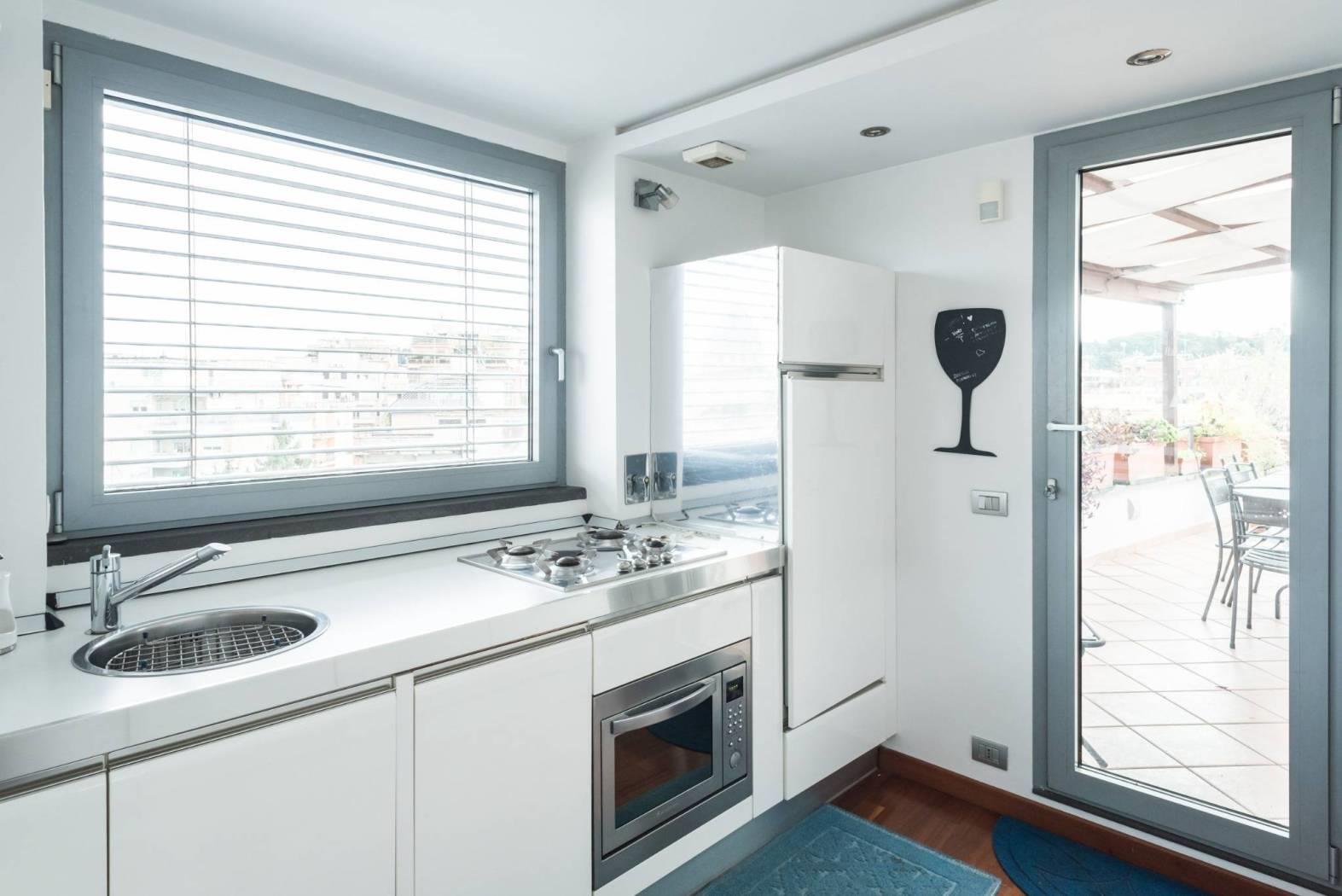 La cucina è dotata di tutti gli elettrodomestici: frigo e forno, lavastoviglie, piano cottura a gas.