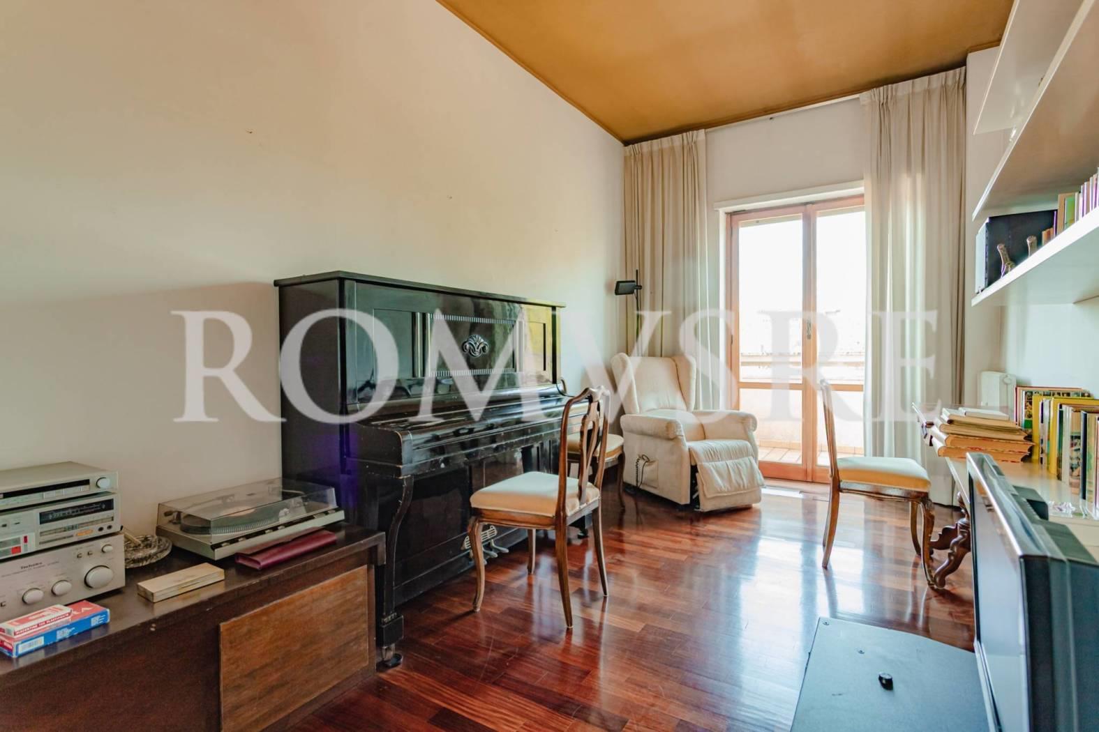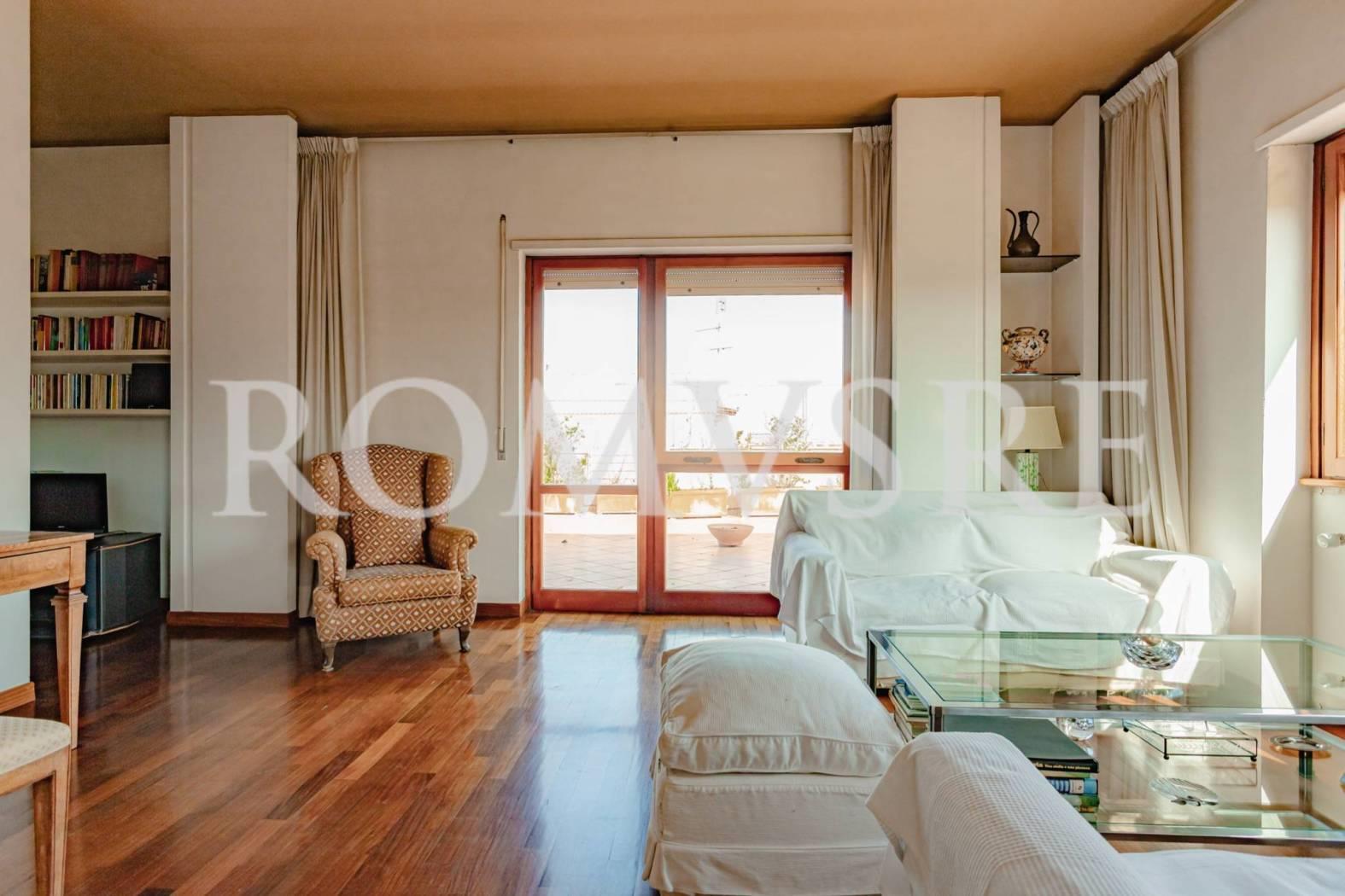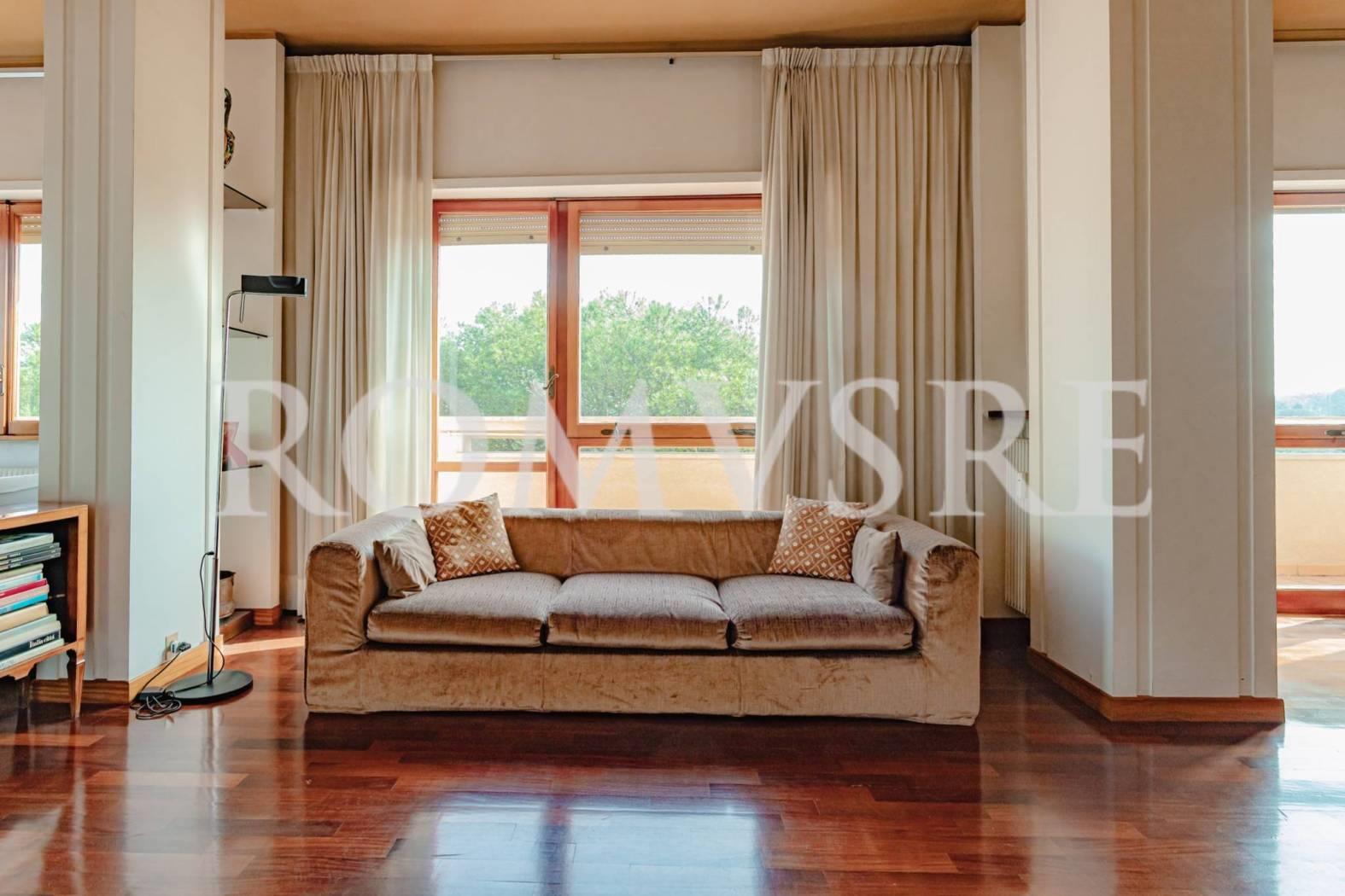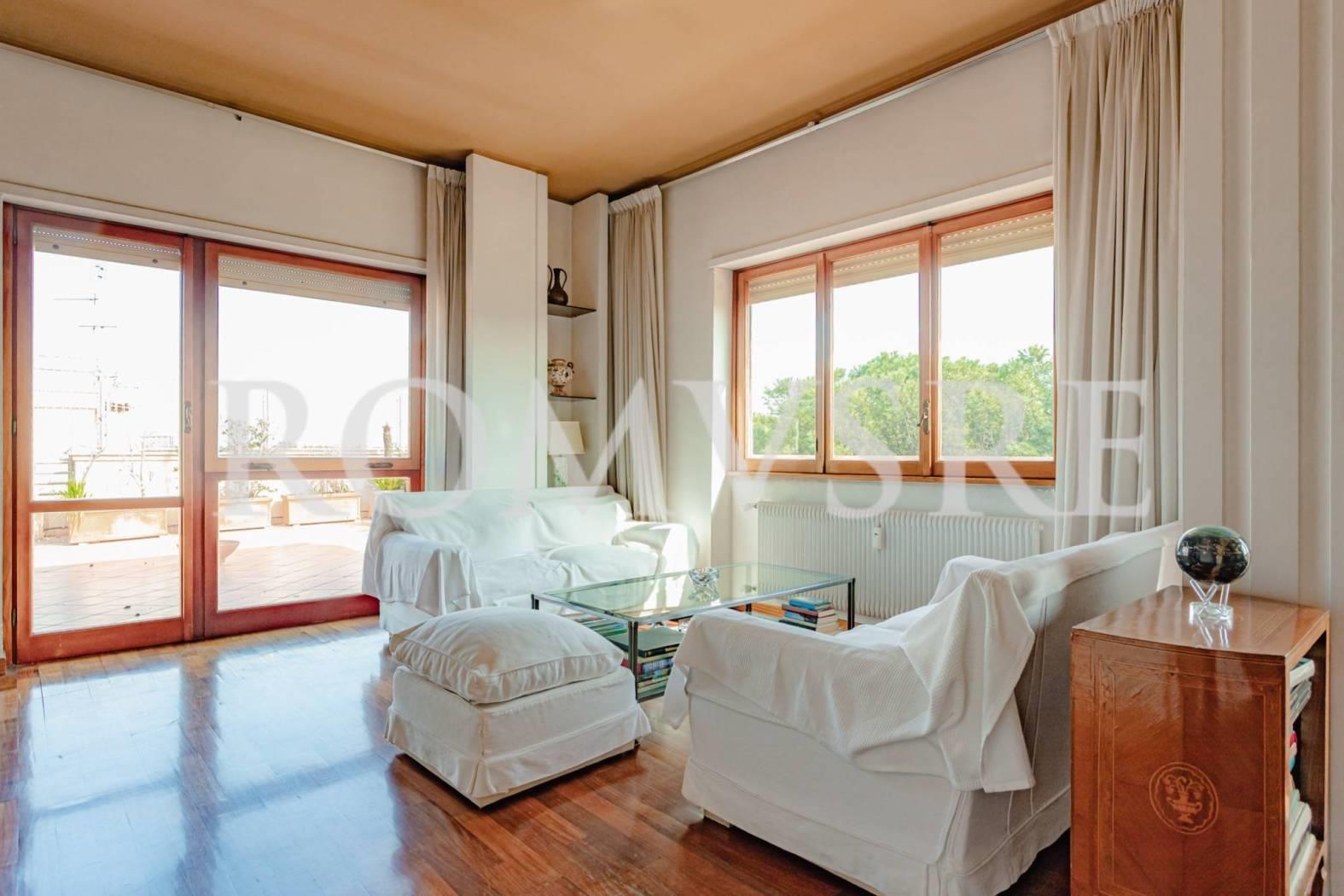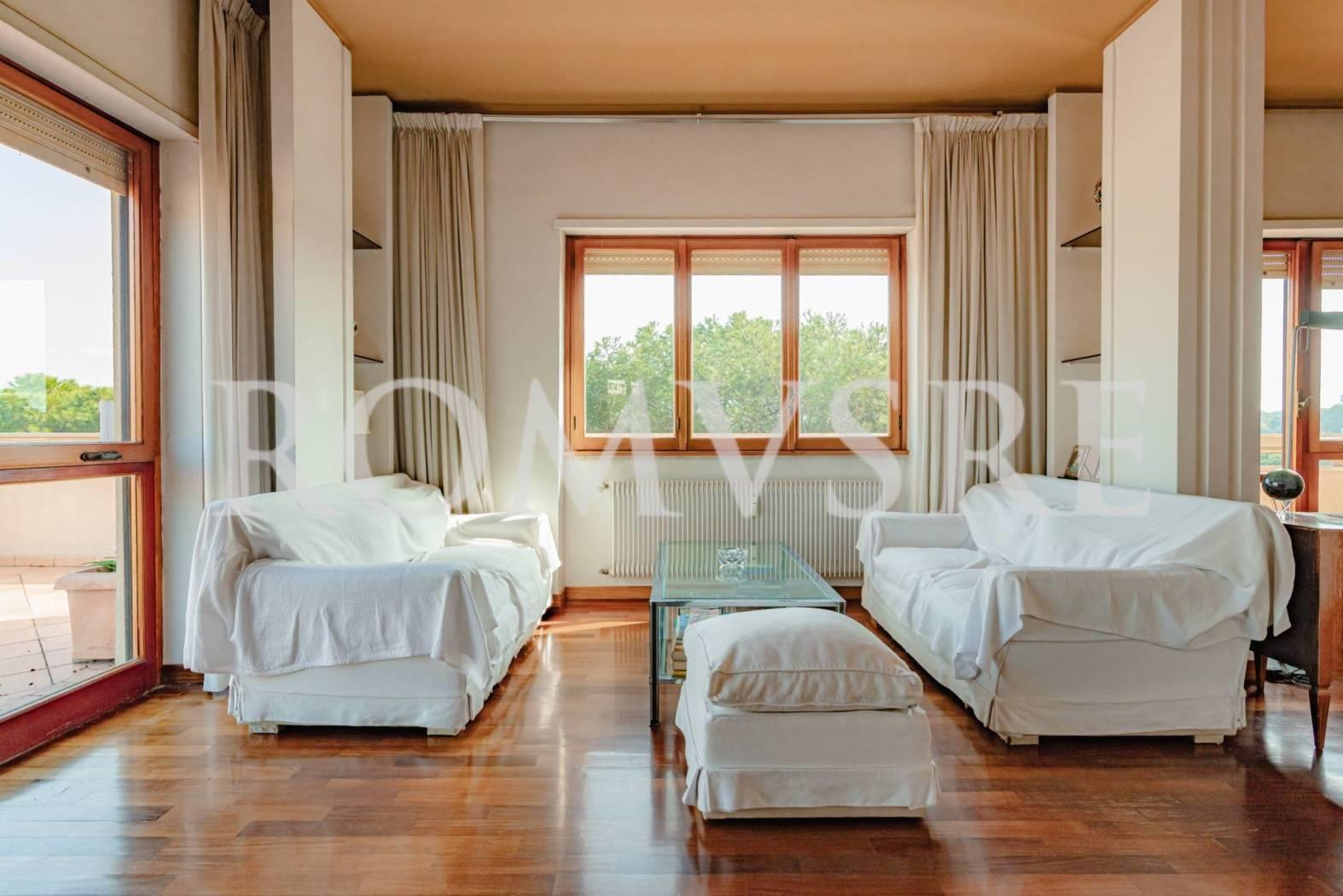 L’Attico in vendita a Roma Eur, nel quartiere Mostacciano, è posto al 5° piano di uno stabile signorile restaurato del 1974 in intonaco di 5, dotato di un ottimo servizio di portineria, ascensore e vasto parco comune.