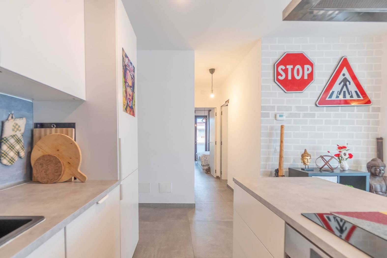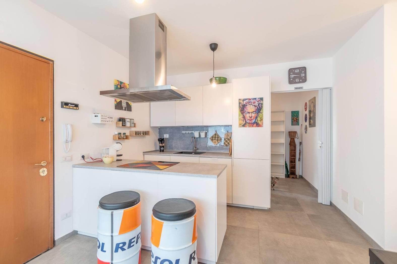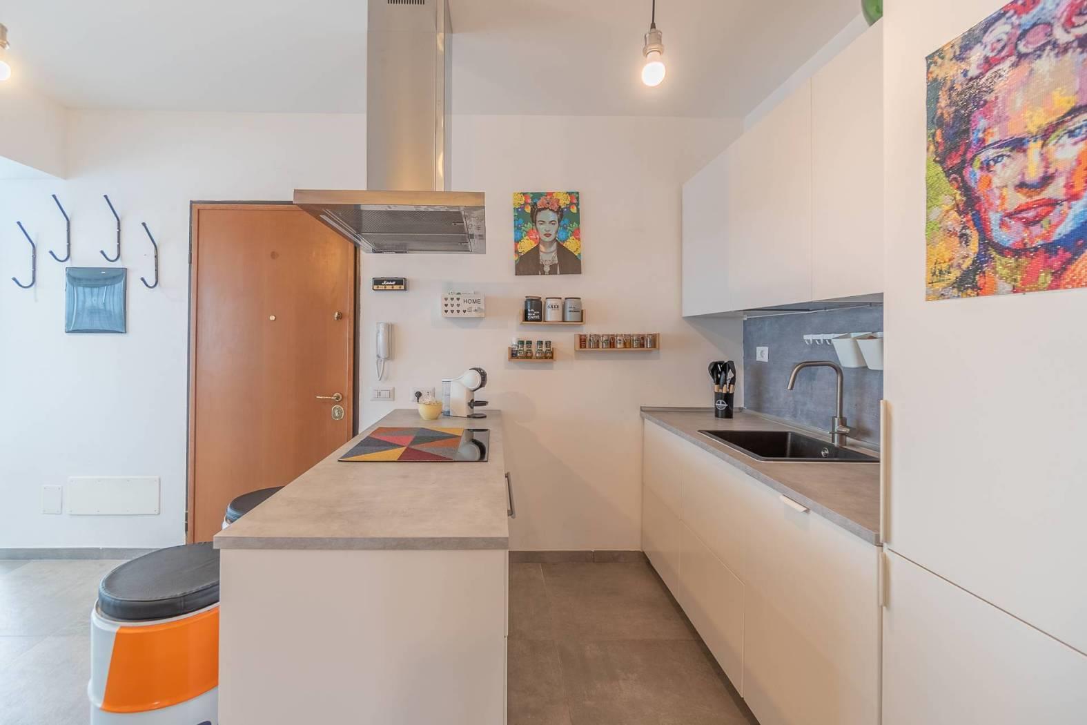 - Zona Living: Ingresso su un luminoso soggiorno con veranda integrata, un ambiente fluido che accoglie la luce naturale a ogni ora del giorno. La cucina a vista con penisola è moderna e funzionale, perfetta per chi ama la convivialità.