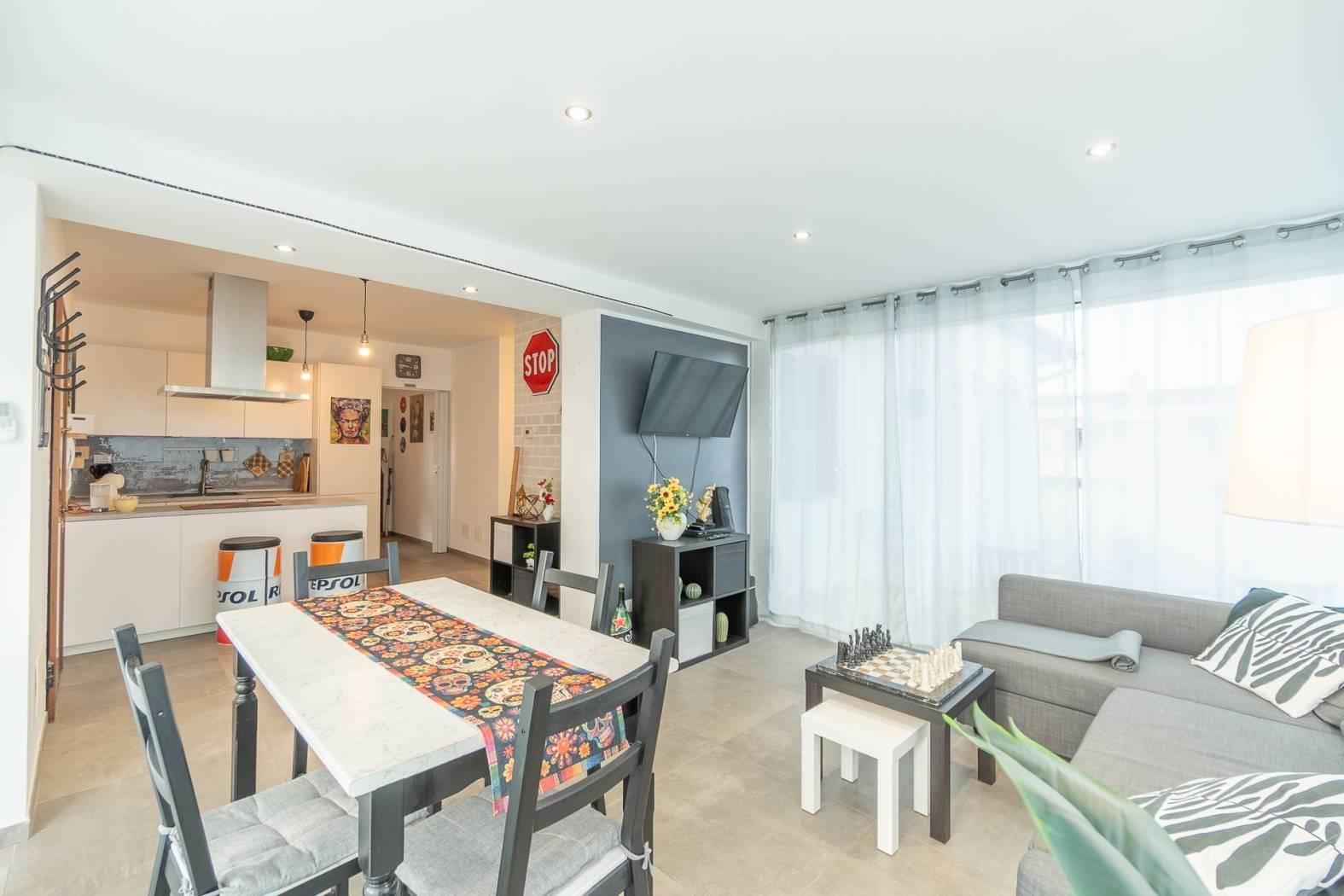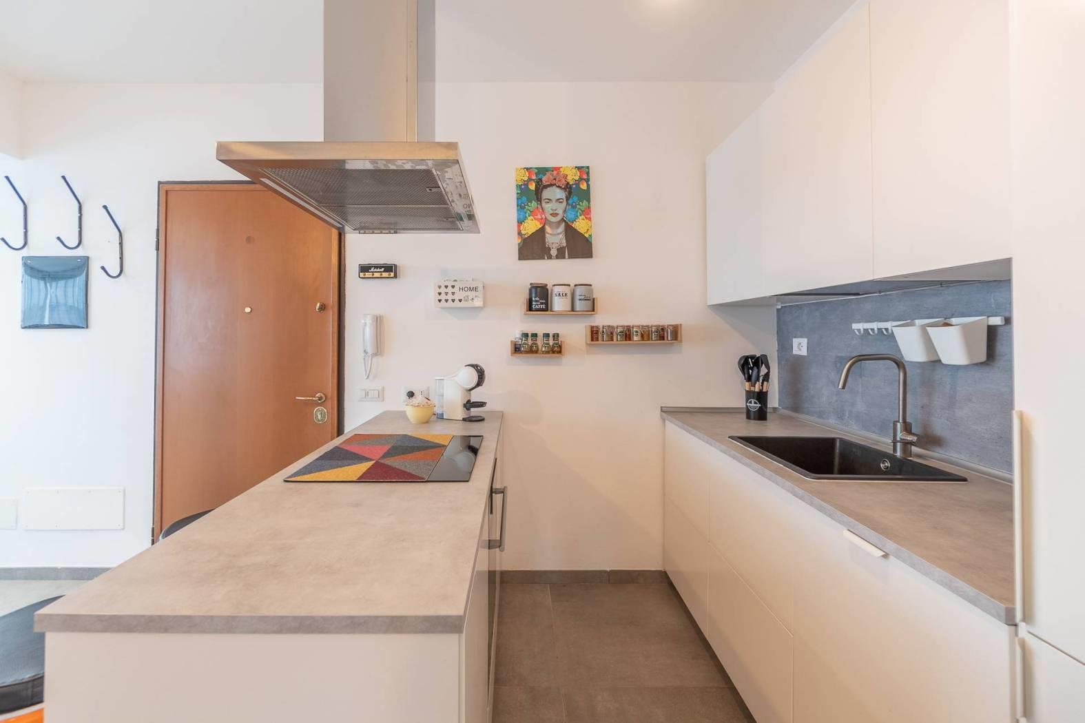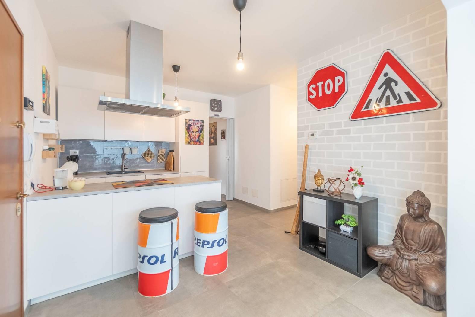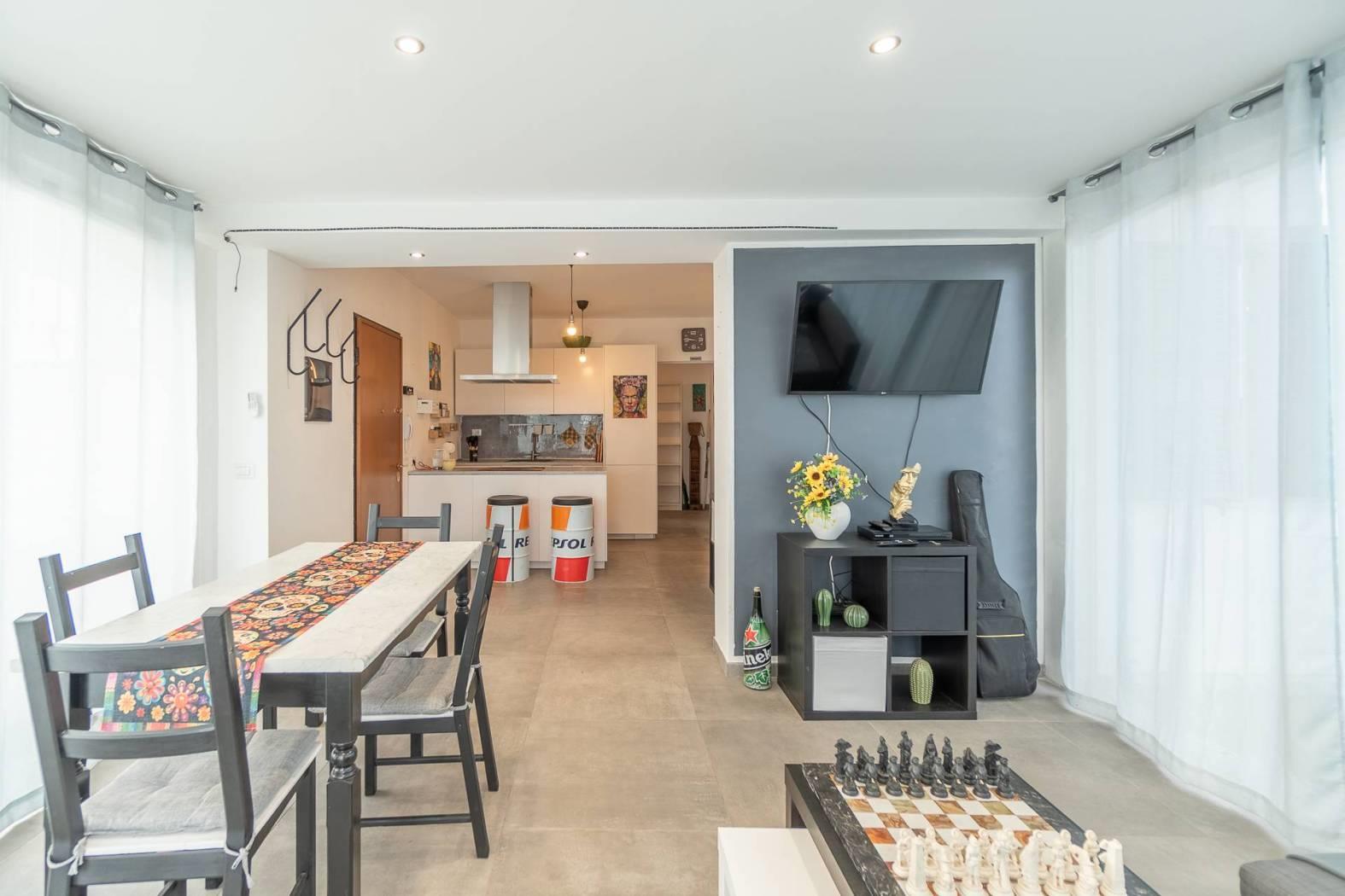- Zona Living: Ingresso su un luminoso soggiorno con veranda integrata, un ambiente fluido che accoglie la luce naturale a ogni ora del giorno. La cucina a vista con penisola è moderna e funzionale, perfetta per chi ama la convivialità.