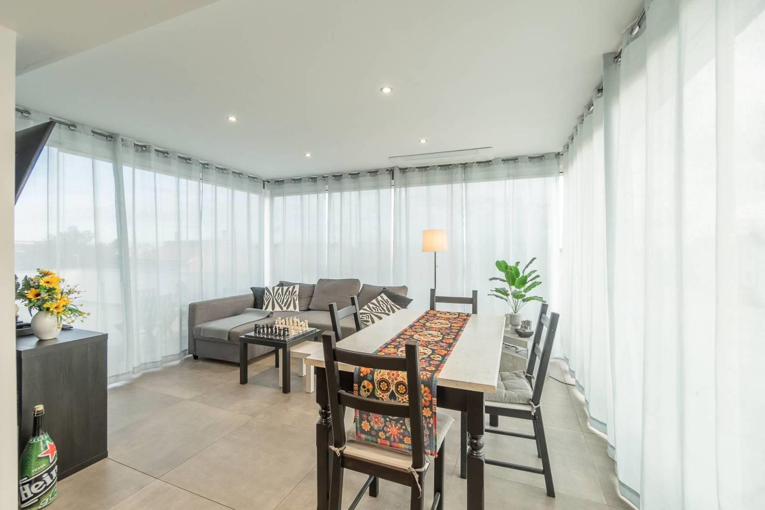 Il vero "plus" della casa è il grande terrazzo vivibile, una naturale estensione del soggiorno ideale per cene all'aperto e relax. Completa la proprietà il lastrico solare sovrastante, uno spazio solarium privato con vista panoramica.