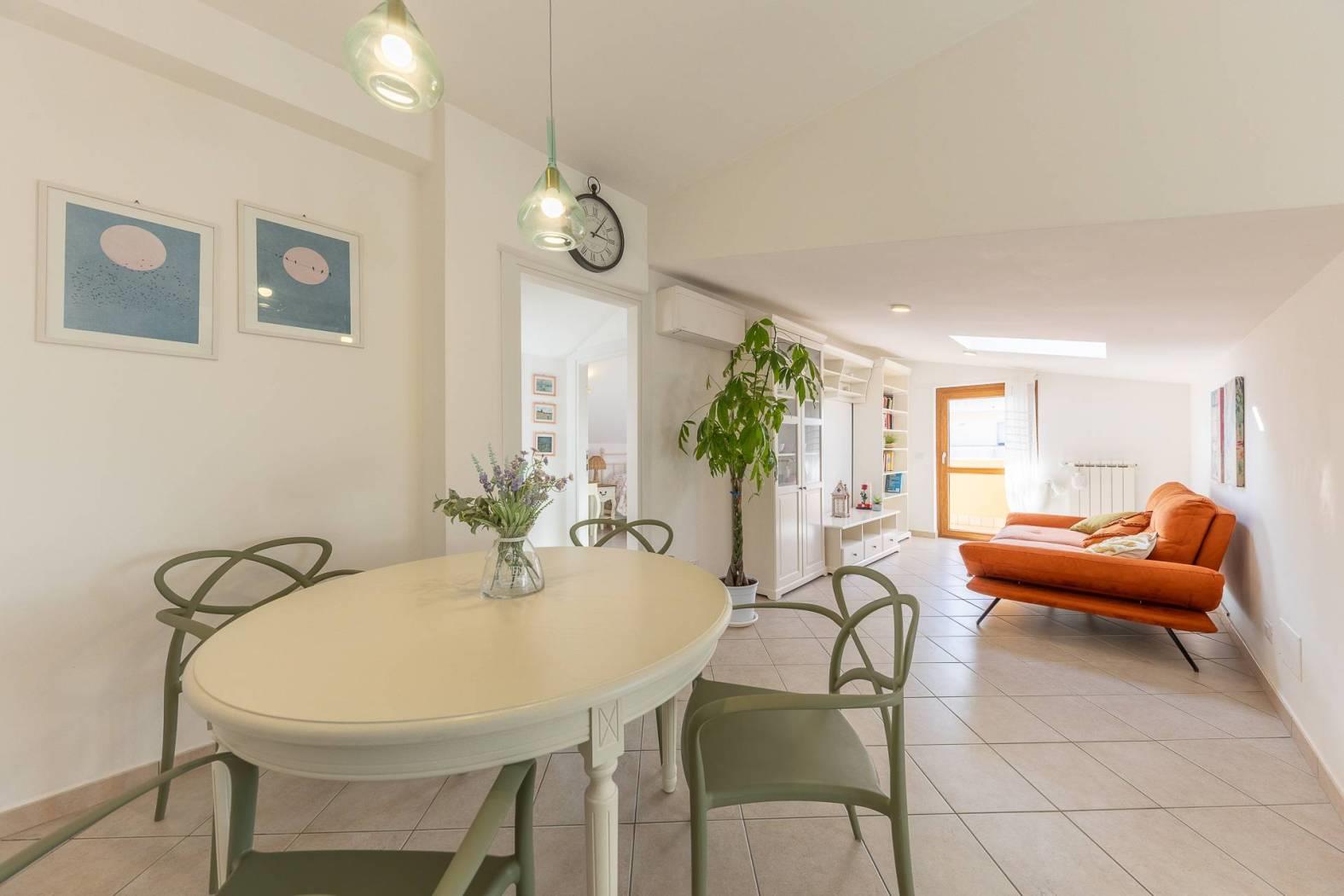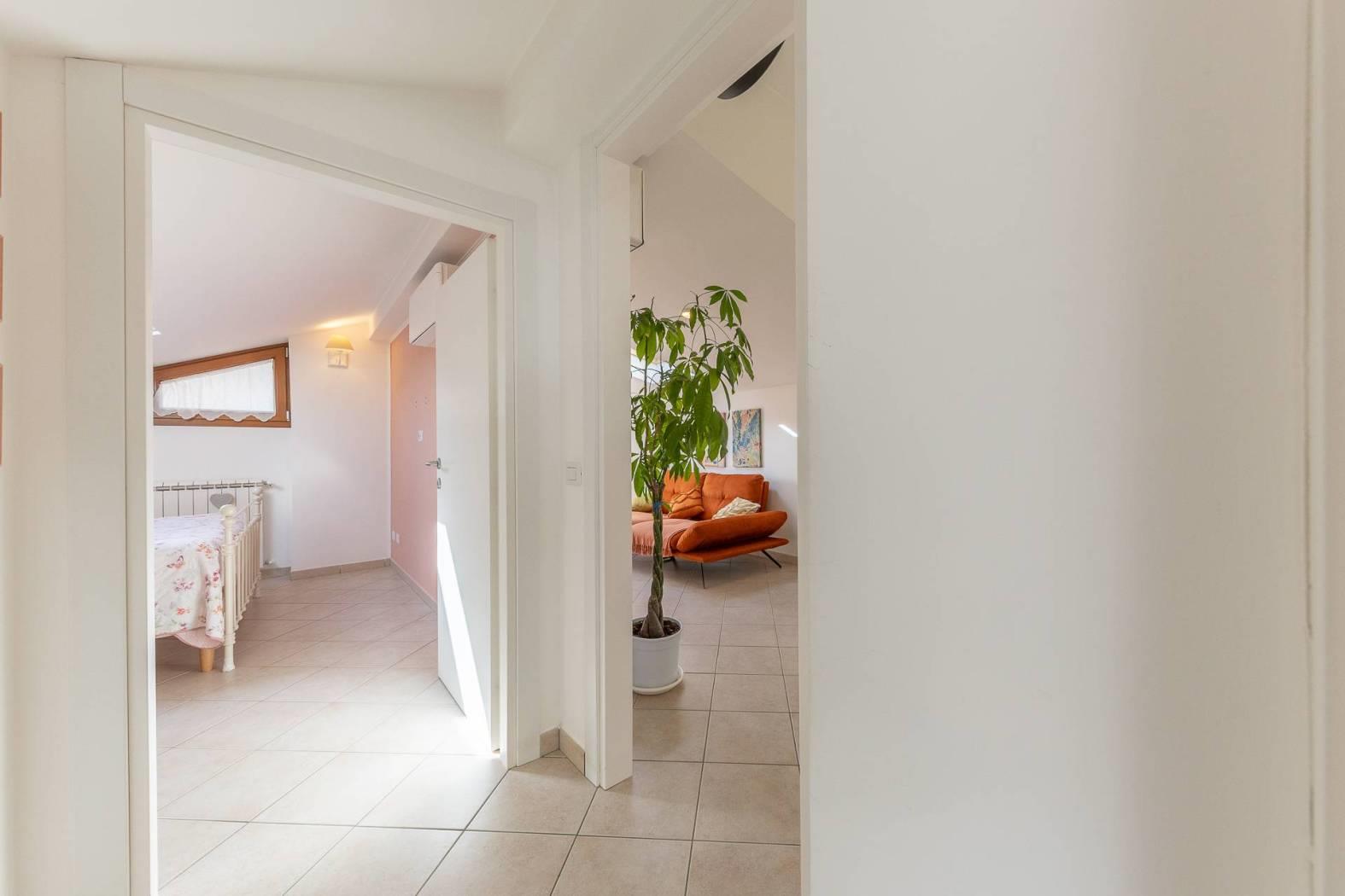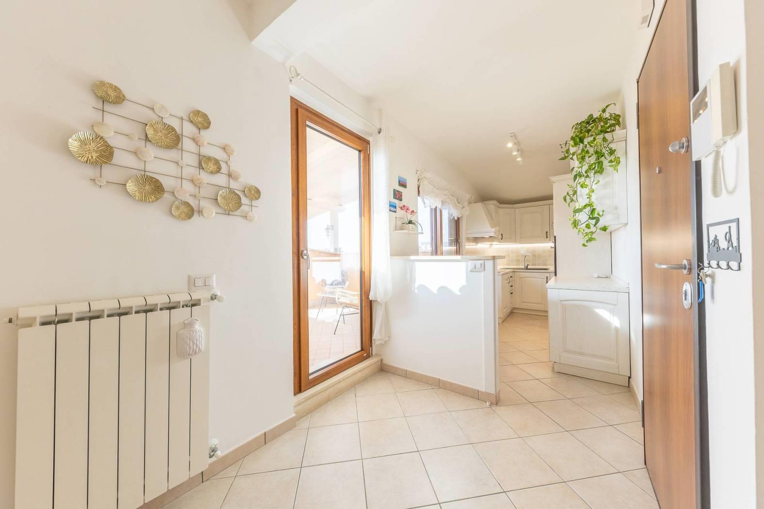L’immobile gode di una tripla esposizione (est, sud, ovest) che assicura una luminosità naturale durante tutta la giornata. L’ingresso si apre su un’accogliente zona giorno con soggiorno e cucina a vista. La cucina, servita da una porta finestra, si affaccia su un terrazzo vivibile, perfetto per pranzi all’aperto o momenti di relax, mentre il soggiorno ha un ulteriore accesso a un balcone.