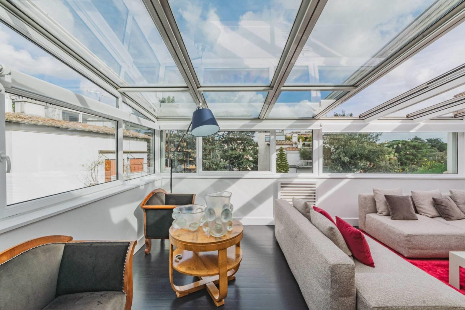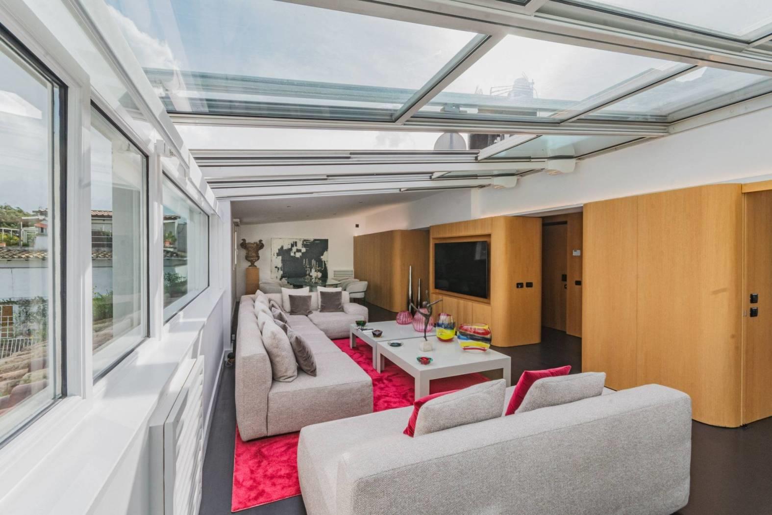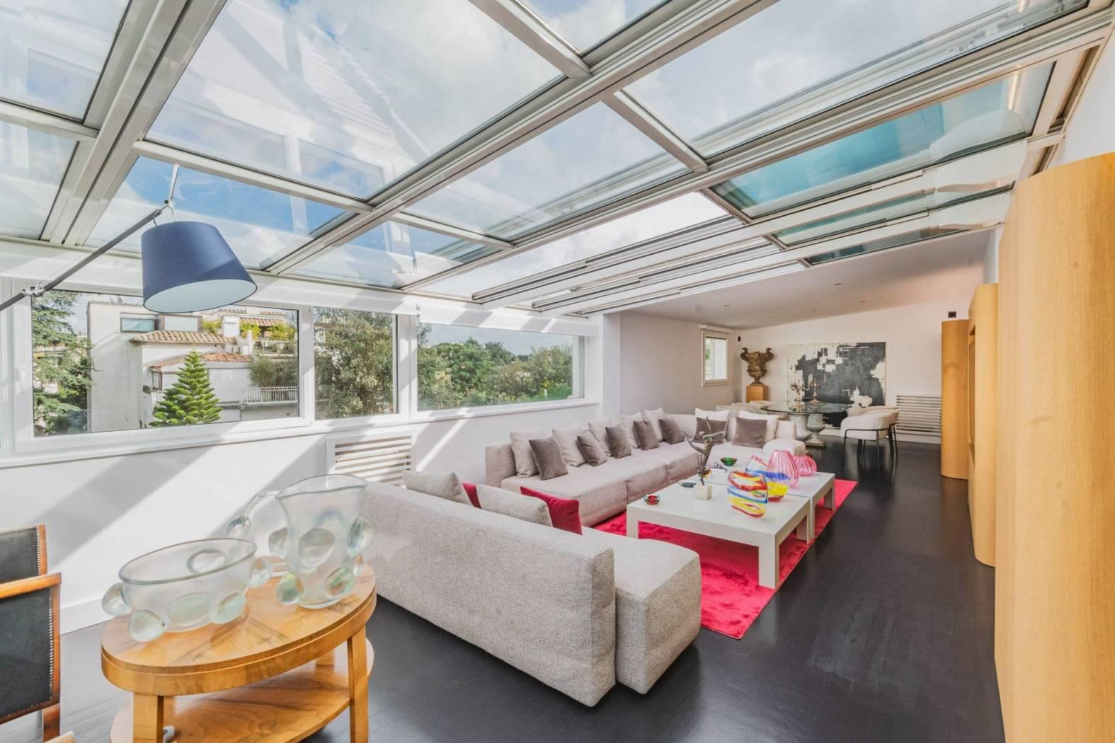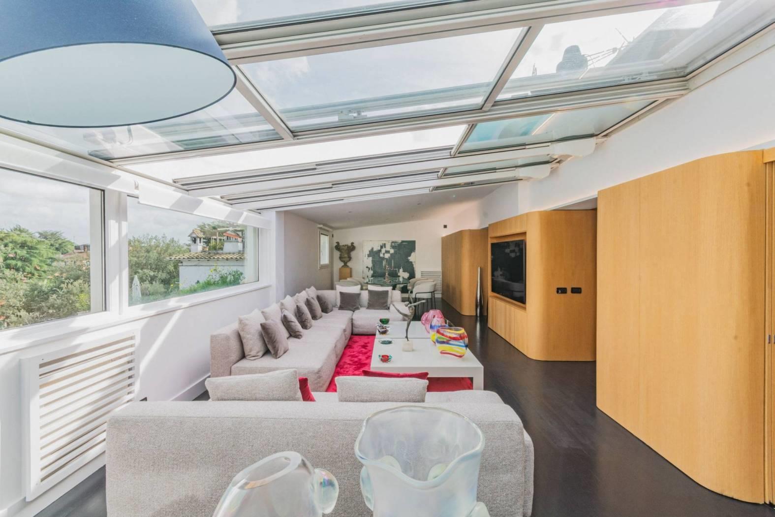 Un salone doppio monumentale, dove il soffitto diventa cielo grazie alle vetrate motorizzate in alluminio. Aprirle in estate significa trasformare il living in un patio ventilato; chiuderle significa godersi la pioggia o le stelle nel silenzio totale dei doppi infissi.