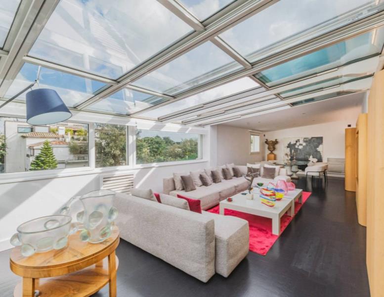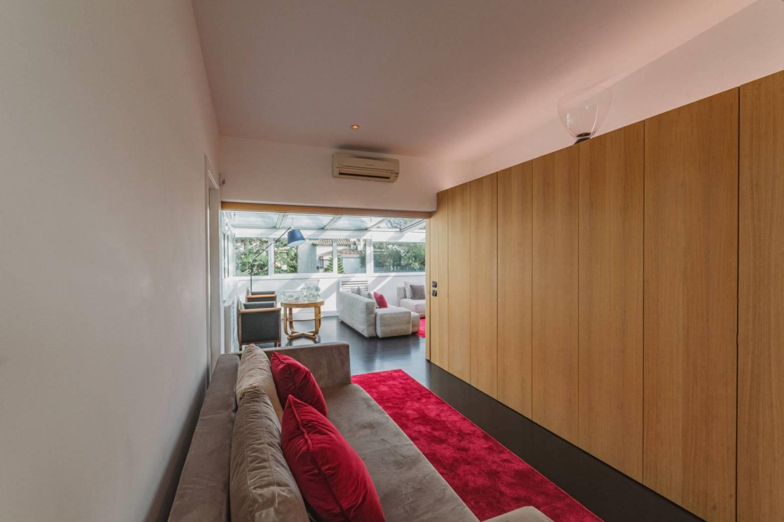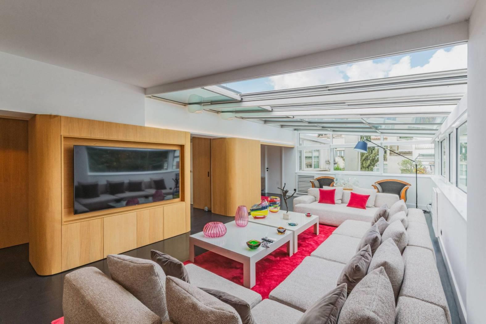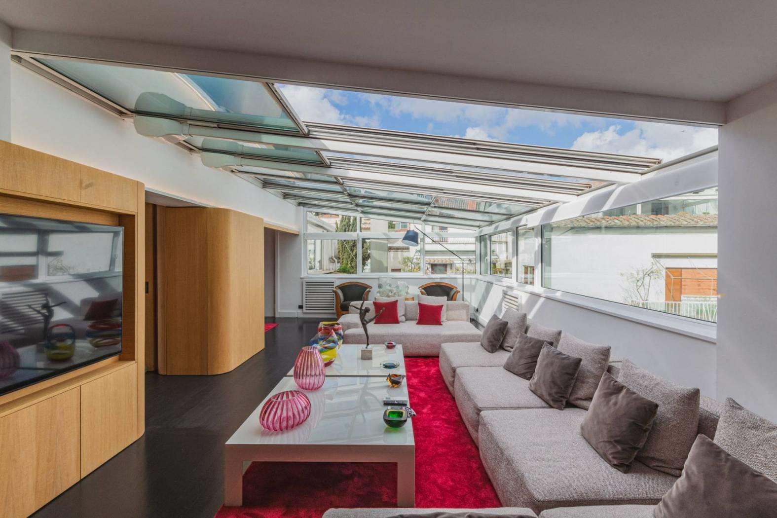 Un salone doppio monumentale, dove il soffitto diventa cielo grazie alle vetrate motorizzate in alluminio. Aprirle in estate significa trasformare il living in un patio ventilato; chiuderle significa godersi la pioggia o le stelle nel silenzio totale dei doppi infissi.