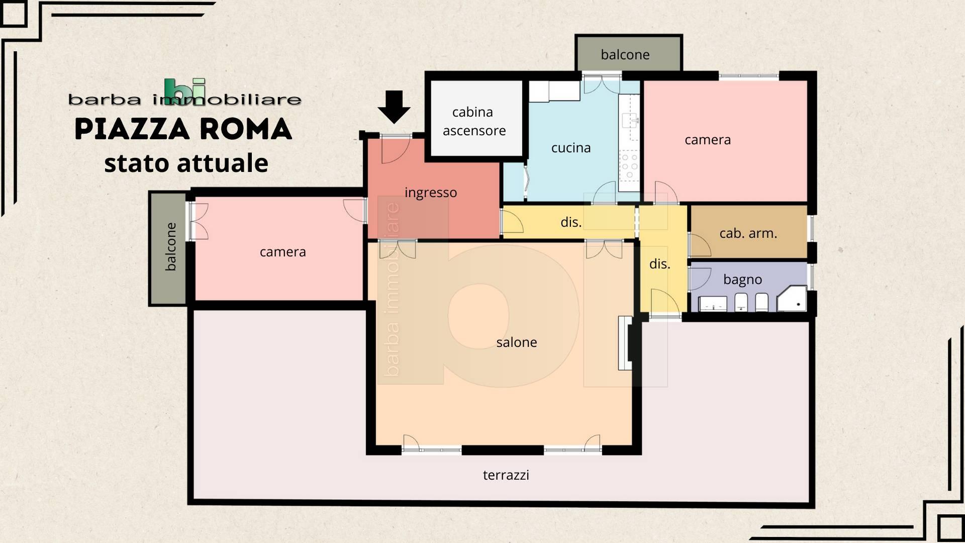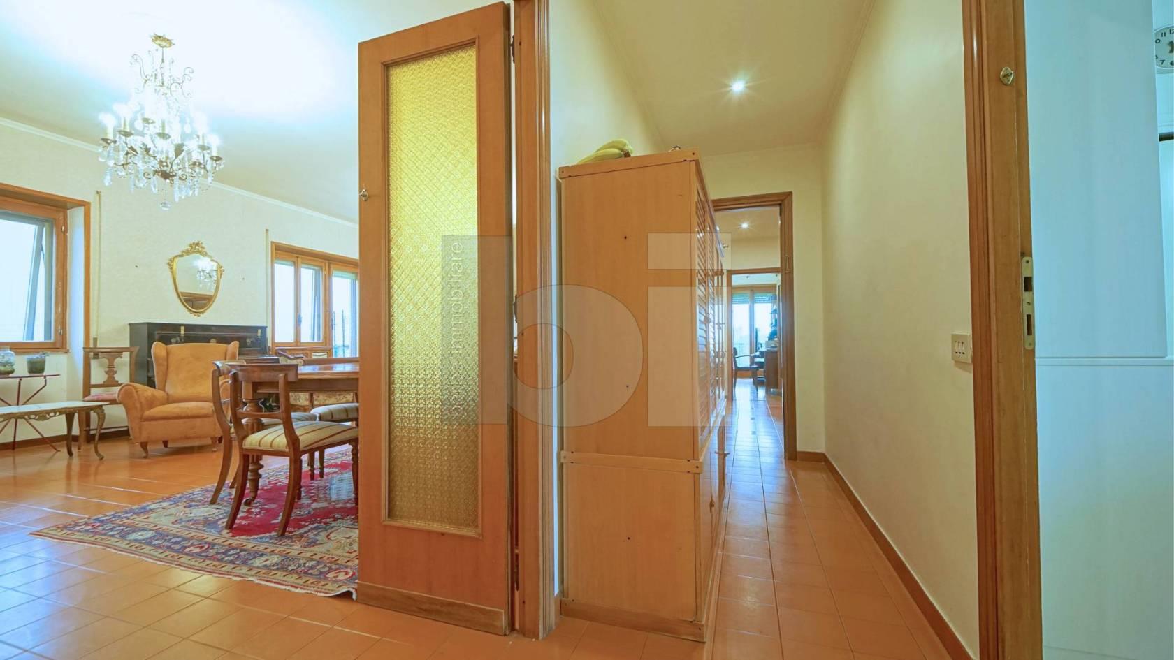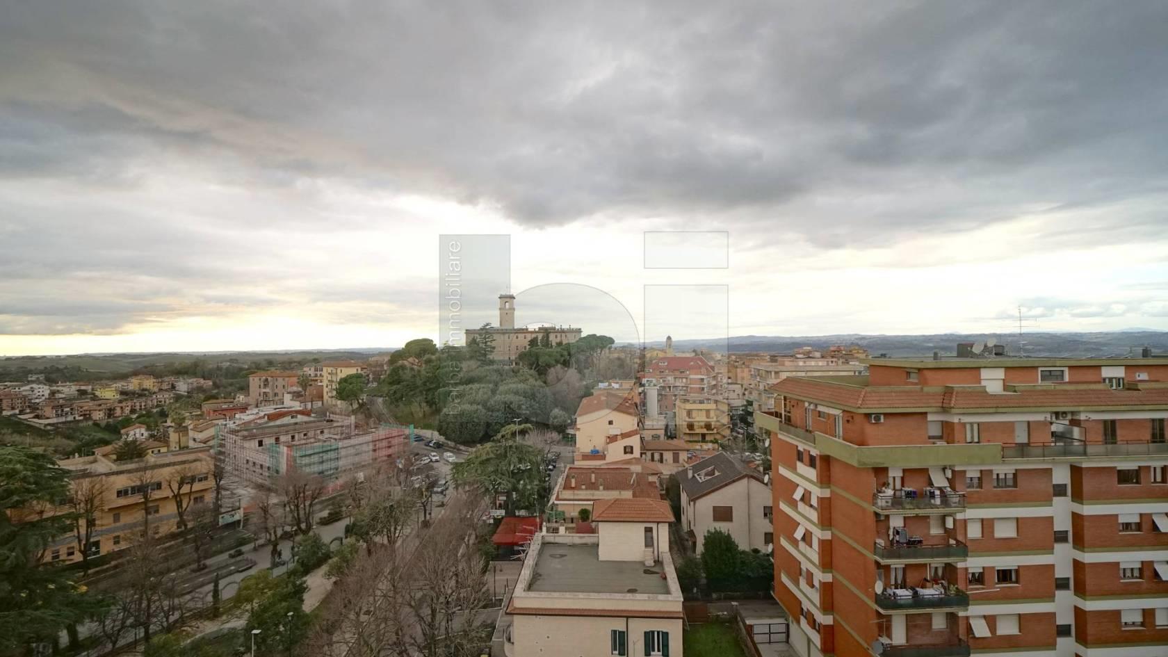 PIAZZA ROMA – Nel cuore di Monterotondo, a due passi da tutti i servizi, proponiamo in vendita luminoso attico di ampia metratura con 4 esposizioni composto da: ingresso, salone doppio di circa 47 mq con camino ed accesso ad oltre 65 mq di terrazzi panoramici, cucina abitabile con balcone di servizio e camino per cucinare, bagno finestrato con doccia, 2 camere matrimoniali, ripostiglio/cabina armadio. Riscaldamento autonomo, aria condizionata, parquet nella zona notte, doppie finestre (alluminio doppio vetro e legno vetro singolo) tapparelle, porta blindata, impianto di allarme e videosorveglianza, ascensore, soffitti alti e molto altro. L’immobile si trova all’ottavo ed ultimo piano di stabile in cortina in buone condizioni. Gli impianti, rivestimenti ed infissi sono dell’epoca di costruzione. Vista l’ampia metratura e le 4 esposizioni, si suggeriscono possibili ridistribuzioni degli ambienti interni.
