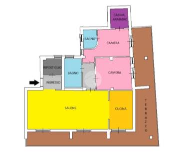 L'immobile, arricchito da grande terrazzo perimetrale di mq 110 è composto da ingresso, soggiorno con angolo cottura, due camere da letto matrimoniali e due bagni arredati .