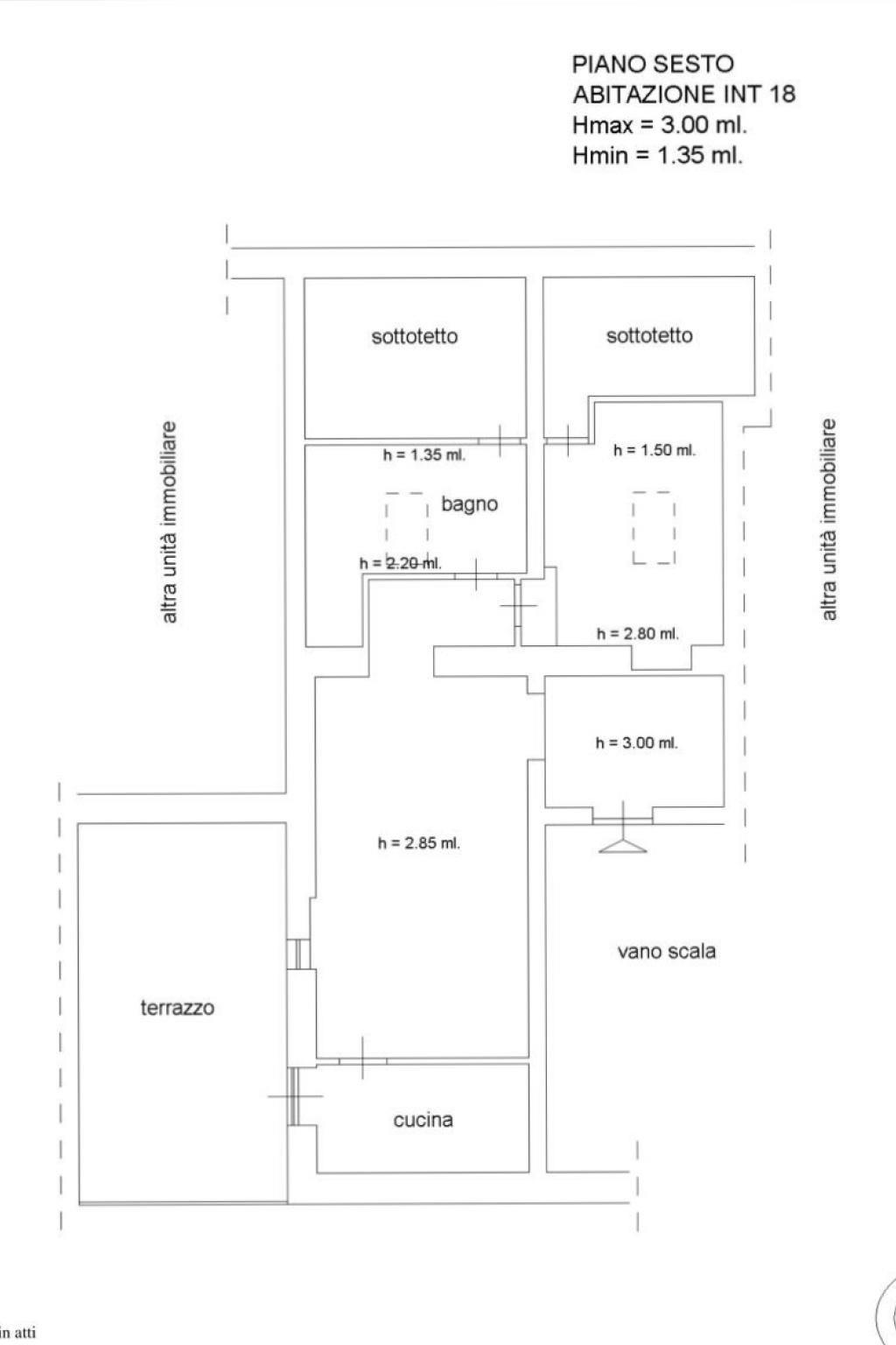 L'altezza dei soffitti è di 3 metri meno che in alcuni punti dove l'altezza di 2.80 metri.