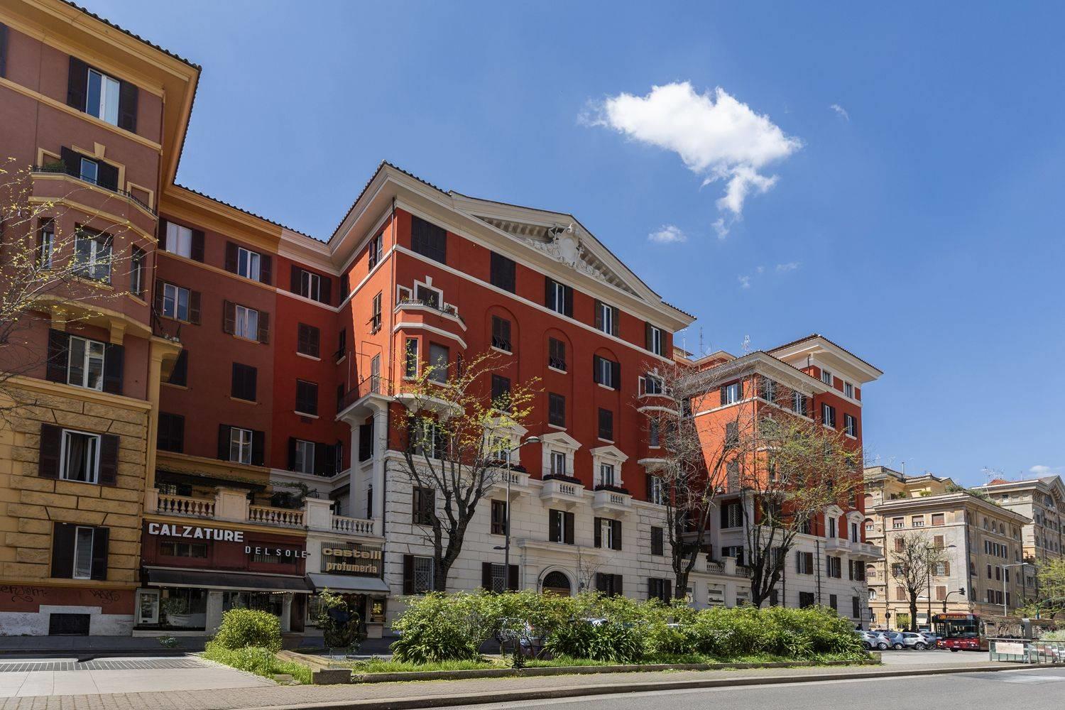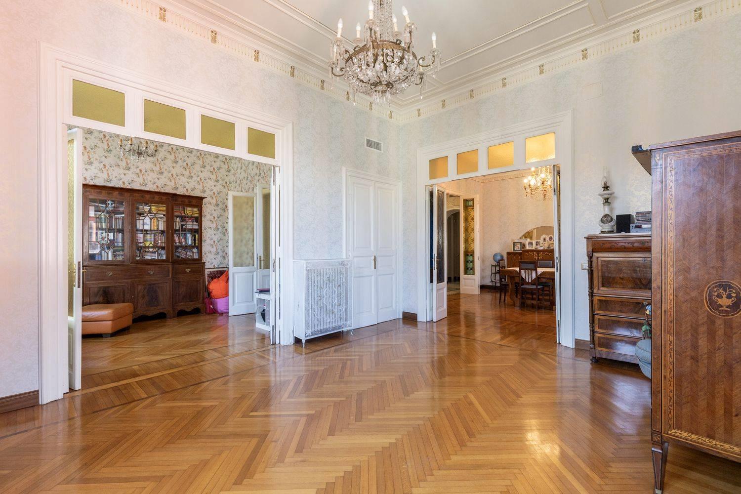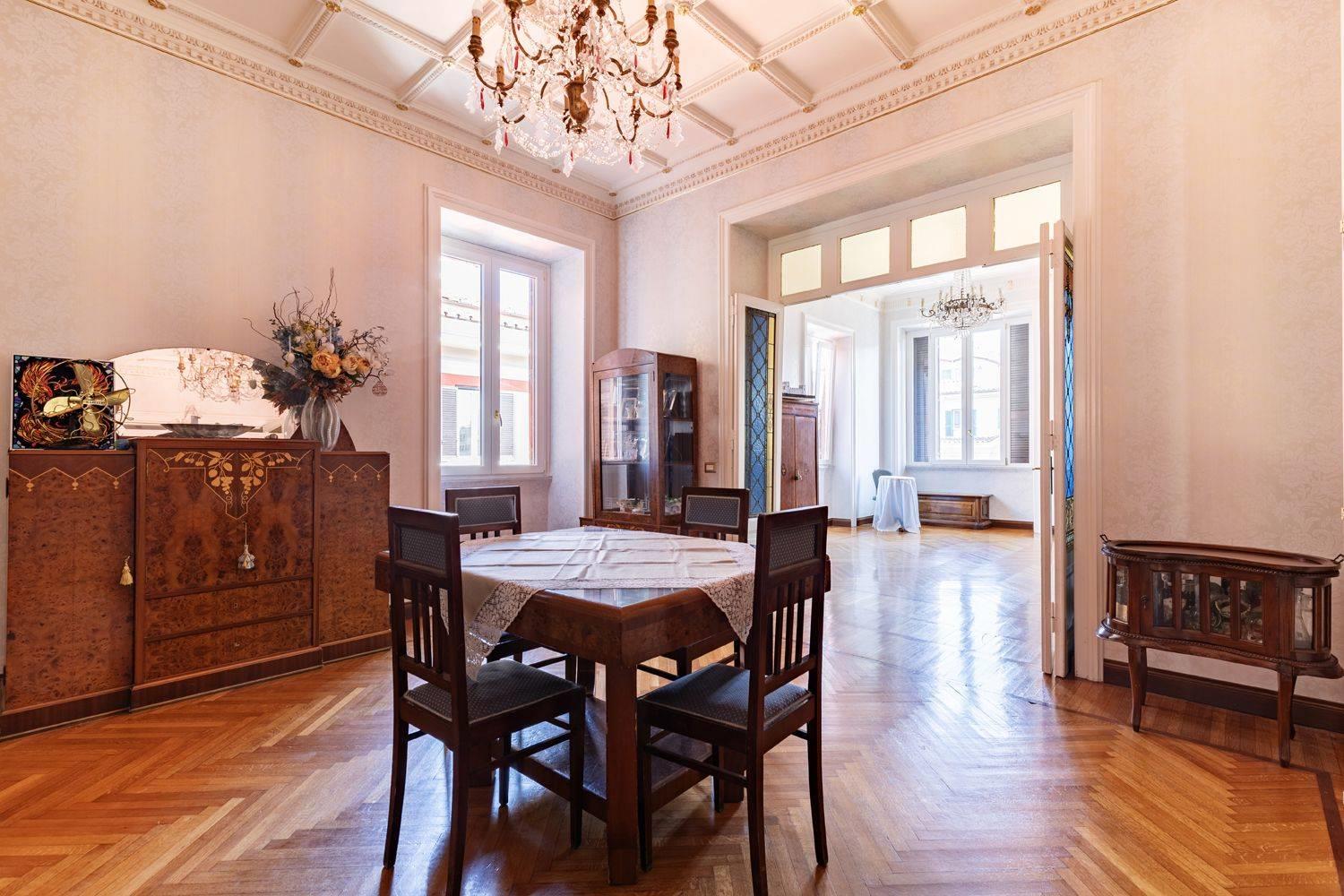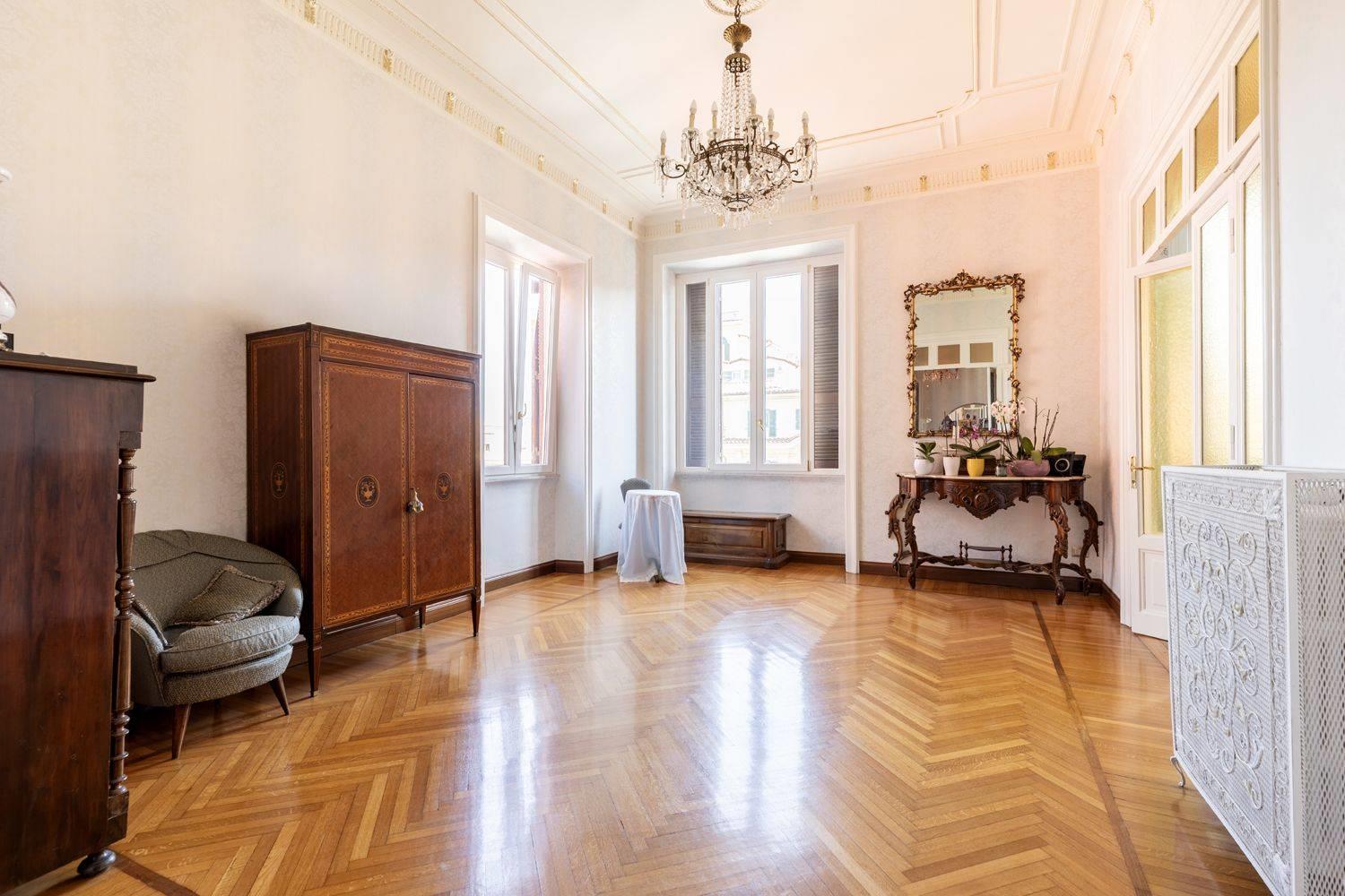 PRATI - Ad. P.ZZA MAZZINI. In un palazzo d'epoca dei primi del '900 da poco restaurato interamente, in contesto signorile ed elegante con servizio di portineria e ascensore, proponiamo in vendita questo bellissimo appartamento posto al 5° ed ultimo piano, molto luminoso e di alta rappresentanza. L'immobile si compone di doppi ingressi (attualmente uno è stato chiuso dall'interno); la zona giorno, con piacevoli affacci su Via Oslavia, conta attualmente 4 grandi ambienti da adibire a seconda delle esigenze (camera da pranzo, studio ecc.); tramite due corridoi ci si collega alla zona notte attualmente composta di 5 camere da letto padronali, di cui due molto ampie e due più piccole, servite da tre bagni, e la quinta può essere anche destinata al servizio; la cucina posizionata nei pressi dell'ingresso principale è abitabile con un ampio ripostiglio e un balcone con affaccio sul cortile interno. L'appartamento è stato ristrutturato recentemente e sono stati volutamente mantenuti e restaurati i pavimenti dell'epoca e altri dettagli, inoltre è stato installato un impianto di condizionamento centralizzato con appositi controsoffitti.