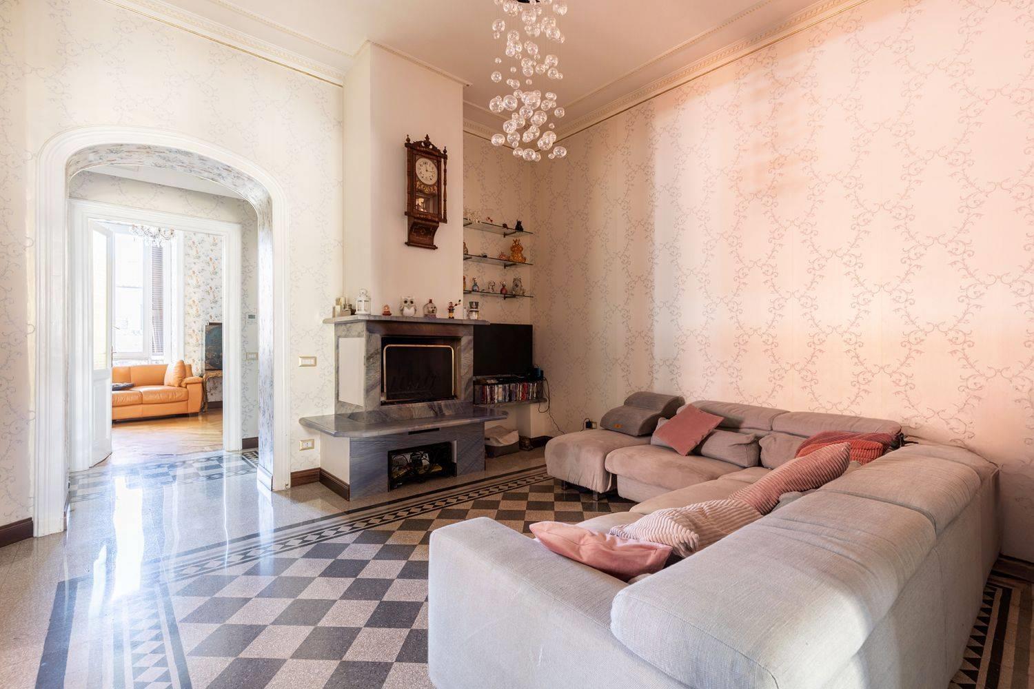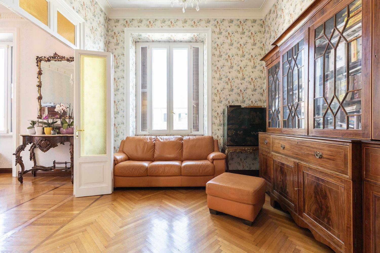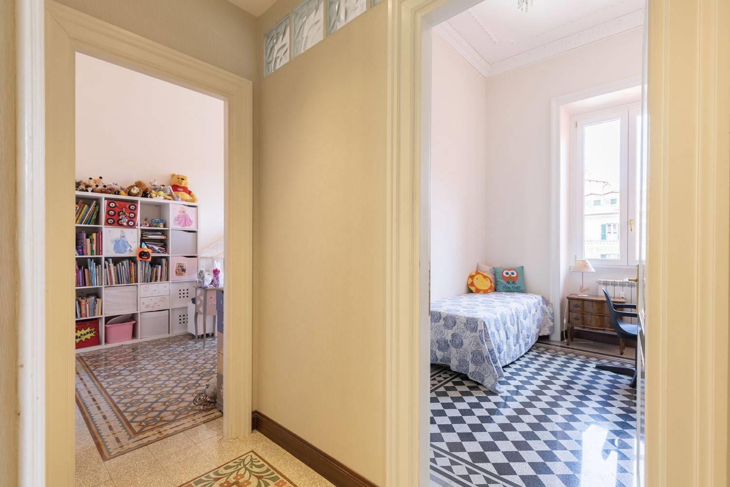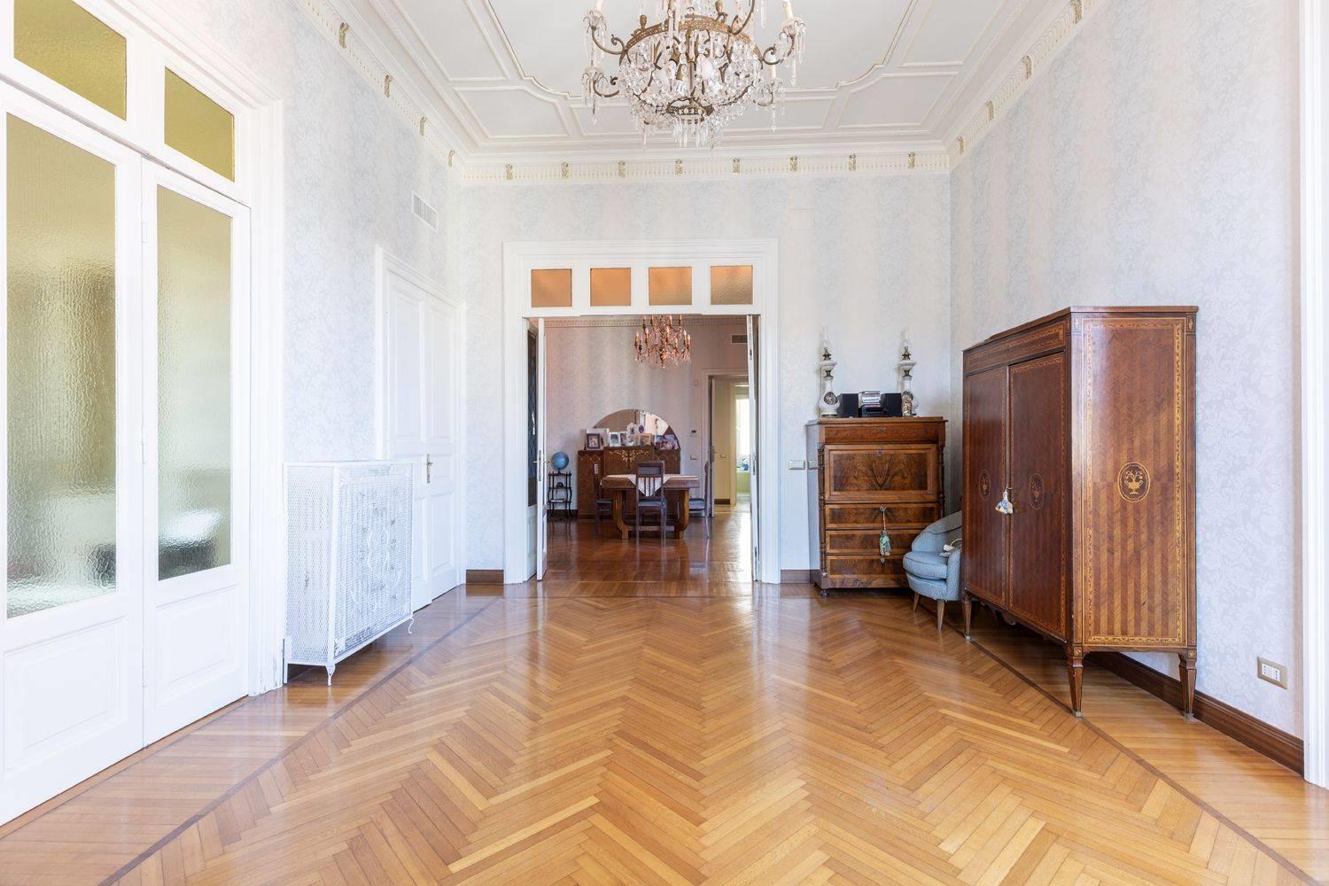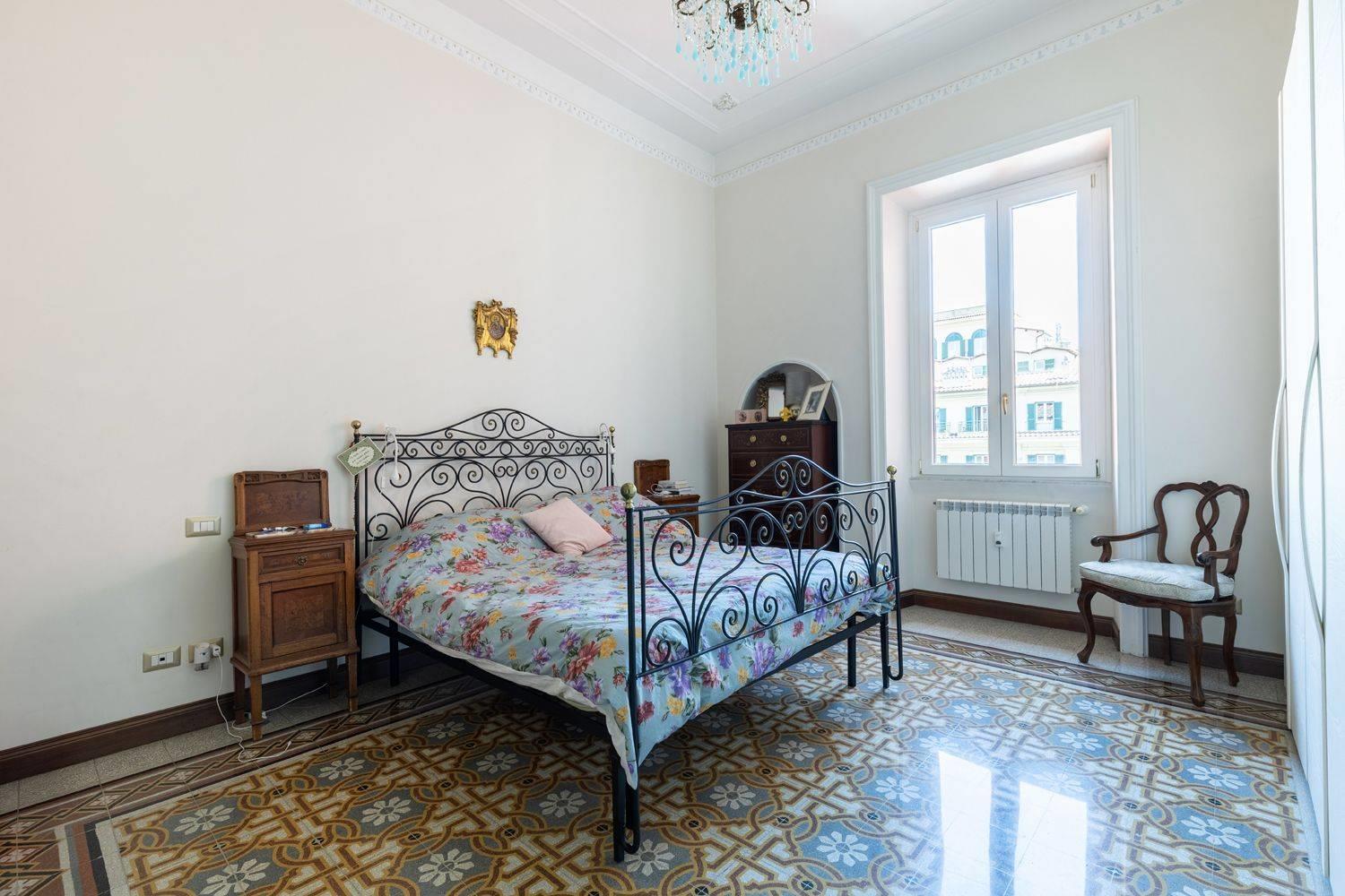 PRATI - Ad. P.ZZA MAZZINI. In un palazzo d'epoca dei primi del '900 da poco restaurato interamente, in contesto signorile ed elegante con servizio di portineria e ascensore, proponiamo in vendita questo bellissimo appartamento posto al 5° ed ultimo piano, molto luminoso e di alta rappresentanza. L'immobile si compone di doppi ingressi (attualmente uno è stato chiuso dall'interno); la zona giorno, con piacevoli affacci su Via Oslavia, conta attualmente 4 grandi ambienti da adibire a seconda delle esigenze (camera da pranzo, studio ecc.); tramite due corridoi ci si collega alla zona notte attualmente composta di 5 camere da letto padronali, di cui due molto ampie e due più piccole, servite da tre bagni, e la quinta può essere anche destinata al servizio; la cucina posizionata nei pressi dell'ingresso principale è abitabile con un ampio ripostiglio e un balcone con affaccio sul cortile interno. L'appartamento è stato ristrutturato recentemente e sono stati volutamente mantenuti e restaurati i pavimenti dell'epoca e altri dettagli, inoltre è stato installato un impianto di condizionamento centralizzato con appositi controsoffitti.