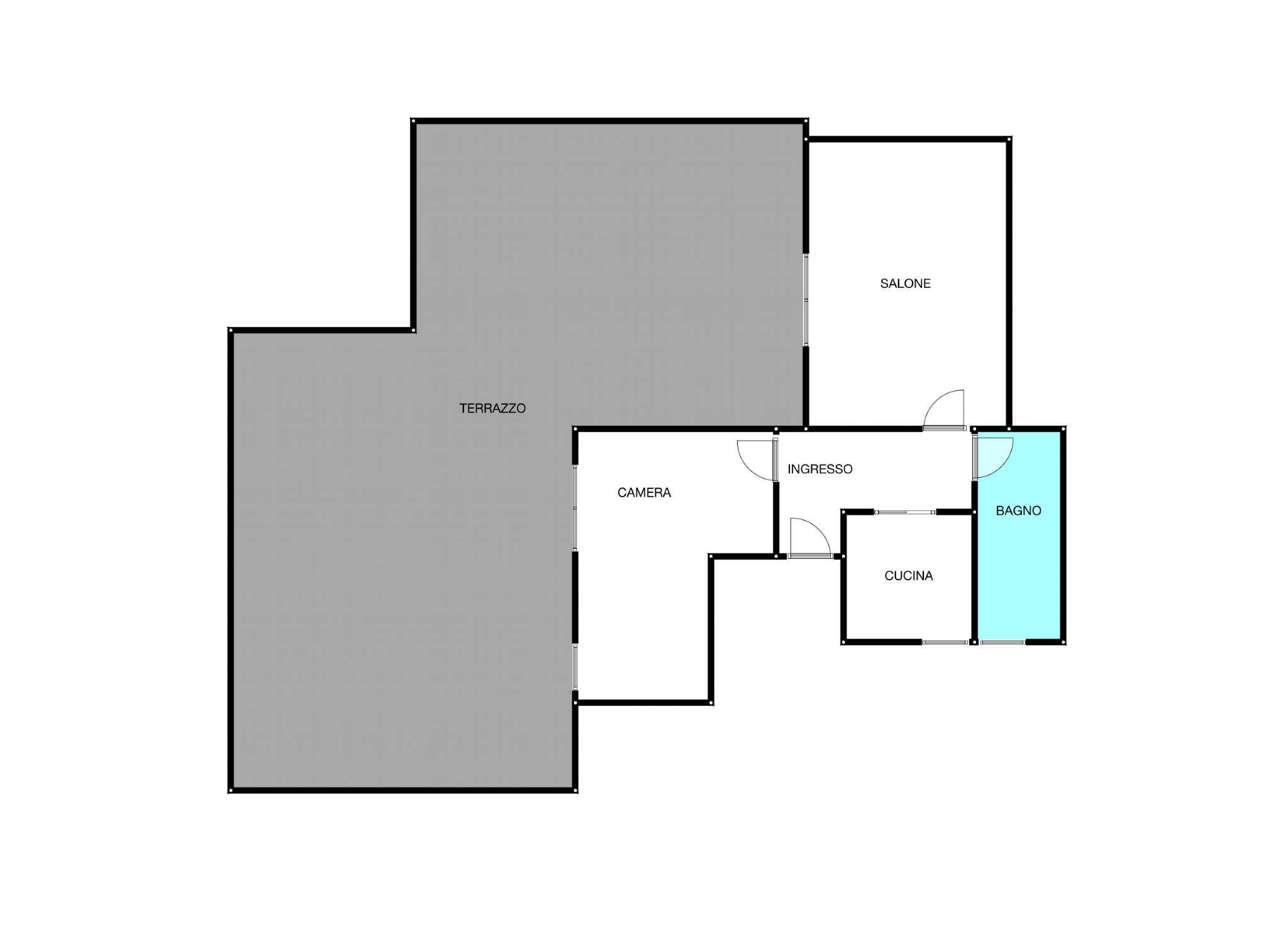 Sia il salone che la camera hanno accesso diretto all’ampio terrazzo di circa MQ 90.