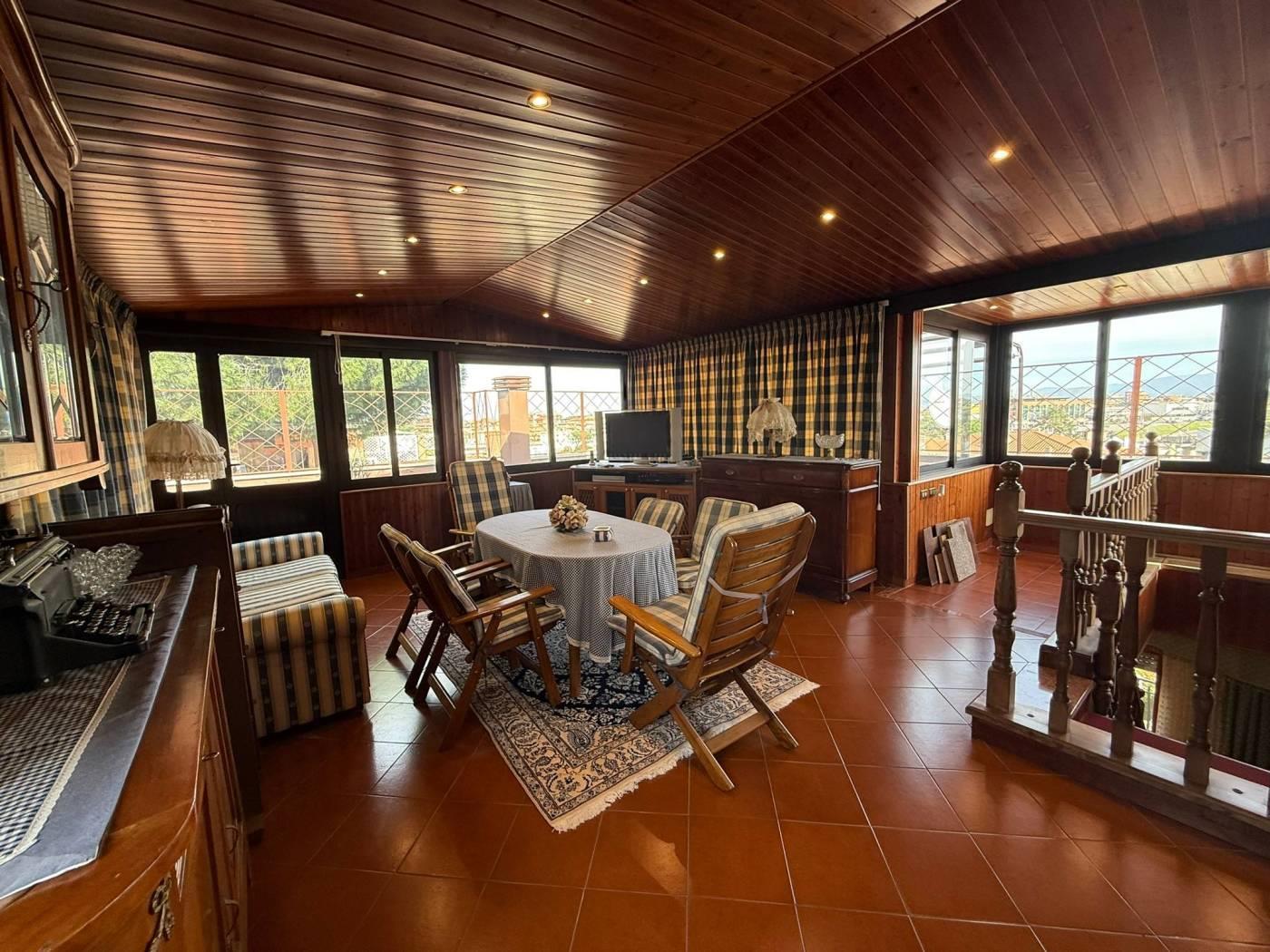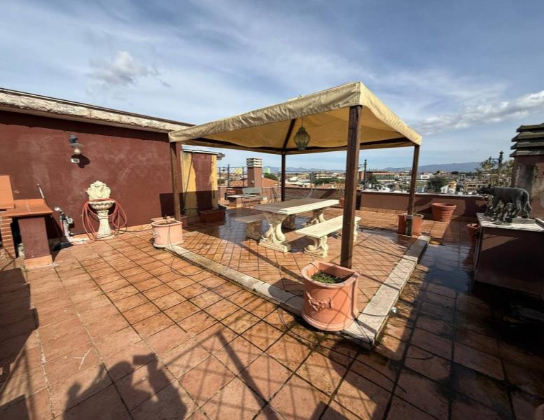 Dal salone, tramite una comoda scala interna, si accede al piano superattico, oggi organizzato come raffinata zona relax con soggiorno completamente vetrato e angolo cottura. L'ambiente, regolarmente condonato e impreziosito da dettagli in legno, si apre su un ulteriore terrazzo attrezzato con area barbecue completa di forno in muratura, fontana, gazebo e splendida vista panoramica. Una scala a chiocciola esterna collega questo livello al terrazzo sottostante, creando continuità e funzionalità tra i due piani.