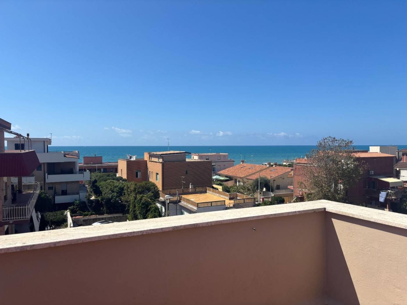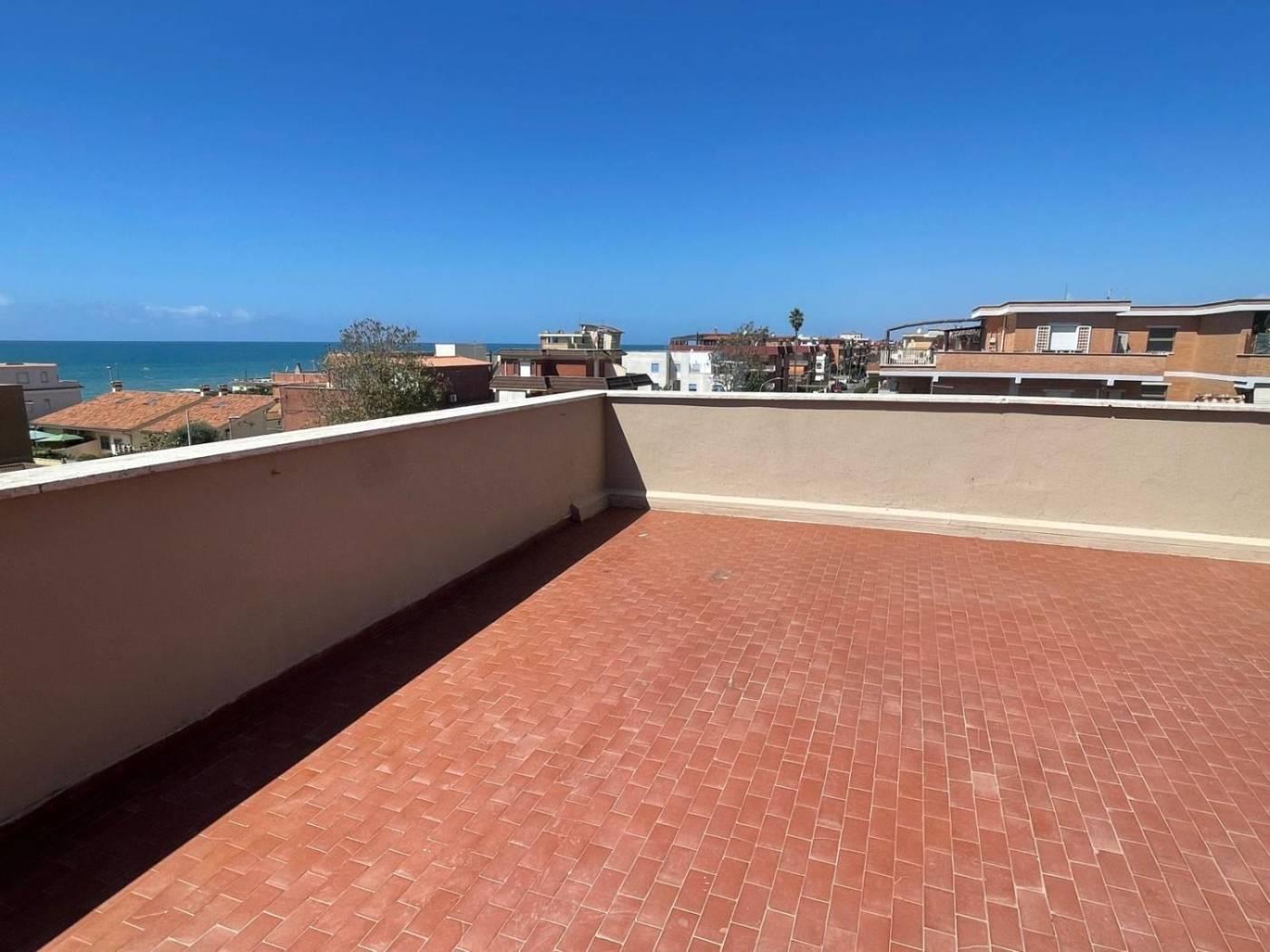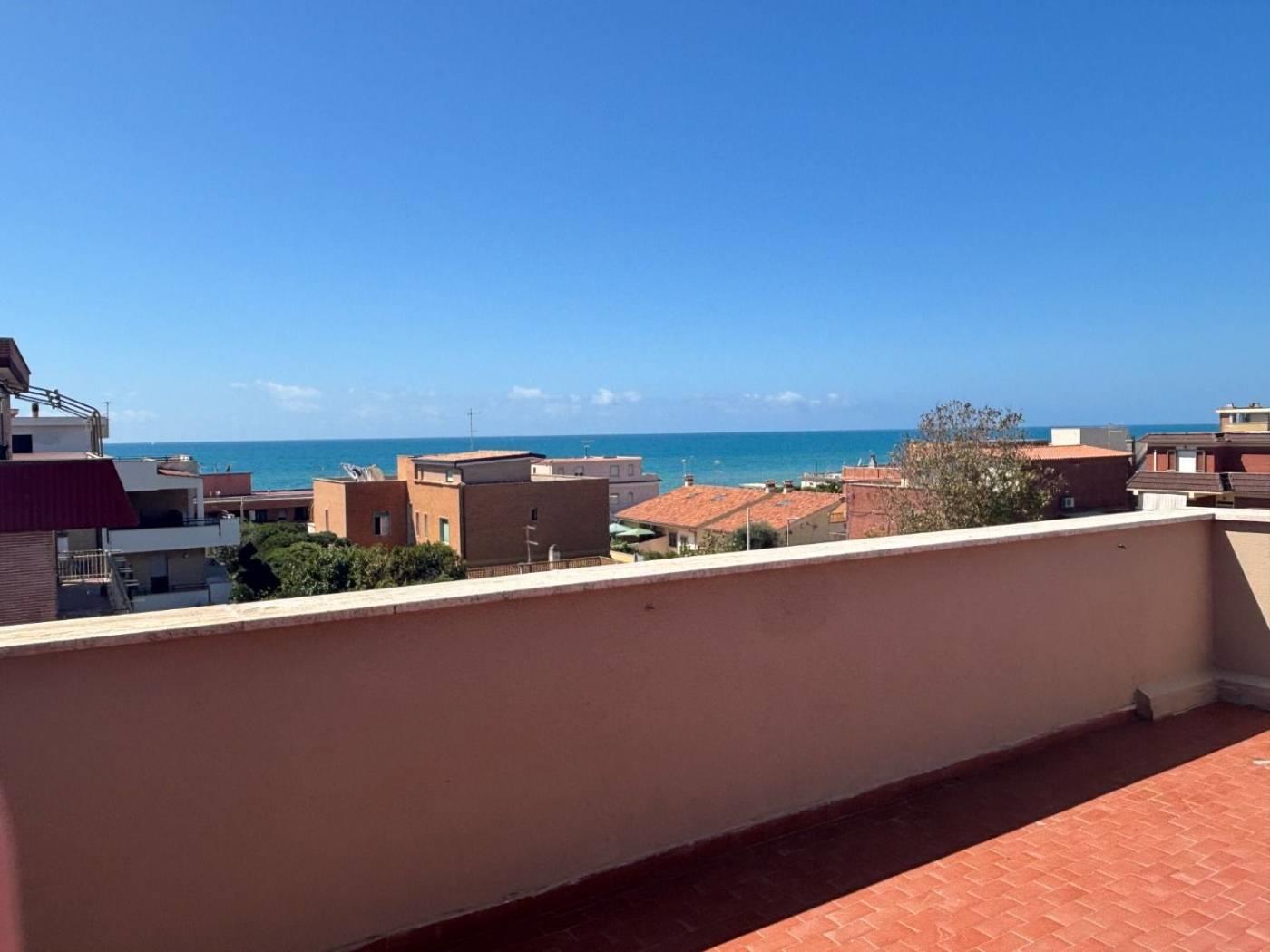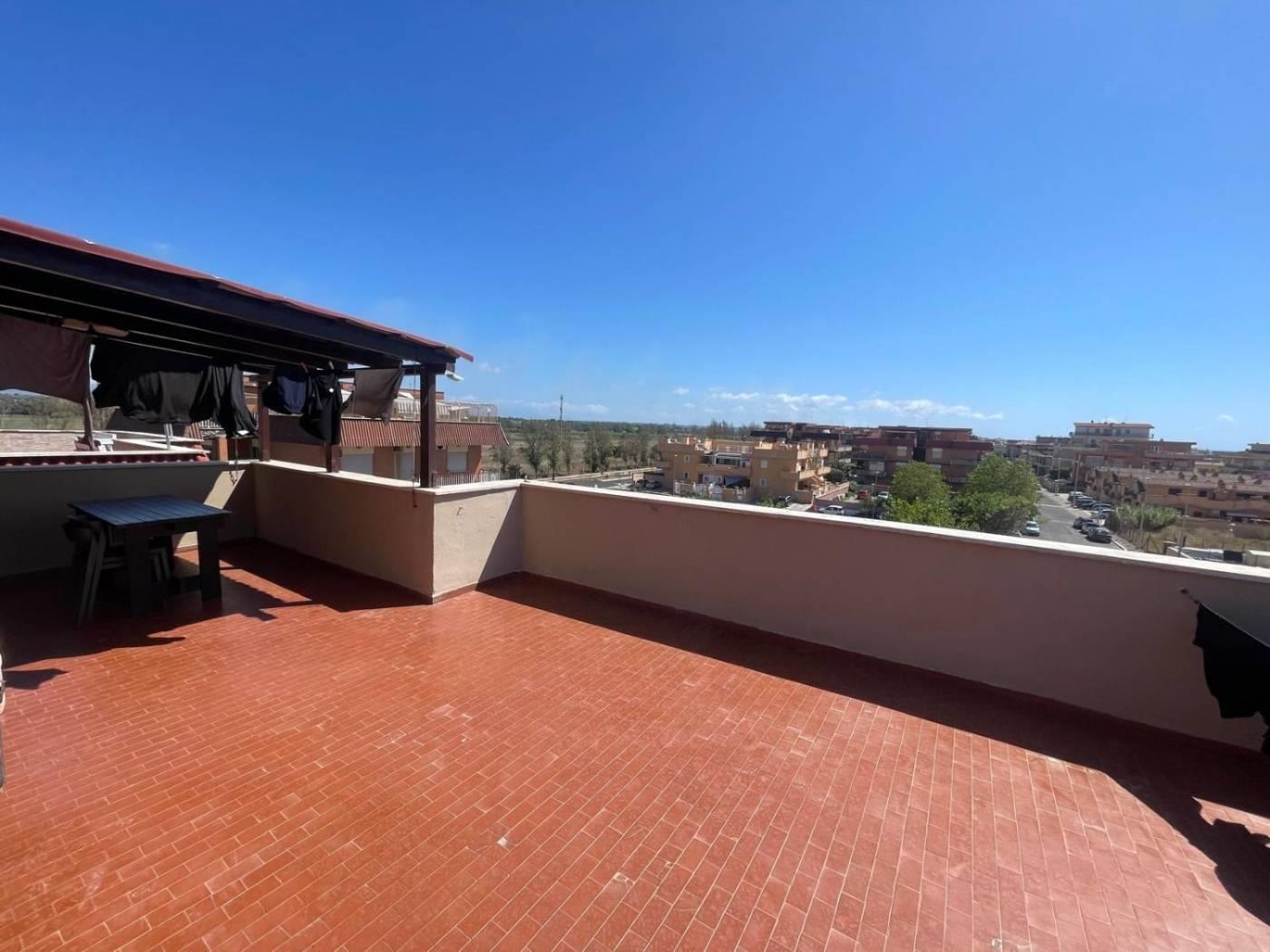 Torvaianica, precisamente in Via Svezia, attico, posto al terzo piano, con splendida vista mare e grande terrazzo panoramico, composto da ampio salone luminoso, cucina abitabile, entrambe con porta finestra che da accesso al terrazzo, camera matrimoniale e servizio finestrato con box doccia in muratura. Completa la proprietà un posto auto condominiale assegnato. Sul terrazzo è presente una tettoia in legno.
