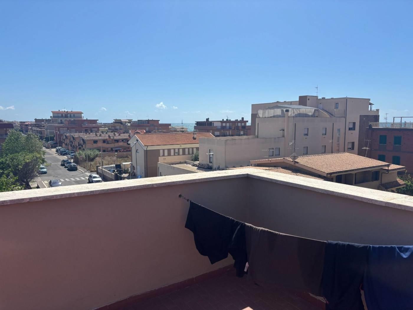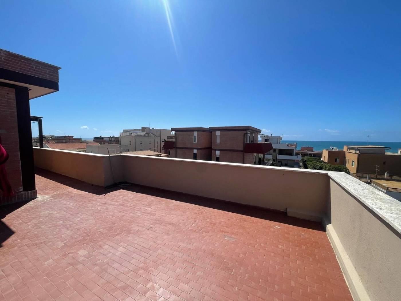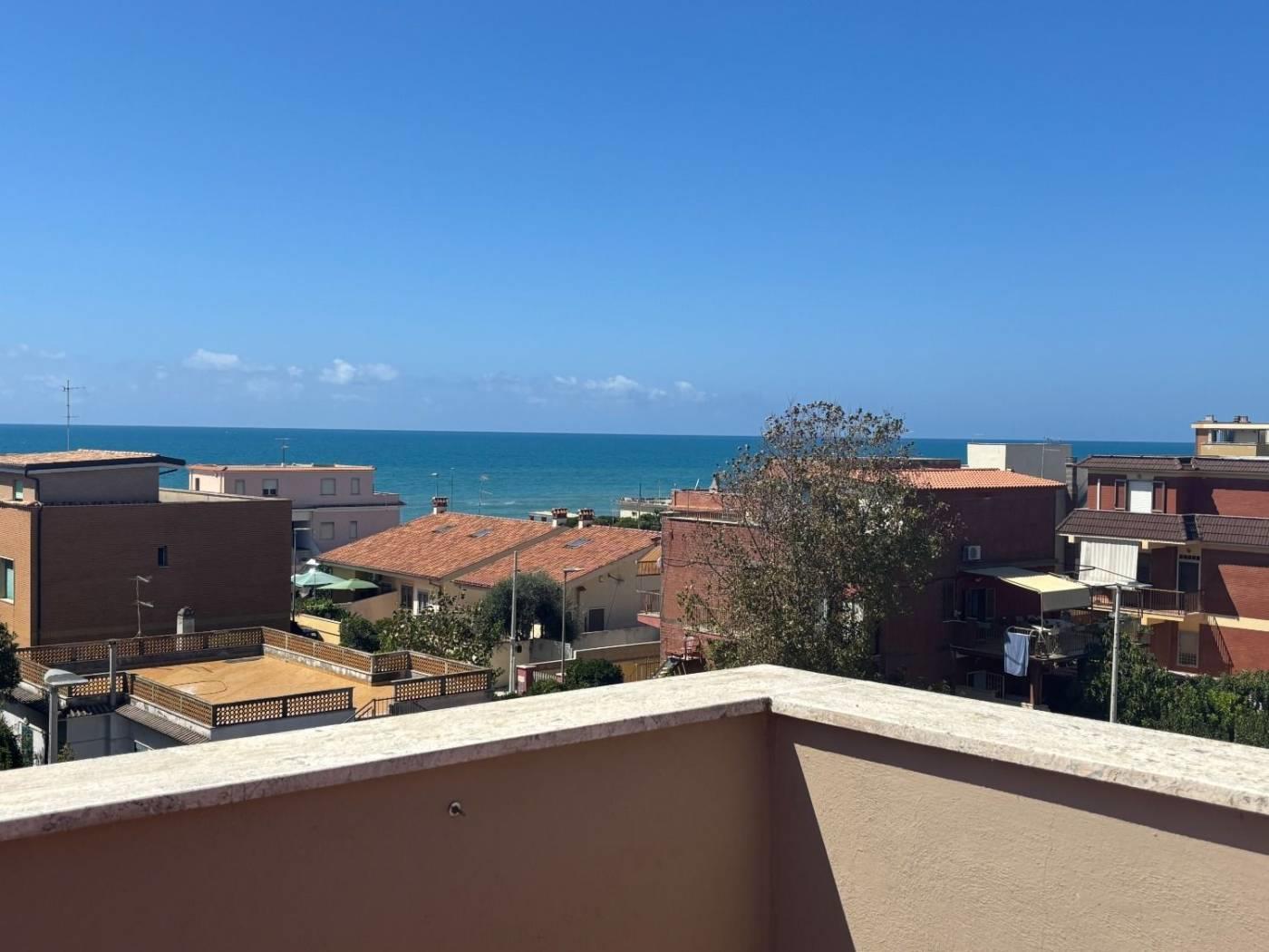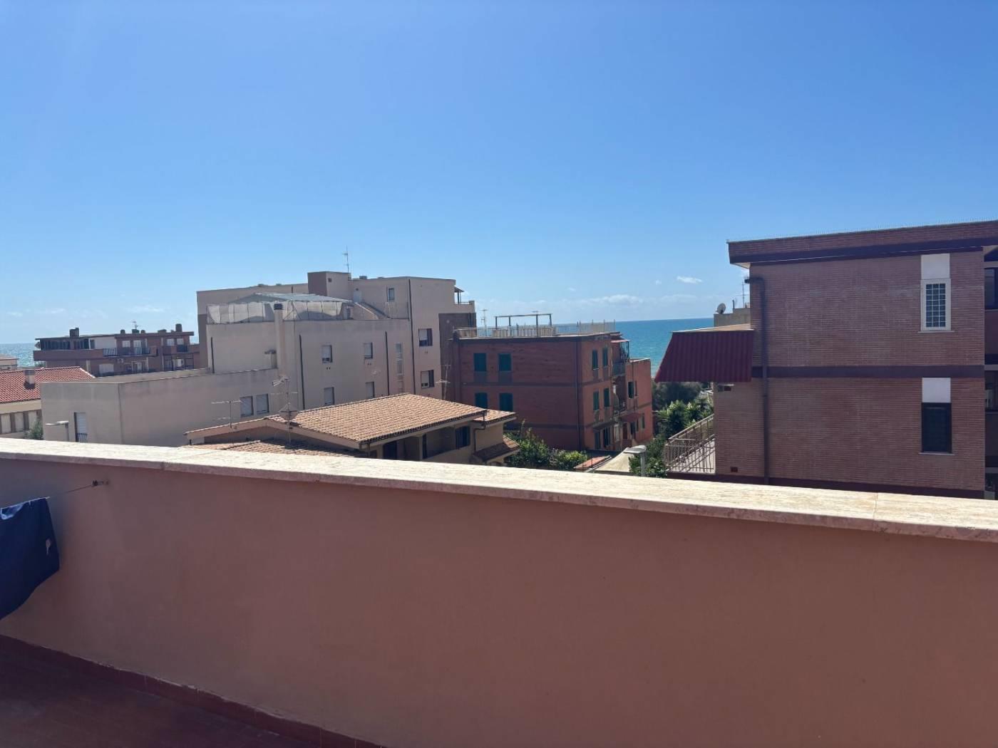 Torvaianica, precisamente in Via Svezia, attico, posto al terzo piano, con splendida vista mare e grande terrazzo panoramico, composto da ampio salone luminoso, cucina abitabile, entrambe con porta finestra che da accesso al terrazzo, camera matrimoniale e servizio finestrato con box doccia in muratura. Completa la proprietà un posto auto condominiale assegnato. Sul terrazzo è presente una tettoia in legno.