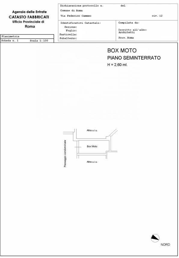 Dire immobiliare propone in locazione box moto di circa 6,40 mq all'interno di un'autorimessa di nuova costruzione con accesso indipendente in prossimità di via Aurelia ed uscita in via Federico Cammeo n.12 mediante cancello automatico.