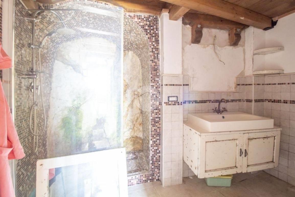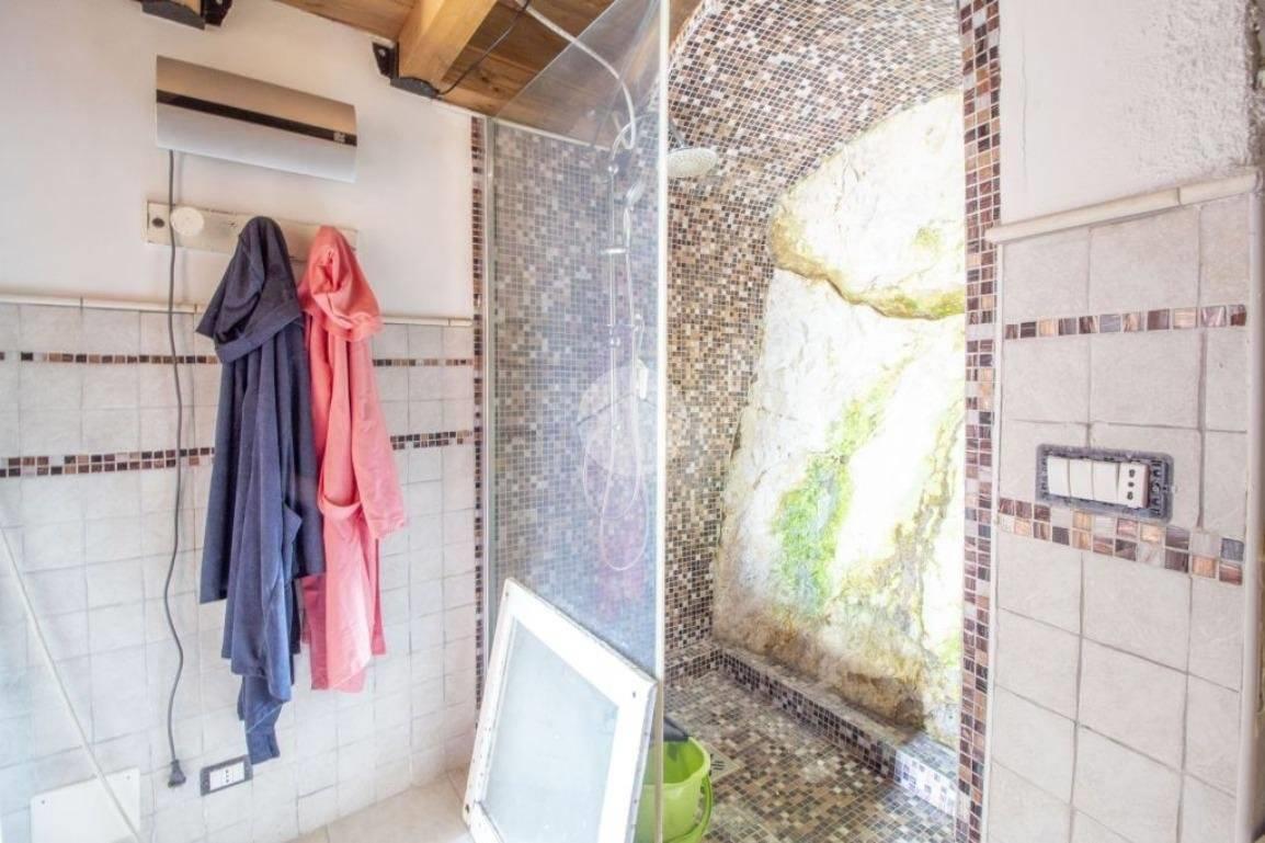 Gli interni uniscono tradizione e carattere: le pareti in pietra a vista conferiscono calore e autenticità, mentre nella zona bagno spicca una doccia unica, con parete in sassi naturali ed effetto cascata, per un’esperienza di relax.