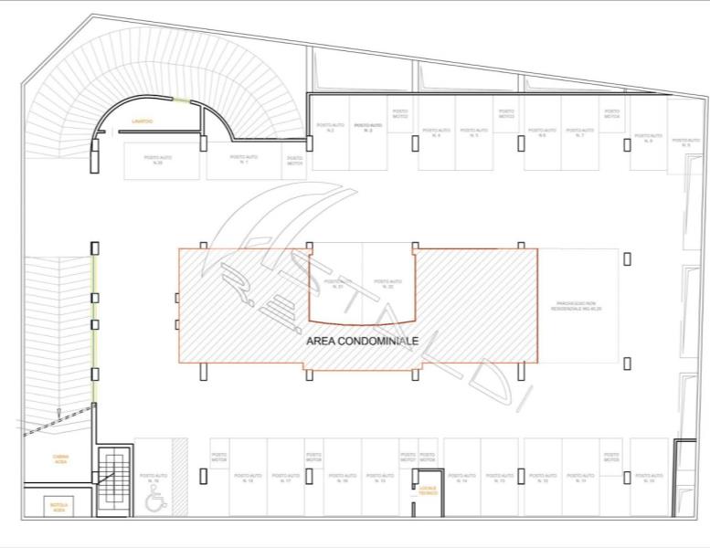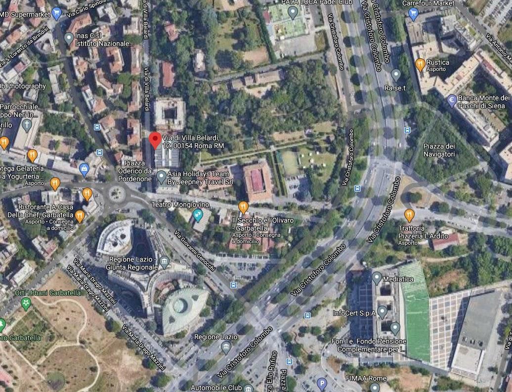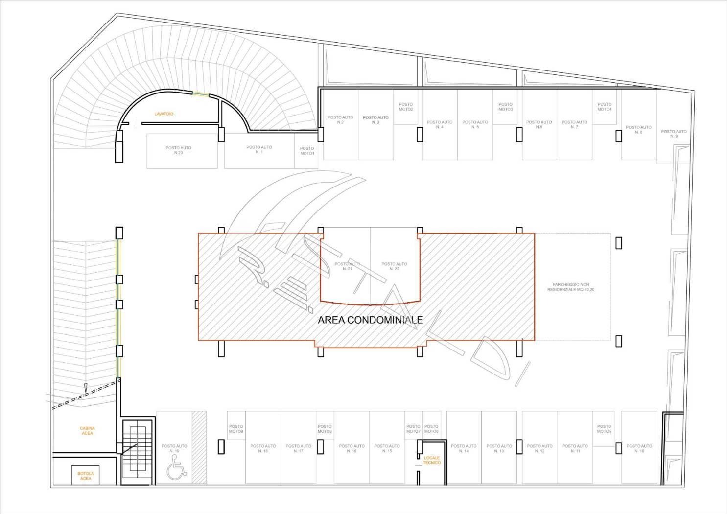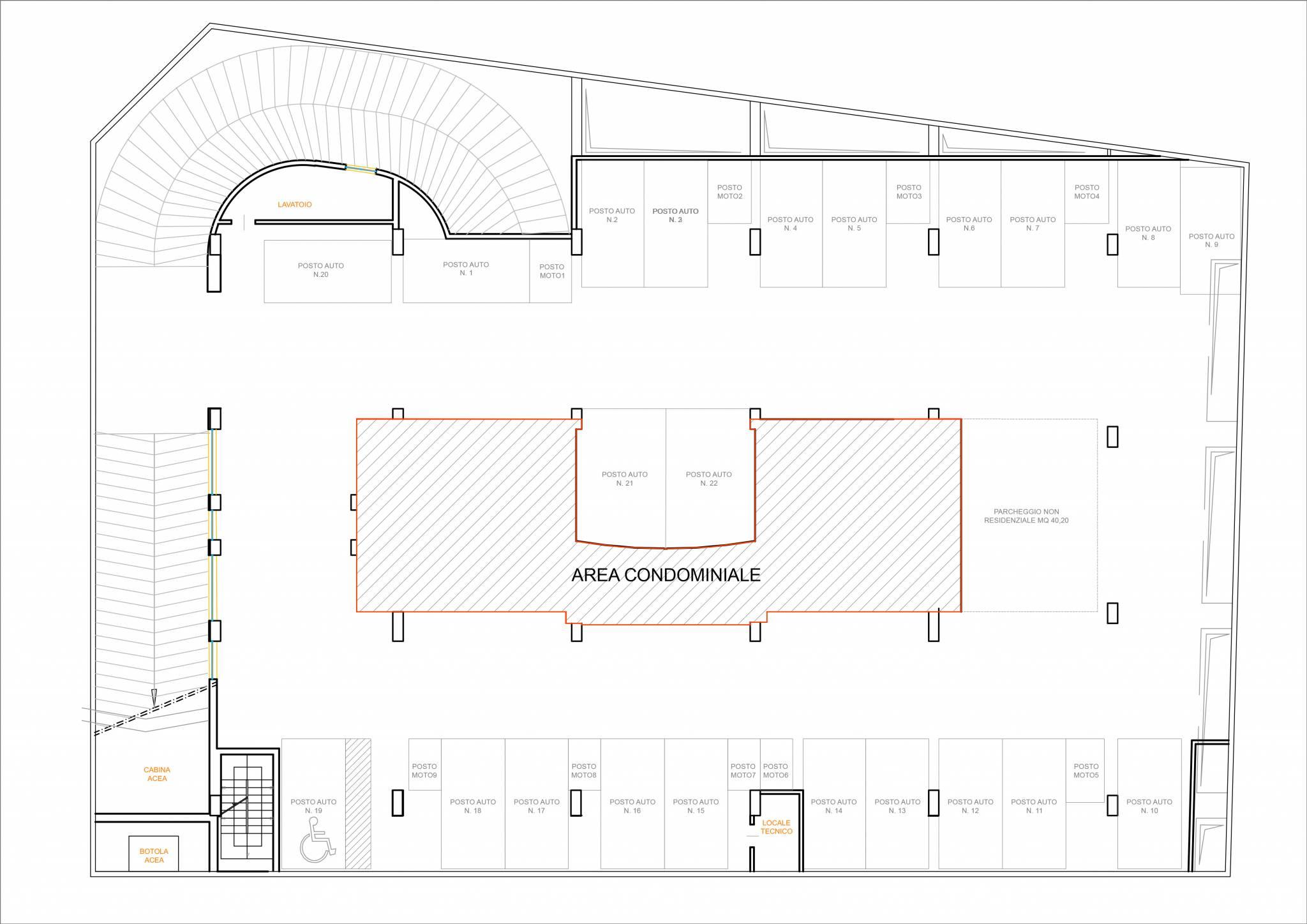 Colombo, altezza palazzo della Regione Lazio, il piano interrato primo con accesso carrabile dalla rampa ha una superficie complessiva di mq 950 con 25 posti auto.